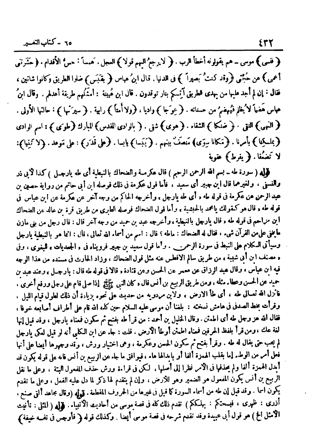 قَالَ عِكْرِمَة وَالضَّحَّاك بالنبطية أَي طه يَا رَجُلُ كَذَا لِأَبِي ذَرٍّ وَالنَّسَفِيِّ وَلِغَيْرِهِمَا قَالَ بن جُبَيْرٍ أَيْ سَعِيدٍ فَأَمَّا قَوْلُ عِكْرِمَةَ فِي ذَلِك فوصله بن أَبِي حَاتِمٍ مِنْ رِوَايَةِ حُصَيْنِ بْنِ عَبْدِ الرَّحْمَنِ عَنْ عِكْرِمَةَ فِي قَوْلِهِ طَهَ أَيْ طَهَ يَا رَجُلُ وَأَخْرَجَهُ الْحَاكِمُ مِنْ وَجْهٍ آخر عَن عِكْرِمَة عَن بن عَبَّاسٍ فِي قَوْلِهِ طَهَ قَالَ هُوَ كَقَوْلِكَ يَا مُحَمَّدُ بِالْحَبَشِيَّةِ وَأَمَّا قَوْلُ الضَّحَّاكِ فَوَصَلَهُ الطَّبَرِيُّ مِنْ طَرِيقِ قُرَّةِ بْنِ خَالِدٍ عَنِ الضَّحَّاكِ بْنِ مُزَاحِمٍ فِي قَوْلِهِ طَهَ قَالَ يَا رَجُلُ بِالنَّبَطِيَّةِ وَأَخْرَجَهُ عَبْدُ بْنُ حُمَيْدٍ مِنْ وَجْهٍ آخَرَ قَالَ قَالَ رَجُلٌ مِنْ بَنِي مَازِنٍ مَا يَخْفَى عَلَيَّ مِنَ الْقُرْآنِ شَيْءٌ فَقَالَ لَهُ الضَّحَّاكُ مَا طَهَ قَالَ اسْمٌ مِنْ أَسْمَاءِ اللَّهِ تَعَالَى قَالَ إِنَّمَا هُوَ بِالنَّبَطِيَّةِ يَا رَجُلُ وَسَيَأْتِي الْكَلَامُ عَلَى النَّبَطِ فِي سُورَةِ الرَّحْمَنِ وَأَمَّا قَوْلُ سَعِيدِ بْنِ جُبَيْرٍ فَرَوَيْنَاهُ فِي الْجَعْدِيَّاتِ لِلْبَغَوِيِّ وَفِي مُصَنف بن أَبِي شَيْبَةَ مِنْ طَرِيقِ سَالِمِ الْأَفْطَسِ عَنْهُ مِثْلُ قَوْلِ الضَّحَّاكِ وَزَادَ الْحَارِثُ فِي مُسْنَدِهِ من هَذَا الْوَجْه فِيهِ بن عَبَّاسٍ وَقَالَ عَبْدُ الرَّزَّاقِ عَنْ مَعْمَرٍ عَنِ الْحَسَنِ وَعَنْ قَتَادَةَ قَالَا فِي قَوْلِهِ طَهَ قَالَ يارجل وَعِنْدَ عَبْدِ بْنِ حُمَيْدٍ عَنِ الْحَسَنِ وَعَطَاءٍ مِثْلِهِ وَمِنْ طَرِيقِ الرَّبِيعِ بْنِ أَنَسٌ قَالَ كَانَ النَّبِيُّ صَلَّى اللَّهُ عَلَيْهِ وَسَلَّمَ إِذَا صَلَّى قَامَ عَلَى رِجْلٍ وَرَفَعَ أُخْرَى فَأَنْزَلَ اللَّهُ تَعَالَى طَهَ أَيْ طَأِ الْأَرْضَ وَلِابْنِ مَرْدَوَيْهِ مِنْ حَدِيثِ عَلِيٍّ نَحْوَهُ بِزِيَادَةِ أَنَّ ذَلِكَ لِطُولِ قِيَامِ اللَّيْلِ وَقَرَأْتُ بِخَطِّ الصَّدَفِيِّ فِي هَامِشِ نُسْخَتِهِ بَلَغَنَا أَنَّ مُوسَى عَلَيْهِ السَّلَامُ حِينَ كَلَّمَهُ اللَّهُ قَامَ عَلَى أَطْرَافِ أَصَابِعِهِ خَوْفًا فَقَالَ اللَّهُ عَزَّ وَجَلَّ طَهَ أَيِ اطْمَئِنَّ وَقَالَ الْخَلِيلُ بْنُ أَحْمَدَ مَنْ قَرَأَ طَهَ بِفَتْحٍ ثُمَّ سُكُونٍ فَمَعْنَاهُ يَا رَجُلُ وَقَدْ قِيلَ إِنَّهَا لُغَةُ عَكٍّ وَمَنْ قَرَأَ بِلَفْظ الحرفين فَمَعْنَاه اطمئن أوطأ الأَرْض قلت جَاءَ عَن بن الْكَلْبِيِّ أَنَّهُ لَوْ قِيلَ لِعَكِّيٍّ يَا رَجُلُ لَمْ يُجِبْ حَتَّى يُقَالَ لَهُ طَهَ وَقَرَأَ بِفَتْحٍ ثُمَّ سُكُونٍ الْحَسَنُ وَعِكْرِمَةُ وَهِيَ اخْتِيَارُ وَرْشٌ وَقَدْ وَجَّهُوهَا أَيْضًا عَلَى أَنَّهَا فِعْلُ أَمْرٍ مِنَ الْوَطْءِ إِمَّا بِقَلْبِ الْهَمْزَةِ أَلِفًا أَوْ بِإِبْدَالِهَا هَاءً فَيُوَافِقُ مَا جَاءَ عَنِ الرَّبِيعِ بْنِ أَنَسٍ فَإِنَّهُ عَلَى قَوْلِهِ يَكُونُ قَدْ أَبْدَلَ الْهَمْزَةَ أَلِفًا وَلَمْ يَحْذِفْهَا فِي الْأَمْرِ نَظَرًا إِلَى أَصْلِهَا لَكِنْ فِي قِرَاءَةِ وَرْشٍ حَذْفُ الْمَفْعُولِ الْبَتَّةَ وَعَلَى مَا نَقَلَ الرَّبِيعُ بْنُ أَنَسٍ يَكُونُ الْمَفْعُولُ هُوَ الضَّمِيرُ وَهُوَ لِلْأَرْضِ وَإِنْ لَمْ يَتَقَدَّمْ لَهَا ذِكْرٌ لِمَا دَلَّ عَلَيْهِ الْفِعْلُ وَعَلَى مَا تَقَدَّمَ يَكُونُ اسْمًا وَقَدْ قِيلَ إِنَّ طَهَ مِنْ أَسْمَاءِ السُّورَةِ كَمَا قِيلَ فِي غَيْرِهَا مِنَ الْحُرُوفِ الْمُقَطَّعَةِ قَوْلُهُ وَقَالَ مُجَاهِدٌ أَلْقَى صَنَعَ أَزْرِي ظَهْرِي فَيُسْحِتَكُمْ يُهْلِكَكُمْ تَقَدَّمَ ذَلِكَ كُلُّهُ فِي قِصَّةِ مُوسَى مِنْ أَحَادِيثِ الْأَنْبِيَاءِ قَوْلُهُ الْمُثْلَى تَأْنِيثُ الْأَمْثَلِ إِلَخْ هُوَ قَوْلُ أَبِي عُبَيْدَةَ وَقَدْ تَقَدَّمَ شَرْحُهُ فِي قِصَّة