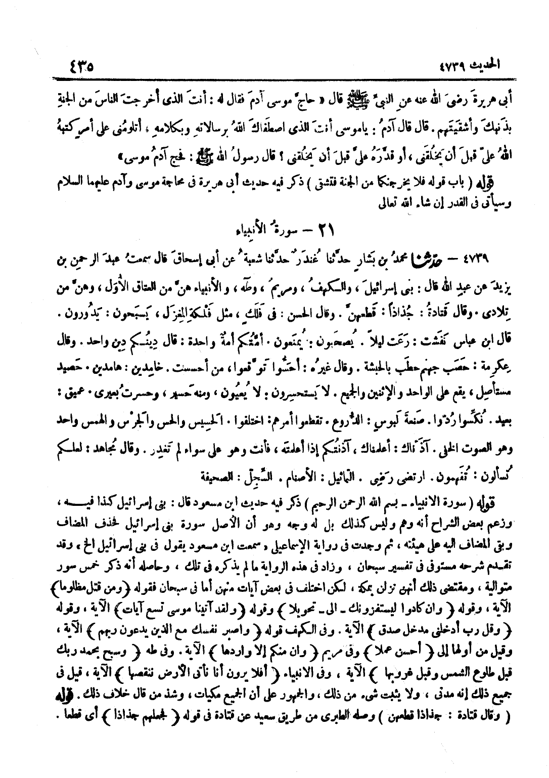 ذَكَرَ فِيهِ حَدِيثَ أَبِي هُرَيْرَةَ فِي مُحَاجَّةِ مُوسَى وَآدَمَ عَلَيْهِمَا السَّلَامُ وَسَيَأْتِي فِي الْقَدَرِ إِن شَاءَ الله تَعَالَى قَوْلُهُ سُورَةُ الْأَنْبِيَاءِ بِسْمِ اللَّهِ الرَّحْمَنِ الرَّحِيمِ ذكر فِيهِ حَدِيث بن مَسْعُودٍ قَالَ بَنِي إِسْرَائِيلَ كَذَا فِيهِ وَزَعَمَ بَعْضُ الشُّرَّاحِ أَنَّهُ وَهَمٌ وَلَيْسَ كَذَلِكَ بَلْ لَهُ وَجْهٌ وَهُوَ أَنَّ الْأَصْلَ سُورَةُ بَنِي إِسْرَائِيلَ فَحُذِفَ الْمُضَافُ وَبَقِيَ الْمُضَافُ إِلَيْهِ عَلَى هَيْئَتِهِ ثُمَّ وَجَدْتُ فِي رِوَايَةِ الْإِسْمَاعِيلِيِّ سَمِعْتُ بن مَسْعُودٍ يَقُولُ فِي بَنِي إِسْرَائِيلَ إِلَخْ وَقَدْ تَقَدَّمَ شَرْحُهُ مُسْتَوْفًى فِي تَفْسِيرِ سُبْحَانَ وَزَادَ فِي هَذِهِ الرِّوَايَةِ مَا لَمْ يَذْكُرُهُ فِي تِلْكَ وَحَاصِلُهُ أَنَّهُ ذَكَرَ خَمْسَ سُوَرٍ مُتَوَالِيَةٍ وَمُقْتَضَى ذَلِكَ أَنَّهُنَّ نَزَلْنَ بِمَكَّةَ لَكِنِ اخْتُلِفَ فِي بَعْضِ آيَاتٍ مِنْهُنَّ أَمَّا فِي سُبْحَانَ فَقَوله وَمن قتل مَظْلُوما الْآيَة وَقَوله وان كَادُوا ليستفزونك إِلَى تَحْوِيلًا وَقَوْلُهُ وَلَقَدْ آتَيْنَا مُوسَى تِسْعَ آيَات الْآيَةَ وَقَوْلُهُ وَقُلْ رَبِّ أَدْخِلْنِي مُدْخَلَ صِدْقٍ الْآيَةَ وَفِي الْكَهْفِ قَوْلُهُ وَاصْبِرْ نَفْسَكَ مَعَ الَّذين يدعونَ رَبهم الْآيَةَ وَقِيلَ مِنْ أَوَّلِهَا إِلَى أَحْسَنُ عَمَلًا وَفِي مَرْيَم وَإِن مِنْكُم إِلَّا واردها الْآيَةَ وَفِي طَهَ وَسَبِّحْ بِحَمْدِ رَبِّكَ قَبْلَ طُلُوعِ الشَّمْسِ وَقَبْلَ غُرُوبهَا الْآيَةَ وَفِي الْأَنْبِيَاءِ أَفَلَا يَرَوْنَ أَنَّا نَأْتِي الأَرْض ننقصها الْآيَةَ قِيلَ فِي جَمِيعِ ذَلِكَ إِنَّهُ مَدَنِيٌّ وَلَا يَثْبُتُ شَيْءٌ مِنْ ذَلِكَ وَالْجُمْهُورُ عَلَى أَنَّ الْجَمِيعَ مَكِّيَّاتٌ وَشَذَّ مَنْ قَالَ خِلَافَ ذَلِكَ قَوْلُهُ وَقَالَ قَتَادَةُ جُذَاذًا قَطَّعَهُنَّ وَصَلَهُ الطَّبَرِيُّ مِنْ طَرِيقِ سَعِيدٍ عَنْ قَتَادَةَ فِي قَوْله فجعلهم جذاذا أَي قطعا