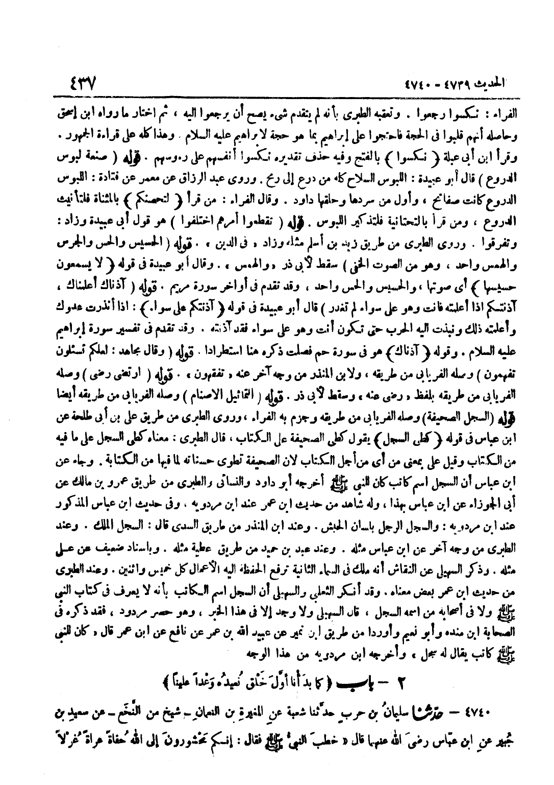 الْفَرَّاءُ نُكِسُوا رَجَعُوا وَتَعَقَّبَهُ الطَّبَرِيُّ بِأَنَّهُ لَمْ يَتَقَدَّمْ شَيْءٌ يَصِحُّ أَنْ يَرْجِعُوا إِلَيْهِ ثُمَّ أخْتَار مَا رَوَاهُ بن إِسْحَاقَ وَحَاصِلُهُ أَنَّهُمْ قُلِبُوا فِي الْحُجَّةِ فَاحْتَجُّوا عَلَى إِبْرَاهِيمَ بِمَا هُوَ حُجَّةٌ لِإِبْرَاهِيمَ عَلَيْهِ السَّلَامُ وَهَذَا كُلُّهُ عَلَى قِرَاءَةِ الْجُمْهُورِ وَقَرَأَ بن أَبِي عَبْلَةَ نَكَسُوا بِالْفَتْحِ وَفِيهِ حَذْفٌ تَقْدِيرُهُ نكسوا أنفسهم على رؤوسهم قَوْلُهُ صَنْعَةَ لَبُوسٍ الدُّرُوعُ قَالَ أَبُو عُبَيْدَةَ اللَّبُوسُ السِّلَاحُ كُلُّهُ مِنْ دِرْعٍ إِلَى رُمْحٍ وَرَوَى عَبْدُ الرَّزَّاقِ عَنْ مَعْمَرٍ عَنْ قَتَادَةَ اللَّبُوسُ الدُّرُوعُ كَانَتْ صَفَائِحَ وَأَوَّلُ مَنْ سَرَدَهَا وَحَلَّقَهَا دَاوُدُ وَقَالَ الْفَرَّاءُ مَنْ قَرَأَ لِتُحْصِنَكُمْ بِالْمُثَنَّاةِ فَلِتَأْنِيثِ الدُّرُوعِ وَمَنْ قَرَأَ بِالتَّحْتَانِيَّةِ فَلِتَذْكِيرِ اللَّبُوسِ قَوْلُهُ تَقَطَّعُوا أَمْرَهُمُ اخْتَلَفُوا هُوَ قَوْلُ أَبِي عُبَيْدَةَ وَزَادَ وَتَفَرَّقُوا وَرَوَى الطَّبَرِيُّ مِنْ طَرِيقِ زَيْدِ بْنِ أَسْلَمَ مِثْلَهُ وَزَادَ فِي الدِّينِ قَوْلُهُ الْحَسِيسُ وَالْحِسُّ وَالْجَرْسُ وَالْهَمْسُ وَاحِدٌ وَهُوَ مِنَ الصَّوْتِ الْخَفِيِّ سَقَطَ لِأَبِي ذَرٍّ وَالْهَمْسُ وَقَالَ أَبُو عُبَيْدَةَ فِي قَوْلِهِ لَا يسمعُونَ حَسِيسهَا أَيْ صَوْتَهَا وَالْحَسِيسُ وَالْحِسُّ وَاحِدٌ وَقَدْ تَقَدَّمَ فِي أَوَاخِرِ سُورَةِ مَرْيَمَ قَوْلُهُ آذَنَّاكَ أَعْلَمْنَاكَ آذَنْتُكُمْ إِذَا أَعْلَمْتُهُ فَأَنْتَ وَهُوَ عَلَى سَوَاءٍ لَمْ تَغْدِرْ قَالَ أَبُو عُبَيْدَةَ فِي قَوْلِهِ آذنتكم على سَوَاء إِذَا أَنْذَرْتُ عَدُوَّكَ وَأَعْلَمْتُهُ ذَلِكَ وَنَبَذْتُ إِلَيْهِ الْحَرْبَ حَتَّى تَكُونَ أَنْتَ وَهُوَ عَلَى سَوَاءٍ فَقَدْ آذَنْتَهُ وَقَدْ تَقَدَّمَ فِي تَفْسِيرِ سُورَةِ إِبْرَاهِيمَ عَلَيْهِ السَّلَامُ وَقَوْلُهُ آذَنَّاكَ هُوَ فِي سُورَةِ حم فُصِّلَتْ ذَكَرَهُ هُنَا اسْتِطْرَادًا قَوْلُهُ وَقَالَ مُجَاهِد لَعَلَّكُمْ تسئلون تُفْهَمُونَ وَصَلَهُ الْفِرْيَابِيُّ مِنْ طَرِيقِهِ وَلِابْنِ الْمُنْذِرِ مِنْ وَجْهٍ آخَرَ عَنْهُ تُفْقَهُونَ قَوْلُهُ ارْتَضَى رَضِيَ وَصَلَهُ الْفِرْيَابِيُّ مِنْ طَرِيقِهِ بِلَفْظِ رَضِيَ عَنْهُ وَسَقَطَ لِأَبِي ذَرٍّ قَوْلُهُ التَّمَاثِيلُ الْأَصْنَامُ وَصَلَهُ الْفِرْيَابِيُّ مِنْ طَرِيقِهِ أَيْضًا قَوْلُهُ السِّجِلُّ الصَّحِيفَةُ وَصَلَهُ الْفِرْيَابِيُّ مِنْ طَرِيقِهِ وَجَزَمَ بِهِ الْفَرَّاءُ وَرَوَى الطَّبَرِيُّ مِنْ طَرِيقِ عَلِيِّ بْنِ أَبِي طَلْحَةَ عَنِ بْنِ عَبَّاسٍ فِي قَوْلِهِ كطي السّجل يَقُولُ كَطَيِّ الصَّحِيفَةِ عَلَى الْكِتَابِ قَالَ الطَّبَرِيُّ مَعْنَاهُ كَطَيِّ السِّجِلِّ عَلَى مَا فِيهِ مِنَ الْكِتَابِ وَقِيلَ عَلَى بِمَعْنَى مِنْ أَيْ مِنْ أَجْلِ الْكِتَابِ لِأَنَّ الصَّحِيفَةَ تَطْوِي حَسَنَاتَهُ لِمَا فِيهَا من الْكِتَابَة وَجَاء عَن بن عَبَّاسٍ أَنَّ السِّجِلَّ اسْمُ كَاتِبٍ كَانَ لِلنَّبِيِّ صَلَّى اللَّهُ عَلَيْهِ وَسَلَّمَ أَخْرَجَهُ أَبُو دَاوُدَ وَالنَّسَائِيُّ وَالطَّبَرِيُّ مِنْ طَرِيقِ عَمْرِو بْنِ مَالِكٍ عَنْ أَبِي الجوزاء عَن بن عَبَّاس بِهَذَا وَله شَاهد من حَدِيث بن عمر عِنْد بن مرْدَوَيْه وَفِي حَدِيث بن عَبَّاس الْمَذْكُور عِنْد بن مرْدَوَيْه والسجل الرجل بِلِسَان الْحَبَش وَعند بن الْمُنْذِرِ مِنْ طَرِيقِ السُّدِّيِّ قَالَ السِّجِلُّ الْمَلَكُ وَعند الطَّبَرِيّ من وَجه آخر عَن بن عَبَّاسٍ مِثْلُهُ وَعِنْدَ عَبْدِ بْنِ حُمَيْدٍ مِنْ طَرِيقِ عَطِيَّةَ مِثْلُهُ وَبِإِسْنَادٍ ضَعِيفٍ عَنْ عَلِيٍّ مِثْلُهُ وَذَكَرَ السُّه