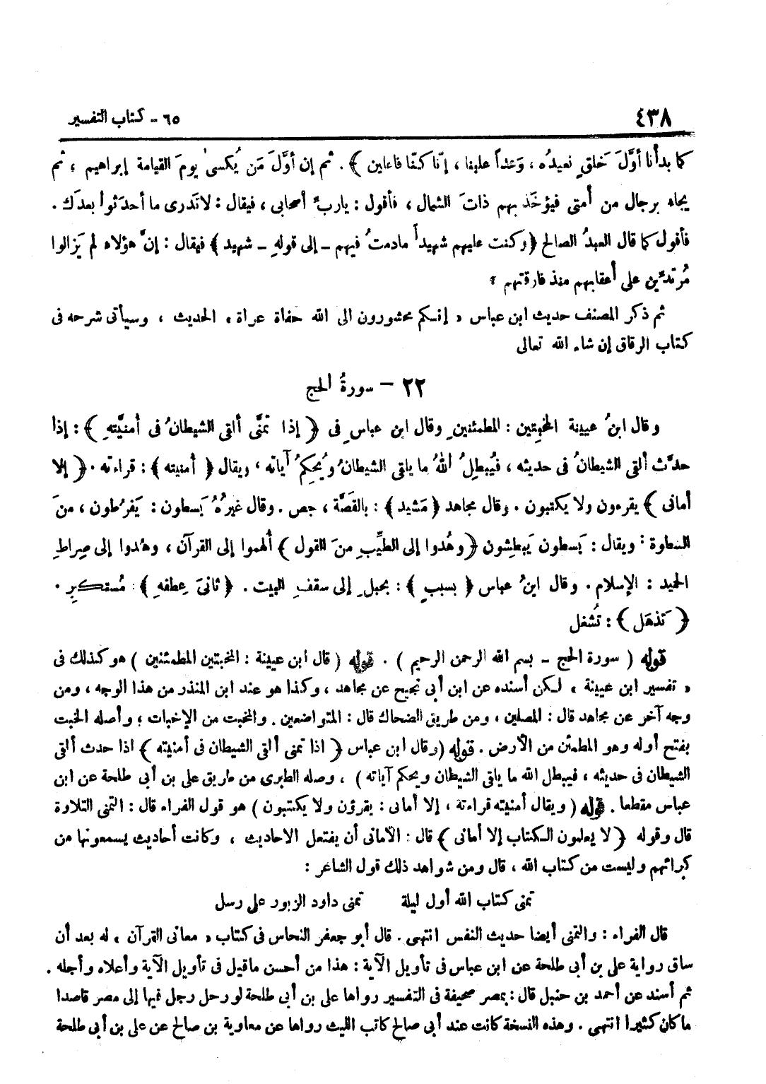 ثمَّ ذكر المُصَنّف حَدِيث بن عَبَّاسٍ إِنَّكُمْ مَحْشُورُونَ إِلَى اللَّهِ حُفَاةً عُرَاةً الْحَدِيثَ وَسَيَأْتِي شَرْحُهُ فِي كِتَابِ الرِّقَاقِ إِنْ شَاءَ اللَّهُ تَعَالَى قَوْلُهُ سُورَةُ الْحَجِّ بِسْمِ اللَّهِ الرَّحْمَنِ الرَّحِيمِ قَوْله قَالَ بن عُيَيْنَةَ الْمُخْبِتِينَ الْمُطْمَئِنِّينَ هُوَ كَذَلِكَ فِي تَفْسِيرِ بن عُيَيْنَة لَكِن اسنده عَن بن أَبِي نَجِيحٍ عَنْ مُجَاهِدٍ وَكَذَا هُوَ عِنْدَ بن الْمُنْذِرِ مِنْ هَذَا الْوَجْهِ وَمِنْ وَجْهٍ آخَرَ عَنْ مُجَاهِدٍ قَالَ الْمُصَلِّينَ وَمِنْ طَرِيقِ الضَّحَّاكِ قَالَ الْمُتَوَاضِعِينَ وَالْمُخْبِتُ مِنَ الْإِخْبَاتِ وَأَصْلُهُ الْخَبْتُ بِفَتْحِ أَوَّلِهِ وَهُوَ الْمُطْمَئِنُّ مِنَ الْأَرْضِ قَوْلُهُ وَقَالَ بن عَبَّاسٍ إِذَا تَمَنَّى أَلْقَى الشَّيْطَانُ فِي أُمْنِيَّتِهِ إِذَا حَدَّثَ أَلْقَى الشَّيْطَانُ فِي حَدِيثِهِ فَيُبْطِلُ اللَّهُ مَا يُلْقِي الشَّيْطَانُ وَيُحْكِمُ آيَاتِهِ وَصَلَهُ الطَّبَرِيُّ مِنْ طَرِيقِ عَلِيِّ بْنِ أَبِي طَلْحَةَ عَنِ بن عَبَّاسٍ مُقَطَّعًا قَوْلُهُ وَيُقَالُ أُمْنِيَتُهُ قِرَاءَتُهُ إِلَّا أماني يقرؤون وَلَا يَكْتُبُونَ هُوَ قَوْلُ الْفَرَّاءِ قَالَ التَّمَنِّي التِّلَاوَةُ قَالَ وَقَوْلُهُ لَا يَعْلَمُونَ الْكِتَابَ إِلَّا أماني قَالَ الْأَمَانِيُّ أَنْ يَفْتَعِلَ الْأَحَادِيثَ وَكَانَتْ أَحَادِيثُ يَسْمَعُونَهَا مِنْ كُبَرَائِهِمْ وَلَيْسَتْ مِنْ كِتَابِ اللَّهِ قَالَ وَمِنْ شَوَاهِدِ ذَلِكَ قَوْلُ الشَّاعِرِ تَمَنَّى كِتَابَ اللَّهِ أَوَّلَ لَيْلَةٍ تَمَنِّي دَاوُدَ الزَّبُورَ عَلَى رُسُلٍ قَالَ الْفَرَّاءُ وَالتَّمَنِّي أَيْضًا حَدِيثُ النَّفْسِ انْتَهَى قَالَ أَبُو جَعْفَرٍ النَّحَّاسُ فِي كِتَابِ مَعَانِي الْقُرْآنِ لَهُ بَعْدَ أَنْ سَاقَ رِوَايَة عَلِيِّ بْنِ أَبِي طَلْحَةَ عَنْ بْنِ عَبَّاسٍ فِي تَأْوِيلِ الْآيَةِ هَذَا مِنْ أَحْسَنِ مَا قِيلَ فِي تَأْوِيلِ الْآيَةِ وَأَعْلَاهُ وَأَجَلُّهُ ثُمَّ أَسْنَدَ عَنْ أَحْمَدَ بْنِ حَنْبَلٍ قَالَ بِمِصْرَ صَحِيفَةٌ فِي التَّفْسِيرِ رَوَاهَا عَلِيُّ بْنُ أَبِي طَلْحَةَ لَوْ رَحَلَ رَجُلٌ فِيهَا إِلَى مِصْرَ قَاصِدًا مَا كَانَ كَثِيرًا انْتَهَى وَهَذِهِ النُّسْخَةُ كَانَتْ عِنْدَ أَبِي صَالِحٍ كَاتِبُ اللَّيْثِ رَوَاهَا عَنْ مُعَاوِيَةَ بْنِ صَالِحٍ عَنْ عَلِيِّ بْنِ أَبِي طَلْحَة
