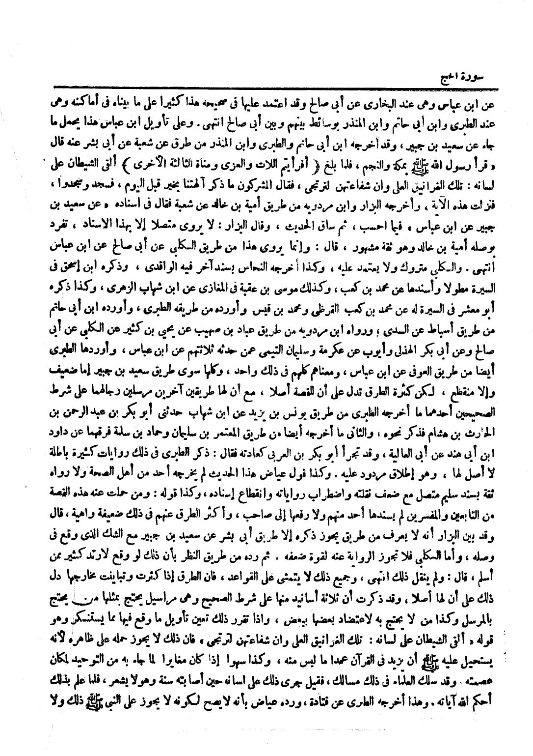 عَن بن عَبَّاسٍ وَهِيَ عِنْدَ الْبُخَارِيِّ عَنْ أَبِي صَالِحٍ وَقَدِ اعْتَمَدَ عَلَيْهَا فِي صَحِيحِهِ هَذَا كَثِيرًا عَلَى مَا بَيَّنَّاهُ فِي أَمَاكِنِهِ وَهِيَ عِنْدَ الطَّبَرِيّ وبن أبي حَاتِم وبن الْمُنْذِرِ بِوَسَائِطَ بَيْنَهُمْ وَبَيْنَ أَبِي صَالِحٍ انْتَهَى وعَلى تَأْوِيل بن عَبَّاسٍ هَذَا يُحْمَلُ مَا جَاءَ عَنْ سَعِيدِ بن جُبَير وَقد أخرجه بن أبي حَاتِم والطبري وبن الْمُنْذِرِ مِنْ طُرُقٍ عَنْ شُعْبَةَ عَنْ أَبِي بِشْرٍ عَنْهُ قَالَ قَرَأَ رَسُولُ اللَّهِ صَلَّى اللَّهُ عَلَيْهِ وَسَلَّمَ بِمَكَّةَ وَالنَّجْمُ فَلَمَّا بَلَغَ أَفَرَأَيْتُم اللات والعزى وَمَنَاة الثَّالِثَة الْأُخْرَى أَلْقَى الشَّيْطَانُ عَلَى لِسَانِهِ تِلْكَ الْغَرَانِيقُ الْعُلَى وَإِنَّ شَفَاعَتَهُنَّ لَتُرْتَجَى فَقَالَ الْمُشْرِكُونَ مَا ذَكَرَ آلِهَتَنَا بِخَيْرٍ قَبْلَ الْيَوْمَ فَسَجَدَ وَسَجَدُوا فَنَزَلَتْ هَذِه الْآيَة وَأخرجه الْبَزَّار وبن مَرْدَوَيْهِ مِنْ طَرِيقِ أُمَيَّةَ بْنِ خَالِدٍ عَنْ شُعْبَةَ فَقَالَ فِي إِسْنَادِهِ عَنْ سَعِيدِ بْنِ جُبَير عَن بن عَبَّاسٍ فِيمَا أَحْسَبُ ثُمَّ سَاقَ الْحَدِيثَ وَقَالَ الْبَزَّارُ لَا يُرْوَى مُتَّصِلًا إِلَّا بِهَذَا الْإِسْنَادِ تَفَرَّدَ بِوَصْلِهِ أُمَيَّةُ بْنُ خَالِدٍ وَهُوَ ثِقَةٌ مَشْهُورٌ قَالَ وَإِنَّمَا يُرْوَى هَذَا مِنْ طَرِيقِ الْكَلْبِيِّ عَنْ أَبِي صَالِحٍ عَنِ بن عَبَّاسٍ انْتَهَى وَالْكَلْبِيُّ مَتْرُوكٌ وَلَا يُعْتَمَدُ عَلَيْهِ وَكَذَا أَخْرَجَهُ النَّحَّاسُ بِسَنَدٍ آخَرَ فِيهِ الْوَاقِدِيُّ وَذكره بن إِسْحَاقَ فِي السِّيرَةِ مُطَوَّلًا وَأَسْنَدَهَا عَنْ مُحَمَّدِ بْنِ كَعْبٍ وَكَذَلِكَ مُوسَى بْنُ عُقْبَةَ فِي الْمَغَازِي عَن بن شِهَابٍ الزُّهْرِيِّ وَكَذَا ذَكَرَهُ أَبُو مَعْشَرٍ فِي السِّيرَةِ لَهُ عَنْ مُحَمَّدِ بْنِ كَعْبٍ الْقُرَظِيِّ وَمُحَمَّدِ بْنِ قَيْسٍ وَأَوْرَدَهُ مِنْ طَرِيقِهِ الطَّبَرِيُّ وَأوردهُ بن أَبِي حَاتِمٍ مِنْ طَرِيقِ أَسْبَاطٍ عَنِ السُّدِّيِّ وَرَوَاهُ بن مَرْدَوَيْهِ مِنْ طَرِيقِ عَبَّادِ بْنِ صُهَيْبٍ عَنْ يَحْيَى بْنِ كَثِيرٍ عَنِ الْكَلْبِيِّ عَنْ أَبِي صَالِحٍ وَعَنْ أَبِي بَكْرٍ الْهُذَلِيِّ وَأَيُّوبُ عَنْ عِكْرِمَةَ وَسُلَيْمَانُ التَّيْمِيِّ عَمَّنْ حَدَّثَهُ ثَلَاثَتُهُمْ عَنِ بن عَبَّاسٍ وَأَوْرَدَهَا الطَّبَرِيُّ أَيْضًا مِنْ طَرِيقِ الْعَوْفِيِّ عَن بن عَبَّاسٍ وَمَعْنَاهُمْ كُلُّهُمْ فِي ذَلِكَ وَاحِدٌ وَكُلُّهَا سِوَى طَرِيقِ سَعِيدِ بْنِ جُبَيْرٍ إِمَّا ضَعِيفٌ وَإِلَّا مُنْقَطِعٌ لَكِنْ كَثْرَةُ الطُّرُقِ تَدُلُّ عَلَى أَنَّ لِلْقِصَّةِ أَصْلًا مَعَ أَنَّ لَهَا طَرِيقَيْنِ آخَرَيْنِ مُرْسَلَيْنِ رِجَالُهُمَا عَلَى شَرْطِ الصَّحِيحَيْنِ أَحَدُهُمَا مَا أَخْرَجَهُ الطَّبَرِيُّ مِنْ طَرِيقِ يُونُسَ بْنِ يزِيد عَن بن شِهَابٍ حَدَّثَنِي أَبُو بَكْرِ بْنِ عَبْدِ الرَّحْمَنِ بْنِ الْحَارِثِ بْنِ هِشَامٍ فَذَكَرَ نَحْوَهُ وَالثَّانِي مَا أَخْرَجَهُ أَيْضًا مِنْ طَرِيقِ الْمُعْتَمِرِ بْنِ سُلَيْمَانَ وَحَمَّادِ بْنِ سَلَمَةَ فَرَّقَهُمَا عَنْ دَاوُدَ بْنِ أَبِي هِنْدٍ عَنْ أَبِي الْعَالِيَةِ وَقَدْ تَجَرَّأَ أَبُو بَكْرِ بْنِ الْعَرَبِيِّ كَعَادَتِهِ فَقَالَ ذَكَرَ الطَّبَرِيُّ فِي ذَلِكَ رِوَايَاتٌ كَثِيرَةٌ بَاطِلَةٌ لَا أَصْلَ لَهَا وَهُوَ إِطْلَاقٌ مَرْدُودٌ عَلَيْهِ وَكَذَا قَوْلُ عِيَاضٍ هَذَا الْحَدِيثُ لَمْ يُخَرِّجْهُ أَحَدٌ مِنْ أَهْلِ الصِّحَّةِ وَلَا رَوَاهُ ثِقَةٌ بِسَنَدٍ سَلِيمٍ مُتَّصِلٍ مَعَ ضَعْفِ نَقَلَتِهِ وَاضْطِرَابِ رِوَايَاتِهِ وَانْقِطَاعِ إِسْنَادِهِ وَكَذَا قَوْلُهُ وَمَنْ حُمِلَتْ عَنْهُ هَذِهِ الْقِصَّةُ مِنَ التَّابِعِ