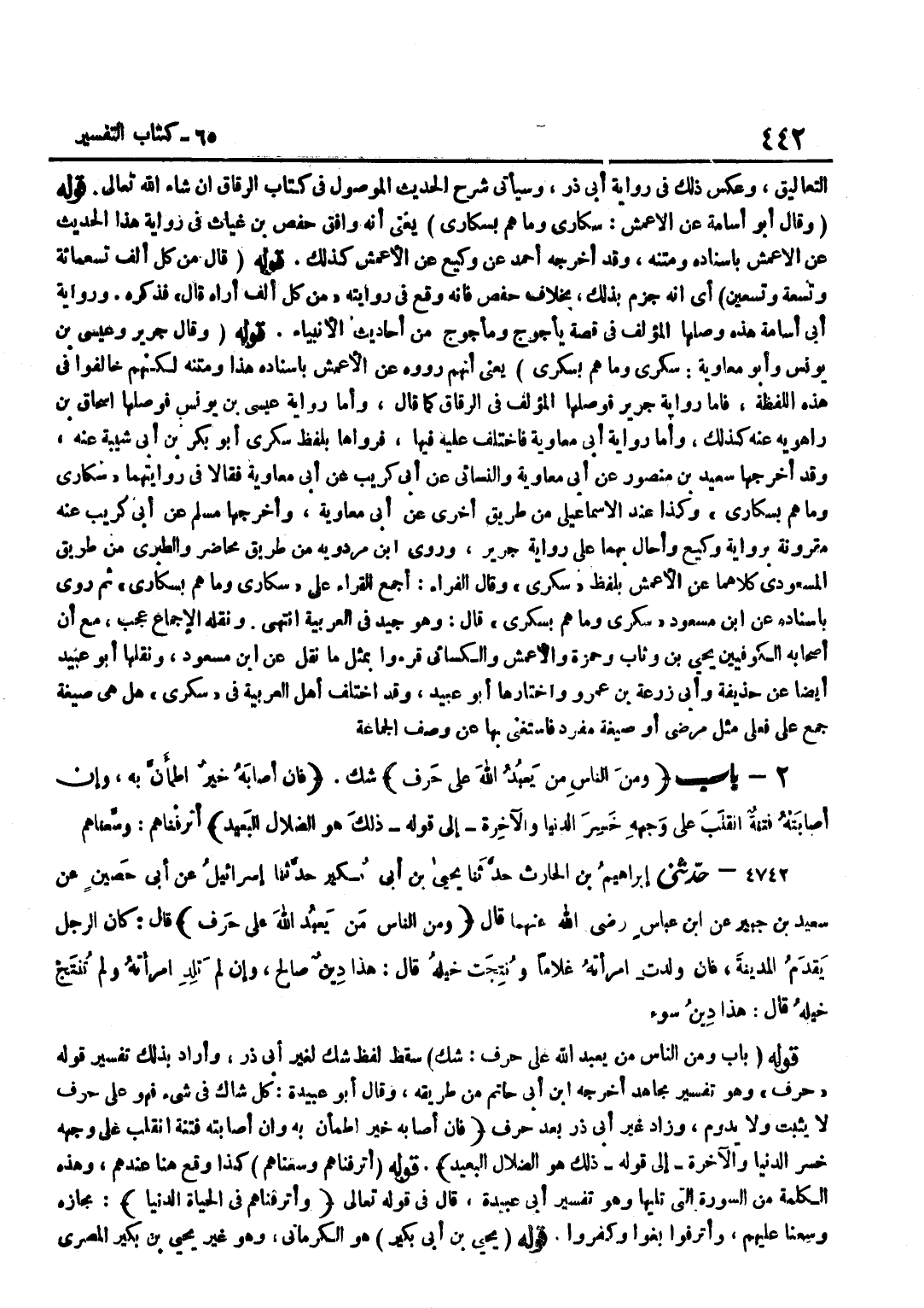[4741] قَوْلُهُ وَقَالَ أَبُو أُسَامَةَ عَنِ الْأَعْمَشِ سُكَارَى وَمَا هُمْ بِسُكَارَى يَعْنِي أَنَّهُ وَافَقَ حَفْصَ بْنَ غِيَاثٍ فِي رِوَايَةِ هَذَا الْحَدِيثِ عَنِ الْأَعْمَشِ بِإِسْنَادِهِ وَمَتْنِهِ وَقَدْ أَخْرَجَهُ أَحْمَدُ عَنْ وَكِيعٍ عَنِ الْأَعْمَشِ كَذَلِكَ قَوْلُهُ قَالَ مِنْ كُلِّ أَلْفٍ تِسْعَمِائَةٍ وَتِسْعَةً وَتِسْعِينَ أَيْ أَنَّهُ جَزَمَ بِذَلِكَ بِخِلَافِ حَفْصٍ فَإِنَّهُ وَقَعَ فِي رِوَايَتِهِ مِنْ كُلِّ أَلْفٍ أَرَاهُ قَالَ فَذَكَرَهُ وَرِوَايَةُ أَبِي أُسَامَةَ هَذِهِ وَصَلَهَا الْمُؤَلِّفُ فِي قِصَّةِ يَأْجُوجَ وَمَأْجُوجَ مِنْ أَحَادِيثِ الْأَنْبِيَاءِ قَوْلُهُ وَقَالَ جَرِيرٌ وَعِيسَى بْنُ يُونُسَ وَأَبُو مُعَاوِيَةَ سَكْرَى وَمَا هُمْ بِسَكْرَى يَعْنِي أَنَّهُمْ رَوَوْهُ عَنِ الْأَعْمَشِ بِإِسْنَادِهِ هَذَا وَمَتْنِهِ لَكِنَّهُمْ خَالَفُوا فِي هَذِهِ اللَّفْظَةِ فَأَمَّا رِوَايَةُ جَرِيرٍ فَوَصَلَهَا الْمُؤَلِّفُ فِي الرِّقَاقِ كَمَا قَالَ وَأَمَّا رِوَايَةُ عِيسَى بْنِ يُونُسَ فَوَصَلَهَا إِسْحَاقُ بْنُ رَاهْوَيْهِ عَنْهُ كَذَلِكَ وَأَمَّا رِوَايَةُ أَبِي مُعَاوِيَةَ فَاخْتُلِفَ عَلَيْهِ فِيهَا فَرَوَاهَا بلفط سكرى أَبُو بكر بن أَبِي شَيْبَةَ عَنْهُ وَقَدْ أَخْرَجَهَا سَعِيدُ بْنُ مَنْصُورٍ عَنْ أَبِي مُعَاوِيَةَ وَالنَّسَائِيِّ عَنْ أَبِي كُرَيْبٍ عَنْ أَبِي مُعَاوِيَةَ فَقَالَا فِي رِوَايَتِهِمَا سكارى وَمَا هم بسكارى وَكَذَا عِنْدَ الْإِسْمَاعِيلِيِّ مِنْ طَرِيقٍ أُخْرَى عَنْ أَبِي مُعَاوِيَةَ وَأَخْرَجَهَا مُسْلِمٌ عَنْ أَبِي كُرَيْبٍ عَنْهُ مَقْرُونَةً بِرِوَايَةِ وَكِيعٍ وَأَحَالَ بِهِمَا عَلَى رِوَايَة جرير وروى بن مَرْدَوَيْهِ مِنْ طَرِيقِ مُحَاضِرٍ وَالطَّبَرِيُّ مِنْ طَرِيقِ الْمَسْعُودِيِّ كِلَاهُمَا عَنِ الْأَعْمَشِ بِلَفْظِ سَكْرَى وَقَالَ الْفَرَّاءُ أَجْمَعَ الْقُرَّاءُ عَلَى سُكَارَى وَمَا هُمْ بسكارى ثمَّ روى بِإِسْنَادِهِ عَن بن مَسْعُودٍ سَكْرَى وَمَا هُمْ بِسَكْرَى قَالَ وَهُوَ جَيِّدٌ فِي الْعَرَبِيَّةِ انْتَهَى وَنَقْلَهُ الْإِجْمَاعُ عَجَبٌ مَعَ أَنَّ أَصْحَابَهُ الْكُوفِيِّينَ يَحْيَى بْنَ وَثَّابٍ وَحَمْزَة وَالْأَعْمَش وَالْكسَائِيّ قرؤوا بِمثل مَا نقل عَن بن مَسْعُودٍ وَنَقَلَهَا أَبُو عُبَيْدٍ أَيْضًا عَنْ حُذَيْفَةَ وَأَبِي زُرْعَةَ بْنِ عَمْرٍو وَاخْتَارَهَا أَبُو عُبَيْدٍ وَقَدِ اخْتَلَفَ أَهْلُ الْعَرَبِيَّةِ فِي سَكْرَى هَلْ هِيَ صِيغَةُ جَمْعٍ عَلَى فَعْلَى مِثْلُ مَرْضَى أَوْ صِيغَةُ مُفْرَدٍ فَاسْتُغْنِيَ بِهَا عَنْ وَصْفِ الْجَمَاعَة قَوْلُهُ بَابُ وَمِنَ النَّاسِ مَنْ يَعْبُدُ اللَّهَ عَلَى حَرْفٍ شَكٍّ سَقَطَ لَفْظُ شَكٍّ لِغَيْرِ أَبِي ذَرٍّ وَأَرَادَ بِذَلِكَ تَفْسِيرَ قَوْلِهِ حَرْفٌ وَهُوَ تَفْسِيرُ مُجَاهِد أخرجه بن أَبِي حَاتِمٍ مِنْ طَرِيقِهِ وَقَالَ أَبُو عُبَيْدَةَ كُلُّ شَاكٍّ فِي شَيْءٍ فَهُوَ عَلَى حَرْفٍ لَا يَثْبُتُ وَلَا يَدُومُ وَزَادَ غَيْرُ أَبِي ذَرٍّ بَعْدَ حَرْفٍ فَإِنْ أَصَابَهُ خَيْرٌ اطْمَأَنَّ بِهِ وَإِنْ أَصَابَتْهُ فِتْنَةٌ انْقَلَبَ عَلَى وَجْهِهِ خسر الدُّنْيَا وَالْآخِرَة إِلَى قَوْله ذَلِك هُوَ الضلال الْبعيد قَوْلُهُ أَتْرَفْنَاهُمْ وَسَّعْنَاهُمْ كَذَا وَقَعَ هُنَا عِنْدَهُمْ وَهَذِهِ الْكَلِمَةُ مِنَ السُّورَةِ الَّتِي تَلِيهَا وَهُوَ تَفْسِيرُ أَبِي عُبَيْدَةَ قَالَ فِي قَوْلِهِ تَعَالَى وأترفناهم فِي الْحَيَاة الدُّنْيَا مَجَازُهُ وَسَّعْنَا عَلَيْهِمْ وَأُتْرِفُوا بَغَوْا وَكَفَرُوا