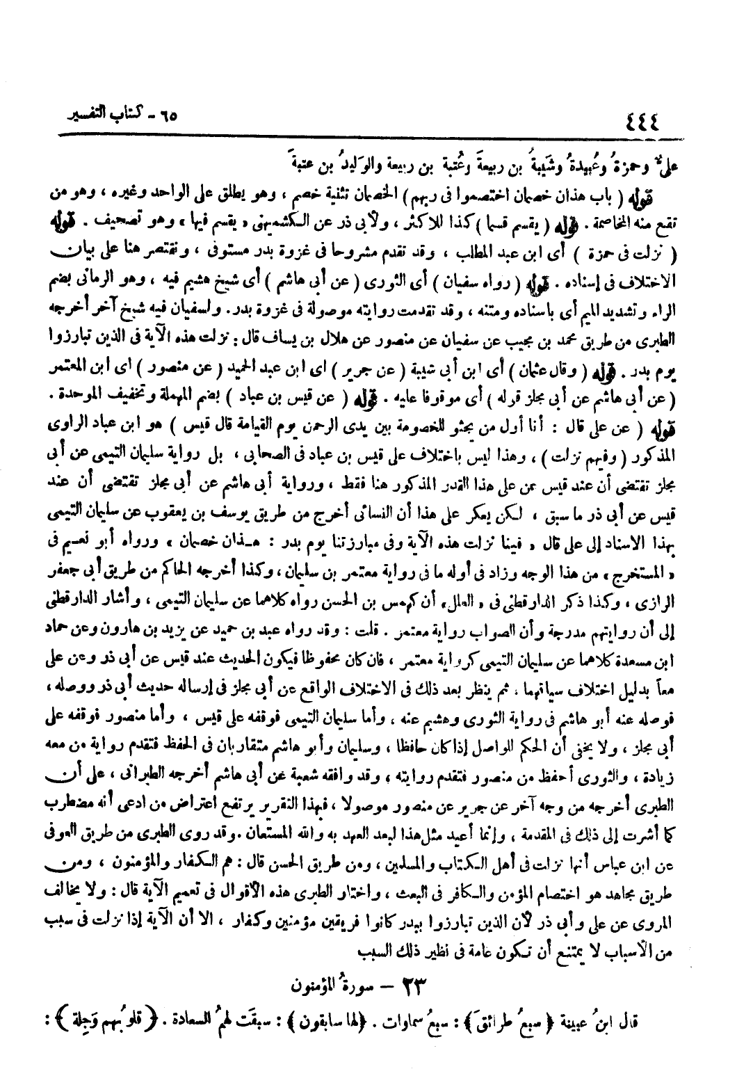[4743] قَوْلُهُ نَزَلَتْ فِي حَمْزَة أَي بن عَبْدِ الْمُطَّلِبِ وَقَدْ تَقَدَّمَ مَشْرُوحًا فِي غَزْوَةِ بَدْرٍ مُسْتَوْفًى وَنَقْتَصِرُ هُنَا عَلَى بَيَانِ الِاخْتِلَافِ فِي إِسْنَادِهِ قَوْلُهُ رَوَاهُ سُفْيَانُ أَيِ الثَّوْرِيُّ عَنْ أَبِي هَاشِمٍ أَيْ شَيْخُ هُشَيْمٍ فِيهِ وَهُوَ الرُّمَّانِيُّ بِضَمِّ الرَّاءِ وَتَشْدِيدِ الْمِيمِ أَيْ بِإِسْنَادِهِ وَمَتْنِهِ وَقَدْ تَقَدَّمَتْ رِوَايَتُهُ مَوْصُولَةً فِي غَزْوَةِ بَدْرٍ وَلِسُفْيَانَ فِيهِ شَيْخٌ آخَرُ أَخْرَجَهُ الطَّبَرِيُّ مِنْ طَرِيقِ مُحَمَّدِ بْنِ مُجِيبٍ عَنْ سُفْيَانَ عَنْ مَنْصُورٍ عَنْ هِلَالِ بْنِ يَسَافٍ قَالَ نَزَلَتْ هَذِهِ الْآيَةُ فِي الَّذِينَ تَبَارَزُوا يَوْم بدر قَوْله وَقَالَ عُثْمَان أَي بن أبي شيبَة عَن جرير أَي بن عبد الحميد عَن مَنْصُور أَي بن الْمُعْتَمِرِ عَنْ أَبِي هَاشِمٍ عَنْ أَبِي مِجْلَزٍ قَوْلُهُ أَيْ مَوْقُوفًا عَلَيْهِ قَوْلُهُ عَنْ قَيْسِ بْنُ عُبَادٍ بِضَمِّ الْمُهْمَلَةِ وَتَخْفِيفِ الْمُوَحَّدَةِ