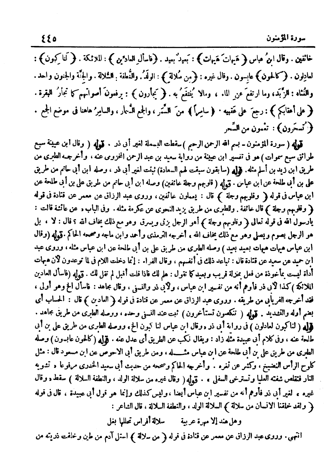 سَقَطَتِ الْبَسْمَلَةُ لِغَيْرِ أَبِي ذَرٍّ قَوْلُهُ وَقَالَ بن عُيَيْنَة سبع طرائق سبع سماوات هُوَ فِي تَفْسِير بن عُيَيْنَةَ مِنْ رِوَايَةِ سَعْدِ بْنِ عَبْدِ الرَّحْمَنِ المَخْزُومِي عَنهُ وَأخرجه الطَّبَرِيّ من طَرِيق بن زَيْدِ بْنِ أَسْلَمَ مَثَلَهُ قَوْلُهُ سَابِقُونَ سَبَقَتْ لَهُمُ السَّعَادَةُ ثَبَتَتْ لِغَيْرِ أَبِي ذَرٍّ وَصَلَهُ بن أَبِي حَاتِمٍ مِنْ طَرِيقِ عَلِيِّ بْنِ أَبِي طَلْحَةَ عَنِ بن عَبَّاس قَوْله قُلُوبهم وَجلة خَائِفين وَصله بن أَبِي حَاتِمٍ مِنْ طَرِيقِ عَلِيِّ بْنِ أَبِي طَلْحَةَ عَنِ بن عَبَّاس فِي قَوْله وَقُلُوبهمْ وَجلة قَالَ يَعْمَلُونَ خَائِفِينَ وَرَوَى عَبْدُ الرَّزَّاقِ عَنْ مَعْمَرٍ عَنْ قَتَادَةَ فِي قَوْلِهِ وَقُلُوبُهُمْ وَجِلَةٌ قَالَ خَائِفَةٌ وَلِلطَّبَرَيْ مِنْ طَرِيقِ يَزِيدُ النَّحْوِيِّ عَنْ عِكْرِمَةَ مَثَلَهُ وَفِي الْبَابِ عَنْ عَائِشَةَ قَالَتْ يَا رَسُولَ اللَّهِ فِي قَوْلِهِ تَعَالَى وَقُلُوبهمْ وَجلة أَهْوَ الرَّجُلَ يَزْنِي وَيَسْرِقُ وَهُوَ مَعَ ذَلِكَ يَخَافُ اللَّهَ قَالَ لَا بَلْ هُوَ الرَّجُلُ يَصُومُ وَيُصَلِّي وَهُوَ مَعَ ذَلِكَ يَخَافُ اللَّهَ أخرجه التِّرْمِذِيّ وَأحمد وبن ماجة وَصَححهُ الْحَاكِم قَوْله وَقَالَ بن عَبَّاسٍ هَيْهَاتَ هَيْهَاتَ بِعِيدٍ بَعِيدٍ وَصَلَهُ الطَّبَرِيُّ مِنْ طَرِيقِ عَلِيِّ بْنِ أَبِي طَلْحَةَ عَنِ بن عَبَّاسٍ مَثَلَهُ وَرَوَى عَبْدُ بْنُ حُمَيْدٍ عَنْ سَعِيدٍ عَنْ قَتَادَةَ قَالَ تَبَاعُدُ ذَلِكَ فِي أَنْفُسِهِمْ وَقَالَ الْفِرَاءُ إِنَّمَا دَخَلَتِ اللَّامُ فِي لَمَّا تُوعِدُونَ لِأَنَّ هَيْهَاتَ أَدَاةً لَيْسَتْ بِمَأْخُوذَةٍ مِنْ فِعْلٍ بِمَنْزِلَةِ قَرِيبٍ وَبِعِيدٍ كَمَا تَقُولُ هَلُمَّ لَكَ فَإِذَا قُلْتَ أَقْبَلُ لَمْ تَقُلْ لَك قَوْله فاسأل العادين الْمَلَائِكَةُ كَذَا لِأَبِي ذَرٍّ فَأُوهِمُ أَنَّهُ مِنْ تَفْسِير بن عَبَّاسٍ وَلِأَبِي ذَرٍّ وَالنَّسْفِي وَقَالَ مُجَاهِدٌ فَاسْأَلْ إِلَخْ وَهُوَ أَوْلَى فَقَدْ أَخْرَجَهُ الْفِرْيَابِيُّ مِنْ طَرِيقِهِ وَرَوَى عَبْدُ الرَّزَّاقِ عَنْ مَعْمَرٍ عَنْ قَتَادَةَ فِي قَوْلِهِ الْعَادِّينَ قَالَ الْحُسَّابُ أَيْ بِضَمِّ أَوَّلِهِ وَالتَّشْدِيدِ قَوْلُهُ تَنْكِصُونَ تَسْتَأْخِرُونَ ثَبَتَ عِنْدَ النَّسْفِي وَحَدَّهُ وَوَصْلَهُ الطَّبَرَيْ مِنْ طَرِيقِ مُجَاهِدٍ قَوْلُهُ لَنَاكِبُونَ لَعَادِلُونَ فِي رِوَايَةِ أَبِي ذَر وَقَالَ بن عَبَّاسٍ لَنَاكِبُونَ إلَخْ وَوَصَلَهُ الطَّبَرِيُّ مِنْ طَرِيقِ عَلِيِّ بْنِ أَبِي طَلْحَةَ عَنْهُ وَفِي كَلَامِ أَبِي عُبَيْدَةَ مَثَلُهُ زَادَ وَيُقَالُ نَكَبَ عَنِ الطَّرِيقِ أَيْ عَدَلَ عَنْهُ قَوْلُهُ كَالِحُونَ عَابِسُونَ وَصَلَهُ الطَّبَرِيُّ مِنْ طَرِيقِ عَلِيِّ بْنِ أَبِي طَلْحَةَ عَنِ بن عَبَّاسٍ مِثْلَهُ وَمِنْ طَرِيقِ أَبِي الْأَحْوَصِ عَنِ بن مَسْعُودٍ قَالَ مِثْلُ كُلُوحِ الرَّأْسِ النَّضِيخِ وَكَشَّرَ عَنْ ثَغْرِهِ وَأَخْرَجَهُ الْحَاكِمُ وَصَحَّحَهُ مِنْ حَدِيثِ أَبِي سَعِيدٍ الْخُدْرِيِّ مَرْفُوعًا تَشْوِيهِ النَّارُ فَتَقْلُصُ شَفَتُهُ الْعُلْيَا وَتَسْتَرْخِي السُّفْلَى قَوْلُهُ وَقَالَ غَيْرُهُ مِنْ سُلَالَةِ الْوَلَدَ وَالنُّطْفَةُ السُّلَالَةُ سَقَطَ وَقَالَ غَيْرُهُ لِغَيْرِ أَبِي ذَرٍّ فَأَوْهَمَ أَنَّهُ مِنْ تَفْسِير بن عَبَّاسٍ أَيْضًا وَلَيْسَ كَذَلِكَ وَإِنَّمَا هُوَ قَوْلُ أَبِي عُبَيْدَةَ قَالَ فِي قَوْلِهِ وَلَقَدْ خَلَقْنَا الْإِنْسَان من سلالة السُّلَالَةُ الْوَلَدُ وَالنُّطْفَةُ السُّلَالَةُ قَالَ الشَّاعِرُ وَهَلْ هِنْدُ إِلَّا مُهْرَةٌ عَرَبِيَّةٌ سُلَالَةُ أَفْرَاسٍ تَحَلَّلَهَا بَغْلُ انْتَهَى وَرَوَى عَبْدُ الرَّزَّاقِ عَنْ مَعْمَرٍ عَن