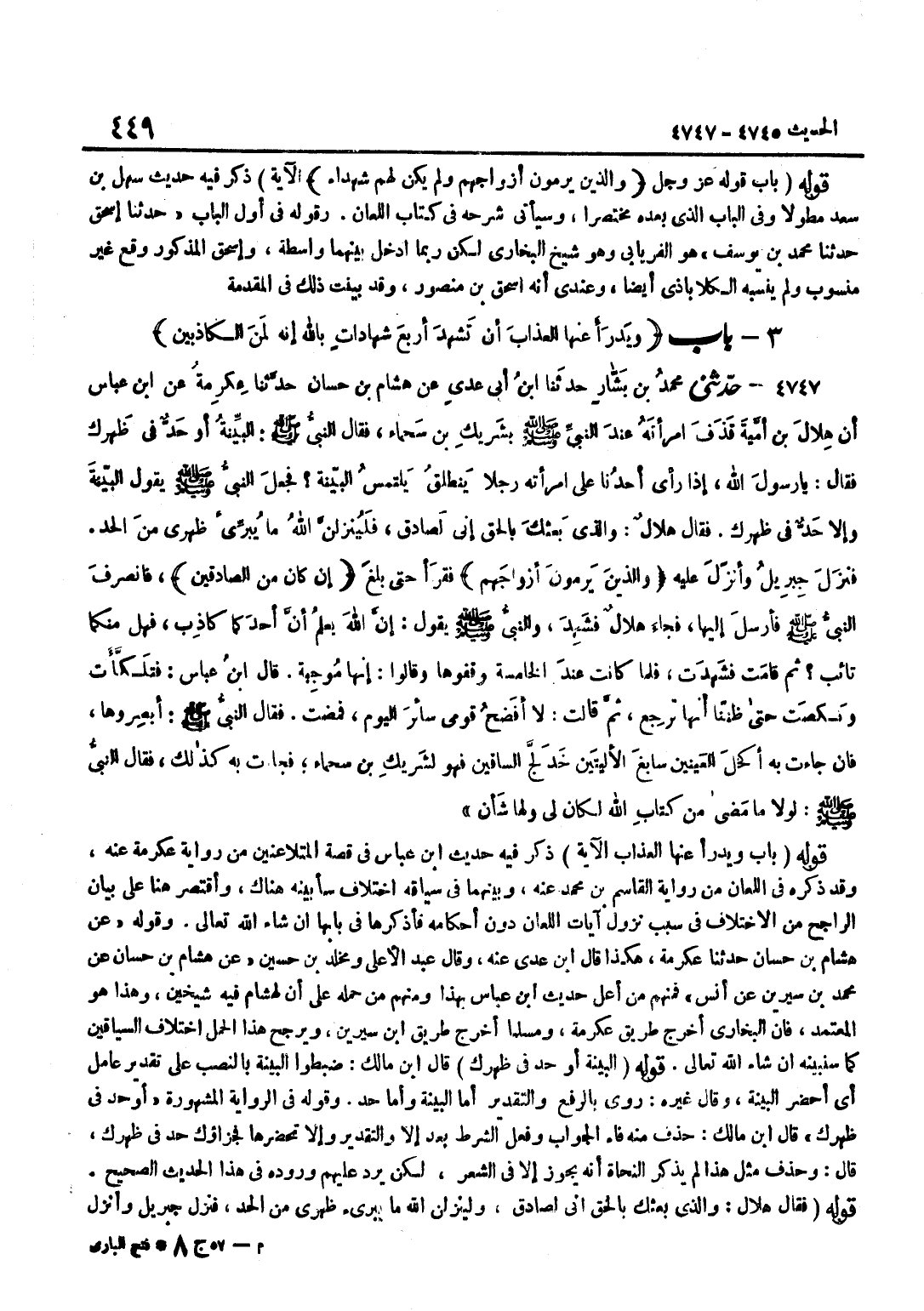 [4747] عَنْ هِشَامِ بْنِ حسان حَدثنَا عِكْرِمَة هَكَذَا قَالَ بن عَدِيٍّ عَنْهُ وَقَالَ عَبْدُ الْأَعْلَى وَمَخْلَدُ بْنُ حُسَيْنٍ عَنْ هِشَامِ بْنِ حَسَّانَ عَنْ مُحَمَّدِ بْنِ سِيرِينَ عَنْ أَنَسٍ فَمِنْهُمْ مَنْ أَعَلَّ حَدِيث بن عَبَّاسٍ بِهَذَا وَمِنْهُمْ مَنْ حَمَلَهُ عَلَى أَنَّ لِهِشَامٍ فِيهِ شَيْخَيْنِ وَهَذَا هُوَ الْمُعْتَمَدُ فَإِنَّ الْبُخَارِيَّ أَخْرَجَ طَرِيقَ عِكْرِمَةَ وَمُسْلِمًا أَخْرَجَ طَرِيقَ بن سِيرِينَ وَيُرَجِّحُ هَذَا الْحَمْلُ اخْتِلَافُ السِّيَاقَيْنِ كَمَا سَنُبَيِّنُهُ إِنْ شَاءَ اللَّهُ تَعَالَى قَوْلُهُ الْبَيِّنَةَ أَو حد فِي ظهرك قَالَ بن مَالِكٍ ضَبَطُوا الْبَيِّنَةَ بِالنَّصْبِ عَلَى تَقْدِيرِ عَامِلٍ أَيْ أَحْضِرِ الْبَيِّنَةَ وَقَالَ غَيْرُهُ رُوِيَ بِالرَّفْعِ وَالتَّقْدِيرُ إِمَّا الْبَيِّنَةُ وَإِمَّا حَدٌّ وَقَوْلُهُ فِي الرِّوَايَة الْمَشْهُورَة أوحد فِي ظهرك قَالَ بن مَالِكٍ حُذِفَ مِنْهُ فَاءُ الْجَوَابِ وَفِعْلُ الشَّرْطِ بَعْدَ إِلَّا وَالتَّقْدِيرُ وَإِلَّا تُحْضِرُهَا فَجَزَاؤُكَ حَدٌّ فِي ظَهْرِكَ قَالَ وَحَذْفُ مِثْلِ هَذَا لَمْ يَذْكُرِ النُّحَاةُ أَنَّهُ يَجُوزُ إِلَّا فِي الشِّعْرِ لَكِنْ يَرُدُّ عَلَيْهِمْ وُرُودُهُ فِي هَذَا الْحَدِيثِ الصَّحِيحِ قَوْلُهُ فَقَالَ هِلَالٌ وَالَّذِي بَعَثَكَ بِالْحَقِّ إِنِّي لَصَادِقٌ وَلَيُنْزِلَنَّ اللَّهُ مَا يُبَرِّئُ ظَهْرِي مِنَ الْحَدِّ فَنَزَلَ جِبْرِيلُ وَأَنْزَلَ