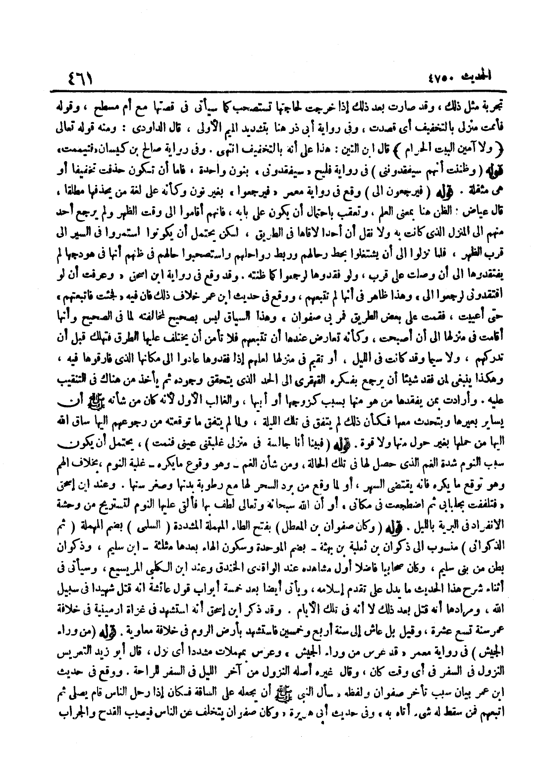 تَجْرِبَةٌ مِثْلُ ذَلِكَ وَقَدْ صَارَتْ بَعْدَ ذَلِكَ إِذَا خَرَجَتْ لِحَاجَتِهَا تَسْتَصْحِبُ كَمَا سَيَأْتِي فِي قِصَّتِهَا مَعَ أُمِّ مِسْطَحٍ وَقَوْلُهُ فَأَمَمْتُ مَنْزِلِي بِالتَّخْفِيفِ أَيْ قَصَدْتُ وَفِي رِوَايَةِ أَبِي ذَرٍّ هُنَا بِتَشْدِيدِ الْمِيمِ الْأُولَى قَالَ الدَّاوُدِيُّ وَمِنْهُ قَوْله تَعَالَى وَلَا آمين الْبَيْت الْحَرَام قَالَ بن التِّينِ هَذَا عَلَى أَنَّهُ بِالتَّخْفِيفِ انْتَهَى وَفِي رِوَايَةِ صَالِحِ بْنِ كَيْسَانَ فَتَيَمَّمْتُ قَوْلُهُ وَظَنَنْتُ أَنهم سيعقدونني فِي رِوَايَةِ فُلَيْحٍ سَيَفْقِدُونِي بِنُونٍ وَاحِدَةٍ فَإِمَّا أَنْ تَكُونَ حُذِفَتْ تَخْفِيفًا أَوْ هِيَ مُثَقَّلَةٌ قَوْلُهُ فَيَرْجِعُونَ إِلَيَّ وَقَعَ فِي رِوَايَةِ مَعْمَرٍ فَيَرْجِعُوا بِغَيْرِ نُونٍ وَكَأَنَّهُ عَلَى لُغَةِ مَنْ يَحْذِفُهَا مُطْلَقًا قَالَ عِيَاضٌ الظَّنُّ هُنَا بِمَعْنَى الْعِلْمِ وَتُعُقِّبَ بِاحْتِمَالِ أَنْ يَكُونَ عَلَى بَابِهِ فَإِنَّهُم أَقَامُوا إِلَى وَقت الظّهْر وَلم يرجح أَحَدٌ مِنْهُمْ إِلَى الْمَنْزِلِ الَّذِي كَانَتْ بِهِ وَلَا نُقِلَ أَنَّ أَحَدًا لَاقَاهَا فِي الطَّرِيقِ لَكِنْ يُحْتَمَلُ أَنْ يَكُونُوا اسْتَمَرُّوا فِي السَّيْرِ إِلَى قُرْبِ الظُّهْرِ فَلَمَّا نَزَلُوا إِلَى أَنْ يَشْتَغِلُوا بِحَطِّ رِحَالِهِمْ وَرَبْطِ رَوَاحِلِهِمْ وَاسْتَصْحَبُوا حَالَهُمْ فِي ظَنِّهِمْ أَنَّهَا فِي هَوْدَجِهَا لَمْ يَفْتَقِدُوهَا إِلَى أَنْ وَصَلَتْ عَلَى قُرْبٍ وَلَوْ فَقَدُوهَا لَرَجَعُوا كَمَا ظَنَّتْهُ وَقَدْ وَقَعَ فِي رِوَايَةِ بن إِسْحَاقَ وَعَرَفْتُ أَنْ لَوِ افْتَقَدُونِي لَرَجَعُوا إِلَيَّ وَهَذَا ظَاهِرٌ فِي أَنَّهَا لَمْ تَتَّبِعْهُمْ وَوَقَعَ فِي حَدِيث بن عُمَرَ خِلَافُ ذَلِكَ فَإِنَّ فِيهِ فَجِئْتُ فَاتَّبَعْتُهُمْ حَتَّى أَعْيَيْتُ فَقُمْتُ عَلَى بَعْضِ الطَّرِيقِ فَمَرَّ بن صَفْوَانُ وَهَذَا السِّيَاقُ لَيْسَ بِصَحِيحٍ لِمُخَالَفَتِهِ لِمَا فِي الصَّحِيحِ وَأَنَّهَا أَقَامَتْ فِي مَنْزِلِهَا إِلَى أَنْ أَصْبَحَتْ وَكَأَنَّهُ تَعَارَضَ عِنْدَهَا أَنْ تَتْبَعَهُمْ فَلَا تَأْمَنُ أَنْ يَخْتَلِفَ عَلَيْهَا الطُّرُقُ فَتَهْلَكَ قَبْلَ أَنْ تُدْرِكَهُمْ وَلَا سِيَّمَا وَقَدْ كَانَتْ فِي اللَّيْلِ أَوْ تُقِيمَ فِي مَنْزِلِهَا لَعَلَّهُمْ إِذَا فَقَدُوهَا عَادُوا إِلَى مَكَانِهَا الَّذِي فَارَقُوهَا فِيهِ وَهَكَذَا يَنْبَغِي لِمَنْ فَقَدْ شَيْئًا أَنْ يَرْجِعَ بِفِكْرِهِ الْقَهْقَرَى إِلَى الْحَدِّ الَّذِي يَتَحَقَّقُ وُجُودَهُ ثُمَّ يَأْخُذَ مِنْ هُنَاكَ فِي التَّنْقِيبِ عَلَيْهِ وَأَرَادَتْ بِمَنْ يَفْقِدُهَا مَنْ هُوَ مِنْهَا بِسَبَبٍ كَزَوْجِهَا أَوْ أَبِيهَا وَالْغَالِبُ الْأَوَّلُ لِأَنَّهُ كَانَ مِنْ شَأْنِهِ صَلَّى اللَّهُ عَلَيْهِ وَسَلَّمَ أَنْ يُسَايِرَ بَعِيرَهَا وَيَتَحَدَّثُ مَعَهَا فَكَأَنَّ ذَلِكَ لَمْ يَتَّفِقْ فِي تِلْكَ اللَّيْلَةِ وَلَمَّا لَمْ يَتَّفِقْ مَا تَوَقَّعَتْهُ مِنْ رُجُوعِهِمْ إِلَيْهَا سَاقَ اللَّهُ إِلَيْهَا مَنْ حَمَلَهَا بِغَيْرِ حَوْلٍ مِنْهَا وَلَا قُوَّةٍ قَوْلُهُ فَبَيْنَا أَنَا جَالِسَةٌ فِي مَنْزِلِي غَلَبَتْنِي عَيْنِي فَنِمْتُ يُحْتَمَلُ أَنْ يَكُونَ سَبَبُ النَّوْمِ شِدَّةُ الْغَمِّ الَّذِي حَصَلَ لَهَا فِي تِلْكَ الْحَالَةِ وَمِنْ شَأْنِ الْغَمِّ وَهُوَ وُقُوعُ مَا يُكْرَهُ غَلَبَةُ النَّوْمِ بِخِلَافِ الْهَمِّ وَهُوَ تَوَقُّعُ مَا يُكْرَهُ فَإِنَّهُ يَقْتَضِي السَّهَرَ أَوْ لِمَا وَقَعَ مِنْ بَرْدِ السَّحَرِ لَهَا مَعَ رُطُوبَة بدنهَا وَصغر سنّهَا وَعند بن إِسْحَاقَ فَتَلَفَّفْتُ بِجِلْبَابِي ثُمَّ اضْطَجَعْتُ فِي مَكَانِي أَوْ أَنَّ اللَّهَ سُبْحَانَهُ وَتَع