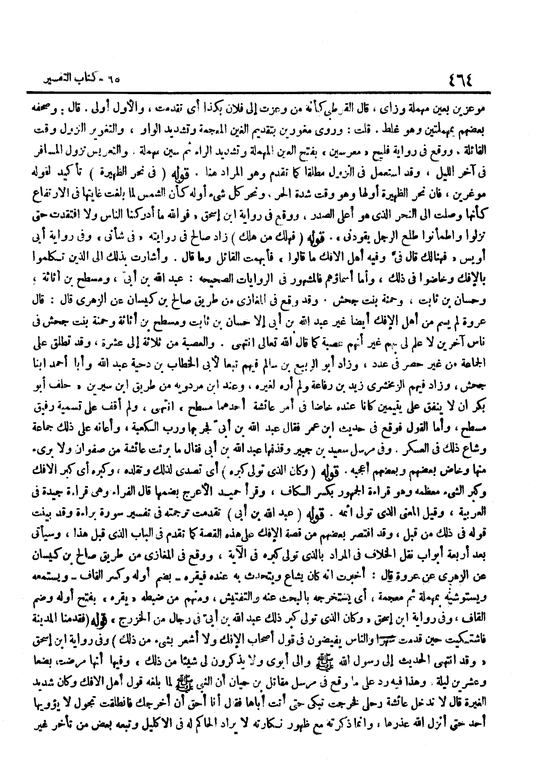 مُوعِزِينَ بِعَيْنٍ مُهْمَلَةٍ وَزَايٍ قَالَ الْقُرْطُبِيُّ كَأَنَّهُ مِنْ وَعَزْتُ إِلَى فُلَانٍ بِكَذَا أَيْ تَقَدَّمْتُ وَالْأول أولى قَالَ وصحفه بَعضهم بمهلتين وَهُوَ غَلَطٌ قُلْتُ وَرُوِيَ مُغَوِّرِينَ بِتَقْدِيمِ الْغَيْنِ الْمُعْجَمَةِ وَتَشْدِيدِ الْوَاوِ وَالتَّغْوِيرُ النُّزُولُ وَقْتَ الْقَائِلَةِ وَوَقَعَ فِي رِوَايَةِ فُلَيْحٍ مُعَرِّسِينَ بِفَتْحِ الْعَيْنِ الْمُهْمَلَةِ وَتَشْدِيدِ الرَّاءِ ثُمَّ سِينٍ مُهْمَلَةٍ وَالتَّعْرِيسُ نُزُولُ الْمُسَافِرِ فِي آخِرِ اللَّيْلِ وَقَدِ اسْتُعْمِلَ فِي النُّزُولِ مُطْلَقًا كَمَا تَقَدَّمَ وَهُوَ الْمُرَادُ هُنَا قَوْلُهُ فِي نَحْرِ الظَّهِيرَةِ تَأْكِيدٌ لِقَوْلِهِ مُوغِرِينَ فَإِنَّ نَحْرَ الظَّهِيرَةِ أَوَّلُهَا وَهُوَ وَقْتُ شِدَّةِ الْحَرِّ وَنَحْرُ كُلِّ شَيْءٍ أَوَّلُهُ كَأَنَّ الشَّمْسَ لَمَّا بَلَغَتْ غَايَتَهَا فِي الِارْتِفَاعِ كَأَنَّهَا وَصَلَتْ إِلَى النَّحْرِ الَّذِي هُوَ أَعْلَى الصَّدْرِ وَوَقع فِي رِوَايَة بن إِسْحَاق فوَاللَّه مَا أدركنا النَّاس وَإِلَّا افْتُقِدْتُ حَتَّى نَزَلُوا وَاطْمَأَنُّوا طَلَعَ الرَّجُلُ يَقُودُنِي قَوْلُهُ فَهَلَكَ مَنْ هَلَكَ زَادَ صَالِحٌ فِي رِوَايَتِهِ فِي شَأْنِي وَفِي رِوَايَةِ أَبِي أُوَيْسٍ فَهُنَالِكَ قَالَ فِيَّ وَفِيهِ أَهْلُ الْإِفْكِ مَا قَالُوا فَأَبْهَمَتِ الْقَائِلَ وَمَا قَالَ وَأَشَارَتْ بِذَلِكَ إِلَى الَّذِينَ تَكَلَّمُوا بِالْإِفْكِ وَخَاضُوا فِي ذَلِكَ وَأَمَّا أَسْمَاؤُهُمْ فَالْمَشْهُورُ فِي الرِّوَايَاتِ الصَّحِيحَةِ عَبْدُ اللَّهِ بْنُ أُبَيٍّ وَمِسْطَحُ بْنُ أُثَاثَةَ وَحَسَّانُ بْنُ ثَابِتٍ وَحَمْنَةُ بِنْتُ جَحْشٍ وَقَدْ وَقَعَ فِي الْمَغَازِي مِنْ طَرِيقِ صَالِحِ بْنِ كَيْسَانَ عَنِ الزُّهْرِيِّ قَالَ قَالَ عُرْوَةُ لَمْ يُسَمِّ مِنْ أَهْلِ الْإِفْكِ أَيْضًا غَيْرَ عَبْدِ اللَّهِ بْنِ أُبَيٍّ إِلَّا حَسَّانَ بْنَ ثَابِتٍ وَمِسْطَحَ بْنَ أُثَاثَةَ وَحَمْنَةَ بِنْتِ جَحْشٍ فِي نَاسٍ آخَرِينَ لَا عِلْمَ لِي بِهِمْ غَيْرَ أَنَّهُمْ عُصْبَةٌ كَمَا قَالَ اللَّهُ تَعَالَى انْتَهَى وَالْعُصْبَةُ مِنْ ثَلَاثَةٍ إِلَى عَشَرَةٍ وَقَدْ تُطْلَقُ عَلَى الْجَمَاعَةِ مِنْ غَيْرِ حَصْرٍ فِي عَدَدٍ وَزَادَ أَبُو الرَّبِيعِ بْنِ سَالِمٍ فِيهِمْ تَبَعًا لِأَبِي الْخَطَّابِ بْنِ دِحْيَةَ عَبْدِ اللَّهِ وَأَبَا أَحْمَدَ ابْنَا جَحْشٍ وَزَادَ فِيهِمُ الزَّمَخْشَرِيُّ زَيْدَ بْنَ رِفَاعَة وَلم أره لغيره وَعند بن مرْدَوَيْه من طَرِيق بن سِيرِينَ حَلَفَ أَبُو بَكْرٍ أَنْ لَا يُنْفِقَ عَلَى يَتِيمَيْنِ كَانَا عِنْدَهُ خَاضَا فِي أَمْرِ عَائِشَةَ أَحَدُهُمَا مِسْطَحٌ انْتَهَى وَلَمْ أَقِفْ عَلَى تَسْمِيَةِ رَفِيقِ مِسْطَحٍ وَأَمَّا الْقَوْلُ فَوَقَعَ فِي حَدِيث بن عمر فَقَالَ عبد الله بن أبي فجربها وَرَبِّ الْكَعْبَةِ وَأَعَانَهُ عَلَى ذَلِكَ جَمَاعَةٌ وَشَاعَ ذَلِكَ فِي الْعَسْكَرِ وَفِي مُرْسَلِ سَعِيدِ بْنِ جُبَيْرٍ وَقَذَفَهَا عَبْدُ اللَّهِ بْنُ أُبَيٍّ فَقَالَ مَا بَرِئت عَائِشَة من صَفْوَان وَلَا بَرِيء مِنْهَا وَخَاضَ بَعْضُهُمْ وَبَعْضُهُمْ أَعْجَبَهُ قَوْلُهُ وَكَانَ الَّذِي تَوَلَّى كِبْرَهُ أَيْ تَصَدَّى لِذَلِكَ وَتَقَلَّدَهُ وَكَبَّرَهُ أَيْ كَبَّرَ الْإِفْكَ وَكِبْرَ الشَّيْءَ مُعْظَمُهُ وَهُوَ قِرَاءَةُ الْجُمْهُورِ بِكَسْرِ الْكَافِ وَقَرَأَ حُمَيْدٌ الْأَعْرَجُ بِضَمِّهَا قَالَ الْفَرَّاءُ وَهِيَ قِرَاءَةٌ جَيِّدَةٌ فِي الْعَرَبيَّة وَقيل الْمَعْنى الَّذِي تولى أَئِمَّة قَوْلُهُ عَبْدُ اللَّهِ بْنُ أُبَيٍّ تَقَدَّمَتْ تَرْجَمَتُهُ فِي تَفْسِيرِ سُورَةِ بَرَاءَةٍ وَقَدْ بَيَّنْتُ قَوْلَهُ فِي ذَلِكَ مِنْ قَبْلُ وَقَدِ اقْ
