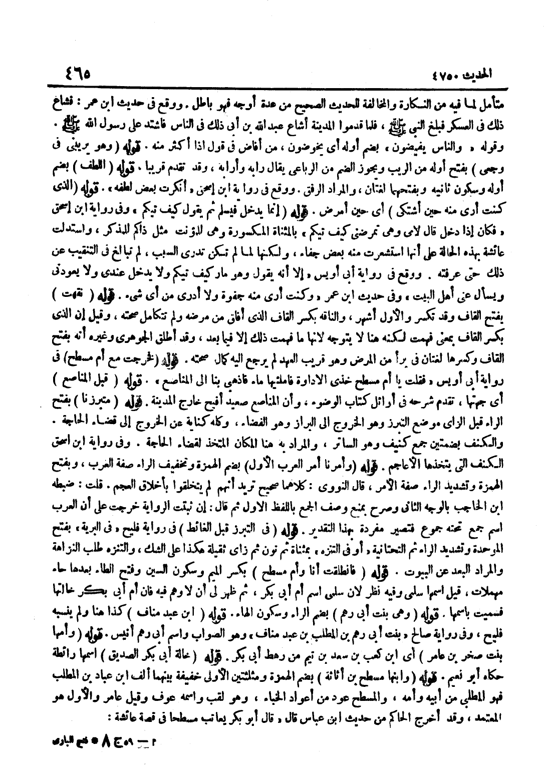 مُتَأَمِّلٍ لِمَا فِيهِ مِنَ النَّكَارَةِ وَالْمُخَالَفَةِ لِلْحَدِيثِ الصَّحِيحِ مِنْ عِدَّةِ أَوْجُهٍ فَهُوَ بَاطِلٌ وَوَقَعَ فِي حَدِيث بن عُمَرَ فَشَاعَ ذَلِكَ فِي الْعَسْكَرِ فَبَلَغَ النَّبِيَّ صَلَّى اللَّهُ عَلَيْهِ وَسَلَّمَ فَلَمَّا قَدِمُوا الْمَدِينَةَ أَشَاعَ عَبْدُ اللَّهِ بْنُ أُبَيٍّ ذَلِكَ فِي النَّاسِ فَاشْتَدَّ عَلَى رَسُولِ اللَّهِ صَلَّى اللَّهُ عَلَيْهِ وَسَلَّمَ وَقَوْلُهُ وَالنَّاسُ يُفِيضُونَ بِضَمِّ أَوَّلِهِ أَيْ يَخُوضُونَ مِنْ أَفَاضَ فِي قَوْلٍ إِذَا أَكثر مِنْهُ قَوْله وَهُوَ يريني فِي وَجَعِي بِفَتْحِ أَوَّلِهِ مِنَ الرَّيْبِ وَيَجُوزُ الضَّمُّ مِنَ الرُّبَاعِيِّ يُقَالُ رَابَهُ وَأَرَابَهُ وَقَدْ تقدم تَقْرِيبًا قَوْلُهُ اللُّطْفُ بِضَمِّ أَوَّلِهِ وَسُكُونِ ثَانِيهِ وَبِفَتْحِهِمَا لُغَتَانِ وَالْمرَاد الرِّفْق وَوَقع فِي رِوَايَة بن إِسْحَاقَ أَنْكَرَتْ بَعْضُ لُطْفِهِ قَوْلُهُ الَّذِي كُنْتُ أَرَى مِنْهُ حِينَ أَشْتَكِي أَيْ حِينَ أَمْرَضُ قَوْلُهُ إِنَّمَا يَدْخُلُ فَيُسَلِّمُ ثُمَّ يَقُولُ كَيْفَ تيكم وَفِي رِوَايَة بن إِسْحَاقَ فَكَانَ إِذَا دَخَلَ قَالَ لِأُمِّي وَهِيَ تُمَرِّضُنِي كَيْفَ تِيكُمْ بِالْمُثَنَّاةِ الْمَكْسُورَةِ وَهِيَ لِلْمُؤَنَّثِ مِثْلُ ذَاكُمْ لِلْمُذَكَّرِ وَاسْتَدَلَّتْ عَائِشَةُ بِهَذِهِ الْحَالَةِ عَلَى أَنَّهَا اسْتَشْعَرَتْ مِنْهُ بَعْضَ جَفَاءٍ وَلَكِنَّهَا لما لم تكن تَدْرِي السَّبَب لم تُبَالِغْ فِي التَّنْقِيبِ عَنْ ذَلِكَ حَتَّى عَرَفَتْهُ وَوَقَعَ فِي رِوَايَةِ أَبِي أُوَيْسٍ إِلَّا أَنَّهُ يَقُولُ وَهُوَ مَارٌّ كَيْفَ تِيكُمْ وَلَا يَدْخُلُ عِنْدِي وَلَا يَعُودُنِي وَيَسْأَلُ عَنِّي أَهْلَ الْبَيْتِ وَفِي حَدِيث بن عُمَرَ وَكُنْتُ أَرَى مِنْهُ جَفْوَةً وَلَا أَدْرِي مِنْ أَيِّ شَيْءٍ قَوْلُهُ نَقَهْتُ بِفَتْحِ الْقَافِ وَقَدْ تُكْسَرُ وَالْأَوَّلُ أَشْهَرُ وَالنَّاقِهُ بِكَسْرِ الْقَافِ الَّذِي أَفَاقَ مِنْ مَرَضِهِ وَلَمْ تَتَكَامَلْ صِحَّتُهُ وَقِيلَ إِنَّ الَّذِي بِكَسْرِ الْقَافِ بِمَعْنَى فَهِمْتُ لَكِنَّهُ هُنَا لَا يُتَوَجَّهُ لِأَنَّهَا مَا فَهِمَتْ ذَلِكَ إِلَّا فِيمَا بَعْدُ وَقَدْ أَطْلَقَ الْجَوْهَرِيُّ وَغَيْرُهُ أَنَّهُ بِفَتْحِ الْقَافِ وَكَسْرِهَا لُغَتَانِ فِي بَرَأَ مِنَ الْمَرَضِ وَهُوَ قَرِيبُ الْعَهْدِ لَمْ يَرْجِعْ إِلَيْهِ كَمَالُ صِحَّتِهِ قَوْلُهُ فَخَرَجْتُ مَعَ أُمِّ مِسْطَحٍ فِي رِوَايَةِ أَبِي أُوَيْسٍ فَقُلْتُ يَا أُمَّ مِسْطَحٍ خُذِي الْإِدَاوَةَ فَامْلَئِيهَا مَاءً فَاذْهَبِي بِنَا إِلَى الْمَنَاصِعِ قَوْلُهُ قِبَلَ الْمَنَاصِعِ أَيْ جِهَتَهَا تَقَدَّمَ شَرْحُهُ فِي أَوَائِلِ كِتَابِ الْوُضُوءِ وَأَنَّ الْمَنَاصِعَ صَعِيدُ أَفْيَحٍ خَارِجَ الْمَدِينَةِ قَوْلُهُ مُتَبَرَّزُنَا بِفَتْحِ الرَّاءِ قَبْلَ الزَّايِ مَوْضِعُ التَّبَرُّزِ وَهُوَ الْخُرُوجُ إِلَى الْبِرَازِ وَهُوَ الْفَضَاءُ وَكُلُّهُ كِنَايَةٌ عَنِ الْخُرُوجِ إِلَى قَضَاءِ الْحَاجَةِ وَالْكُنُفُ بِضَمَّتَيْنِ جَمْعُ كَنِيفٍ وَهُوَ السَّاتِرُ وَالْمُرَادُ بِهِ هُنَا الْمَكَانُ الْمُتَّخَذُ لِقَضَاءِ الْحَاجَةِ وَفِي رِوَايَة بن إِسْحَاقَ الْكُنُفُ الَّتِي يَتَّخِذُهَا الْأَعَاجِمُ قَوْلُهُ وَأَمْرُنَا أَمْرُ الْعَرَبِ الْأُوَلِ بِضَمِّ الْهَمْزَةِ وَتَخْفِيفِ الرَّاءِ صِفَةُ الْعَرَبِ وَبِفَتْحِ الْهَمْزَةِ وَتَشْدِيدِ الرَّاءِ صِفَةُ الْأَمْرِ قَالَ النَّوَوِيُّ كِلَاهُمَا صَحِيحٌ تُرِيدُ أَنَّهُمْ لم يتخلقوا بأخلاق الْعَجم قلت ضَبطه بن الْحَاجِبِ بِالْوَجْهِ الثَّانِي وَصَرَّحَ بِمَنْعِ وَصْفِ الْجَمْعِ بِاللَّفْظِ الْأَوَّلِ ثُمَّ قَالَ إِنْ ثَبَتَتِ الرِّوَايَةُ خَر