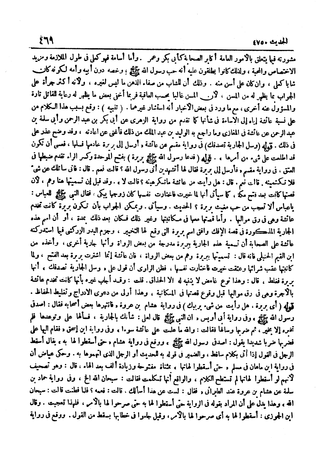 مَشُورَتِهِ فِيمَا يَتَعَلَّقُ بِالْأُمُورِ الْعَامَّةِ أَكَابِرَ الصَّحَابَةِ كَأَبِي بَكْرٍ وَعُمَرَ وَأَمَّا أُسَامَةُ فَهُوَ كَعَلِيٍّ فِي طُولِ الْمُلَازَمَةِ وَمَزِيدِ الِاخْتِصَاصِ وَالْمَحَبَّةِ وَلِذَلِكَ كَانُوا يُطْلِقُونَ عَلَيْهِ أَنَّهُ حِبَّ رَسُولِ اللَّهِ صَلَّى اللَّهُ عَلَيْهِ وَسَلَّمَ وَخَصَّهُ دُونَ أَبِيهِ وَأُمَّهُ لِكَوْنِهِ كَانَ شَابًّا كَعَلِيٍّ وَإِنْ كَانَ عَلِيٌّ أَسَنَّ مِنْهُ وَذَلِكَ أَنَّ لِلشَّابِّ مِنْ صَفَاءِ الذِّهْنِ مَا لَيْسَ لِغَيْرِهِ وَلِأَنَّهُ أَكْثَرُ جُرْأَةٍ عَلَى الْجَوَابِ بِمَا يَظْهَرُ لَهُ مِنَ الْمُسِنِّ لِأَنَّ الْمُسِنَّ غَالِبًا يَحْسُبُ الْعَاقِبَةَ فَرُبَّمَا أخْفى مَا يظْهر لَهُ رِعَايَة للقائل تَارَة والمسؤول عَنْهُ أُخْرَى مَعَ مَا وَرَدَ فِي بَعْضِ الْأَخْبَارِ أَنَّهُ اسْتَشَارَ غَيْرَهُمَا تَنْبِيهٌ وَقَعَ بِسَبَبِ هَذَا الْكَلَامِ مِنْ عَلِيٍّ نِسْبَةُ عَائِشَةَ إِيَّاهُ إِلَى الْإِسَاءَةِ فِي شَأْنِهَا كَمَا تَقَدَّمَ مِنْ رِوَايَةِ الزُّهْرِيِّ عَنْ أَبِي بَكْرِ بْنِ عَبْدِ الرَّحْمَنِ وَأَبِي سَلَمَةَ بْنِ عَبْدِ الرَّحْمَنِ عَنْ عَائِشَةَ فِي الْمَغَازِي وَمَا رَاجَعَ بِهِ الْوَلِيدُ بْنُ عَبْدِ الْمَلِكِ مِنْ ذَلِكَ فَأَغْنَى عَنْ إِعَادَتِهِ وَقَدْ وَضَحَ عُذْرُ عَلِيٍّ فِي ذَلِكَ قَوْلُهُ وَسَلِ الْجَارِيَةَ تَصْدُقْكَ فِي رِوَايَةِ مِقْسَمٍ عَن عَائِشَة أرسل إِلَى بَرِيرَة خَادِمهَا فَسَلْهَا فَعَسَى أَنْ تَكُونَ قَدِ اطَّلَعَتْ عَلَى شَيْءٍ مِنْ أَمْرِهَا قَوْلُهُ فَدَعَا رَسُولُ اللَّهِ صَلَّى اللَّهُ عَلَيْهِ وَسَلَّمَ بَرِيرَةَ بِفَتْحِ الْمُوَحَّدَةِ وَكسر الرَّاء تقدم ضَبطهَا فِي الْعتْق وَفِي رِوَايَةِ مِقْسَمٍ فَأَرْسَلَ إِلَى بَرِيرَةَ فَقَالَ لَهَا أَتَشْهَدِينَ أَنِّي رَسُولُ اللَّهِ قَالَتْ نَعَمْ قَالَ فَإِنِّي سَائِلُكِ عَنْ شَيْءٍ فَلَا تَكْتُمِينَهُ قَالَتْ نَعَمْ قَالَ هَلْ رَأَيْتِ مِنْ عَائِشَةَ مَا تَكْرَهِينَهُ قَالَتْ لَا وَقَدْ قِيلَ إِنَّ تَسْمِيَتَهَا هُنَا وَهَمٌ لِأَنَّ قِصَّتَهَا كَانَتْ بَعْدَ فَتْحِ مَكَّةَ كَمَا سَيَأْتِي أَنَّهَا لَمَّا خُيِّرَتْ فَاخْتَارَتْ نَفْسَهَا كَانَ زَوْجُهَا يَبْكِي فَقَالَ النَّبِيُّ صَلَّى اللَّهُ عَلَيْهِ وَسَلَّمَ لِلْعَبَّاسِ يَا عَبَّاسُ أَلَا تَعْجَبُ مِنْ حُبِّ مُغِيثٍ بَرِيرَةَ الْحَدِيثَ وَسَيَأْتِي وَيُمْكِنُ الْجَوَابُ بِأَنْ تَكُونَ بَرِيرَةُ كَانَتْ تَخْدُمُ عَائِشَةَ وَهِيَ فِي رِقِّ مَوَالِيهَا وَأَمَّا قِصَّتُهَا مَعًا فِي مُكَاتَبَتِهَا وَغَيْرِ ذَلِكَ فَكَانَ بَعْدَ ذَلِكَ بِمُدَّةٍ أَوْ أَنَّ اسْمَ هَذِهِ الْجَارِيَةِ الْمَذْكُورَةِ فِي قِصَّةِ الْإِفْكِ وَافَقَ اسْمَ بَرِيرَةَ الَّتِي وَقَعَ لَهَا التَّخْيِيرُ وَجَزَمَ الْبَدْرُ الزَّرْكَشِيُّ فِيمَا اسْتَدْرَكَتْهُ عَائِشَةُ عَلَى الصَّحَابَةِ أَنَّ تَسْمِيَةَ هَذِهِ الْجَارِيَةِ بِبَرِيرَةَ مُدْرَجَةٌ مِنْ بَعْضِ الرُّوَاةِ وَأَنَّهَا جَارِيَة أُخْرَى وَأَخذه من بن الْقَيِّمِ الْحَنْبَلِيِّ فَإِنَّهُ قَالَ تَسْمِيَتُهَا بِبَرِيرَةَ وَهَمٌ مِنْ بَعْضِ الرُّوَاةِ فَإِنَّ عَائِشَةَ إِنَّمَا اشْتَرَتْ بَرِيرَةَ بَعْدَ الْفَتْحِ وَلَمَّا كَاتَبَتْهَا عَقِبَ شِرَائِهَا وَعَتَقَتْ خُيِّرَتْ فَاخْتَارَتْ نَفْسَهَا فَظَنَّ الرَّاوِي أَنَّ قَوْلَ عَلِيٍّ وَسَلِ الْجَارِيَةَ تَصْدُقْكَ أَنَّهَا بَرِيرَةُ فغلط قَالَ وَهَذَا نوع غامض لَا ينتبه لَهُ إِلَّا الْحُذَّاقُ قُلْتُ وَقَدْ أَجَابَ غَيْرُهُ بِأَنَّهَا كَانَتْ تَخْدُمُ عَائِشَةَ بِالْأُجْرَةِ وَهِيَ فِي رِقِّ مَوَالِيهَا قَبْلَ وُقُوعِ قِصَّتِهَا فِي الْمُكَاتَبَةِ وَهَذَا أَوْلَى مِ