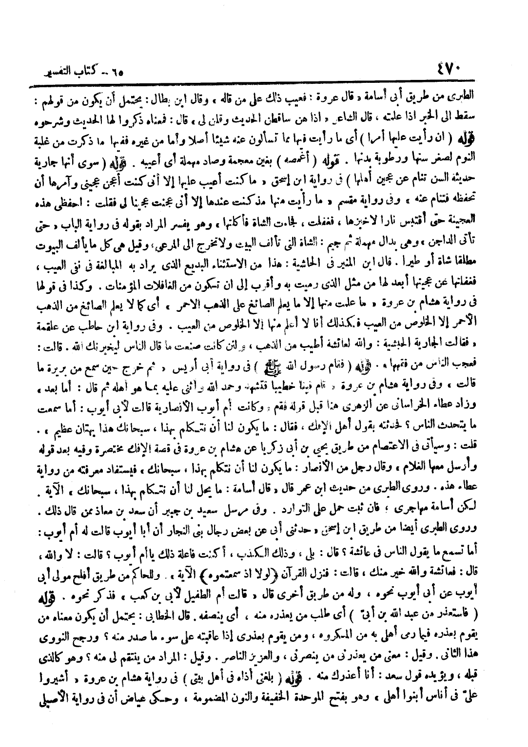 الطَّبَرِيِّ مِنْ طَرِيقِ أَبِي أُسَامَةَ قَالَ عُرْوَةُ فعيب ذَلِك على من قَالَه وَقَالَ بن بَطَّالٍ يُحْتَمَلُ أَنْ يَكُونَ مِنْ قَوْلِهِمْ سَقَطَ إِلَيَّ الْخَبَرُ إِذَا عَلِمْتُهُ قَالَ الشَّاعِرُ إِذَا هُنَّ سَاقَطْنَ الْحَدِيثَ وَقُلْنَ لِي قَالَ فَمَعْنَاهُ ذَكَرُوا لَهَا الْحَدِيثَ وَشَرَحُوهُ قَوْلُهُ إِنْ رَأَيْتَ عَلَيْهَا أَمْرًا أَيْ مَا رَأَيْتَ فِيهَا مِمَّا تَسْأَلُونَ عَنْهُ شَيْئًا أَصْلًا وَأَمَّا مِنْ غَيْرِهِ فَفِيهَا مَا ذَكَرْتُ مِنْ غَلَبَةِ النَّوْمِ لِصِغَرِ سِنِّهَا وَرُطُوبَةِ بَدَنِهَا قَوْلُهُ أَغْمِصُهُ بِغَيْنٍ مُعْجَمَةٍ وَصَادٍ مُهْمَلَةٍ أَيْ أَعِيبُهُ قَوْلُهُ سِوَى أَنَّهَا جَارِيَةٌ حَدِيثَةُ السِّنِّ تَنَامُ عَنْ عَجِينِ أَهْلِهَا فِي رِوَايَة بن إِسْحَاقَ مَا كُنْتُ أَعِيبُ عَلَيْهَا إِلَّا أَنِّي كُنْتُ أَعْجِنُ عَجِينِي وَآمُرُهَا أَنْ تَحْفَظَهُ فَتَنَامَ عَنْهُ وَفِي رِوَايَةِ مِقْسَمٍ مَا رَأَيْتُ مِنْهَا مُذْ كُنْتُ عِنْدَهَا إِلَّا أَنِّي عَجَنْتُ عَجِينًا لِي فَقُلْتُ احْفَظِي هَذِهِ الْعَجِينَةَ حَتَّى أَقْتَبِسَ نَار إِلَّا خبزها فَغَفَلَتْ فَجَاءَتِ الشَّاةُ فَأَكَلَتْهَا وَهُوَ يُفَسِّرُ الْمُرَادُ بِقَوْلِهِ فِي رِوَايَةِ الْبَابِ حَتَّى تَأْتِي الدَّاجِنُ وَهِيَ بِدَالٍ مُهْمَلَةٍ ثُمَّ جِيمٍ الشَّاةُ الَّتِي تَأْلَفُ الْبَيْتَ وَلَا تَخْرُجُ إِلَى الْمَرْعَى وَقِيلَ هِيَ كُلُّ مَا يَأْلَفُ الْبُيُوتَ مُطْلَقًا شَاةً أَو طيرا قَالَ بن الْمُنِيرِ فِي الْحَاشِيَةِ هَذَا مِنَ الِاسْتِثْنَاءِ الْبَدِيعِ الَّذِي يُرَادُ بِهِ الْمُبَالَغَةُ فِي نَفْيِ الْعَيْبِ فَغَفَلْتُهَا عَنْ عَجِينِهَا أَبْعَدُ لَهَا مِنْ مِثْلِ الَّذِي رُمِيَتْ بِهِ وَأَقْرَبُ إِلَى أَنْ تَكُونَ مِنَ الْغَافِلَاتِ الْمُؤْمِنَاتِ وَكَذَا فِي قَوْلِهَا فِي رِوَايَة هِشَام بن عُرْوَة مَا علمت إِلَّا مَا يَعْلَمُ الصَّائِغُ عَلَى الذَّهَبِ الْأَحْمَرِ أَيْ كَمَا لَا يَعْلَمُ الصَّائِغُ مِنَ الذَّهَبِ الْأَحْمَرِ إِلَّا الْخُلُوصُ مِنَ الْعَيْبِ فَكَذَلِكَ أَنَا لَا أَعْلَمُ مِنْهَا إِلَّا الْخُلُوصُ مِنَ الْعَيْبِ وَفِي رِوَايَة بن حَاطِبٍ عَنْ عَلْقَمَةَ فَقَالَتِ الْجَارِيَةُ الْحَبَشِيَّةُ وَاللَّهِ لَعَائِشَةُ أَطْيَبُ مِنَ الذَّهَبِ وَلَئِنْ كَانَتْ صَنَعْتِ مَا قَالَ النَّاسُ لَيُخْبِرَنَّكَ اللَّهُ قَالَتْ فَعَجِبَ النَّاسُ مِنْ فِقْهِهَا قَوْلُهُ فَقَامَ رَسُولُ اللَّهِ صَلَّى اللَّهُ عَلَيْهِ وَسَلَّمَ فِي رِوَايَةِ أَبِي أُوَيْسٍ ثُمَّ خَرَجَ حِينَ سَمِعَ مِنْ بَرِيرَةَ مَا قَالَتْ وَفِي رِوَايَةِ هِشَامِ بْنِ عُرْوَةَ قَامَ فِينَا خَطِيبًا فَتَشَهَّدَ وَحَمِدَ اللَّهَ وَأَثْنَى عَلَيْهِ بِمَا هُوَ أَهْلُهُ ثُمَّ قَالَ أَمَّا بَعْدُ وَزَاد عَطاء الخرساني عَن الزُّهْرِيّ هُنَا قبل قَوْله فَقُمْ وَكَانَتْ أُمُّ أَيُّوبَ الْأَنْصَارِيَّةُ قَالَتْ لِأَبِي أَيُّوبَ أَمَا سَمِعْتَ مَا يَتَحَدَّثُ النَّاسُ فَحَدَّثَتْهُ بِقَوْلِ أَهْلِ الْإِفْكِ فَقَالَ مَا يَكُونُ لَنَا أَنْ نتكلم بِهَذَا سُبْحَانَكَ هَذَا بهتان عَظِيم قُلْتُ وَسَيَأْتِي فِي الِاعْتِصَامِ مِنْ طَرِيقِ يَحْيَى بْنِ أَبِي زَكَرِيَّا عَنْ هِشَامِ بْنِ عُرْوَةَ فِي قِصَّةِ الْإِفْكِ مُخْتَصَرَةً وَفِيهِ بَعْدَ قَوْلِهِ وَأَرْسَلَ مَعَهَا الْغُلَامُ وَقَالَ رَجُلٌ مِنَ الْأَنْصَارِ مَا يَكُونُ لَنَا أَنْ نَتَكَلَّمَ بِهَذَا سُبْحَانَكَ فَيُسْتَفَادُ مَعْرِفَتُهُ مِنْ رِوَايَةِ عَطَاءٍ هَذِهِ وَرَوَى الطَّبَرِيّ مِنْهُ حَدِيث بن عُمَرَ قَالَ قَالَ أُسَامَةُ مَا يَحِلُّ لَنَا أَن نتكلم بِهَذَا سُبْحَانَكَ الْآيَةَ لَكِنَّ أُسَامَةَ مُهَاجِرِيٌّ فَإِنْ ثَبَتَ حُم