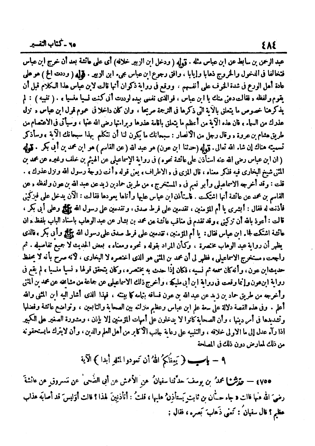 عبد الرَّحْمَن بن سابط عَن بن عَبَّاس مثله قَوْله وَدخل بن الزُّبَيْرِ خِلَافَهُ أَيْ عَلَى عَائِشَةَ بَعْدَ أَنْ خرج بن عَبَّاسٍ فَتَخَالَفَا فِي الدُّخُولِ وَالْخُرُوجِ ذَهَابًا وَإِيَابًا وَافق رُجُوع بن عَبَّاس مَجِيء بن الزُّبَيْرِ قَوْلُهُ وَدِدْتُ إِلَخْ هُوَ عَلَى عَادَةِ أَهْلِ الْوَرَعِ فِي شِدَّةِ الْخَوْفِ عَلَى أَنْفُسِهِمْ وَوَقَعَ فِي رِوَايَةِ ذَكْوَانَ أَنَّهَا قَالَتْ لِابْنِ عَبَّاسٍ هَذَا الْكَلَامَ قَبْلَ أَنْ يَقُومَ وَلَفْظُهُ فَقَالَت دَعْنِي مِنْك يَا بن عَبَّاسٍ فَوَالَّذِي نَفْسِي بِيَدِهِ لَوَدِدْتُ أَنِّي كُنْتُ نِسْيًا مَنْسِيًّا تَنْبِيهٌ لَمْ يَذْكُرْ هُنَا خُصُوصَ مَا يَتَعَلَّقُ بِالْآيَةِ الَّتِي ذَكَرَهَا فِي التَّرْجَمَةِ صَرِيحًا وَإِنْ كَانَ دَاخِلًا فِي عُمُومِ قَوْلِ بن عَبَّاسٍ نَزَلَ عُذْرُكِ مِنَ السَّمَاءِ فَإِنَّ هَذِهِ الْآيَةَ مِنْ أَعْظَمِ مَا يَتَعَلَّقُ بِإِقَامَةِ عُذْرِهَا وَبَرَاءَتِهَا رَضِيَ اللَّهُ عَنْهَا وَسَيَأْتِي فِي الِاعْتِصَامِ مِنْ طَرِيقِ هِشَامِ بْنِ عُرْوَةَ وَقَالَ رَجُلٌ مِنَ الْأَنْصَارِ سُبْحَانَكَ مَا يَكُونُ لَنَا أَنْ نتكلم بِهَذَا سُبْحَانَكَ الْآيَةَ وَسَأَذْكُرُ تَسْمِيَتَهُ هُنَاكَ إِنْ شَاءَ اللَّهُ تَعَالَى قَوْلُهُ حَدَّثَنَا بن عَوْنٍ هُوَ عَبْدُ اللَّهِ عَنِ الْقَاسِمِ هُوَ بن مُحَمَّد بن أبي بكر قَوْله ان بن عَبَّاسٍ رَضِيَ اللَّهُ عَنْهُ اسْتَأْذَنَ عَلَى عَائِشَةَ نَحْوَهُ فِي رِوَايَةِ الْإِسْمَاعِيلِيِّ عَنِ الْهَيْثَمِ بْنِ خَلَفٍ وَغَيْرِهِ عَنْ مُحَمَّدِ بْنِ الْمُثَنَّى شَيْخِ الْبُخَارِيِّ فِيهِ فَذَكَرَ مَعْنَاهُ قَالَ الْمِزِّيُّ فِي الْأَطْرَافِ يَعْنِي قَوْلَهُ أَنْتِ زَوْجَةُ رَسُولِ اللَّهِ وَنَزَلَ عُذْرُكِ قُلْتُ وَقَدْ أَخْرَجَهُ الْإِسْمَاعِيلِيُّ وَأَبُو نُعَيْمٍ فِي الْمُسْتَخْرَجِ مِنْ طَرِيقِ حَمَّادِ بْنِ زَيْدٍ عَنْ عَبْدِ اللَّهِ بْنِ عَوْنٍ وَلَفْظُهُ عَنِ الْقَاسِمِ بْنِ مُحَمَّدٍ عَنْ عَائِشَةَ أَنَّهَا اشتكت فَاسْتَأْذن بن عَبَّاسٍ عَلَيْهَا وَأَتَاهَا يَعُودُهَا فَقَالَتِ الْآنَ يَدْخُلُ عَلَيَّ فَيُزَكِّيَنِي فَأَذِنَتْ لَهُ فَقَالَ أَبْشِرِي يَا أُمَّ الْمُؤْمِنِينَ تُقْدِمِينَ عَلَى فَرَطِ صِدْقٍ وَتُقْدِمِينَ عَلَى رَسُولِ اللَّهِ صَلَّى اللَّهُ عَلَيْهِ وَسَلَّمَ وَعَلَى أَبِي بَكْرٍ قَالَتْ أَعُوذُ بِاللَّهِ أَنْ تُزَكِّيَنِي وَقَدْ تَقَدَّمَ فِي مَنَاقِبِ عَائِشَةَ عَنْ مُحَمَّدِ بْنِ بَشَّارٍ عَنْ عَبْدِ الْوَهَّابِ بِإِسْنَادِ الْبَاب بِلَفْظ أَن عَائِشَة اشتكت فجَاء بن عَبَّاسٍ فَقَالَ يَا أُمَّ الْمُؤْمِنِينَ تُقْدِمِينَ عَلَى فَرَطِ صِدْقٍ عَلَى رَسُولِ اللَّهِ صَلَّى اللَّهُ عَلَيْهِ وَسَلَّمَ وَأَبِي بَكْرٍ فَالَّذِي يَظْهَرُ أَنَّ رِوَايَةَ عَبْدِ الْوَهَّابِ مُخْتَصَرَةٌ وَكَأَنَّ الْمُرَادَ بِقَوْلِهِ نَحْوَهُ وَمَعْنَاهُ بَعْضُ الْحَدِيثِ لَا جَمِيعُ تَفَاصِيلِهِ ثُمَّ رَاجَعْتُ مُسْتَخْرَجَ الْإِسْمَاعِيلِيِّ فَظَهَرَ لِي أَنَّ مُحَمَّدَ بْنَ الْمُثَنَّى هُوَ الَّذِي اخْتَصَرَهُ لَا الْبُخَارِيُّ لِأَنَّهُ صَرَّحَ بِأَنَّهُ لَا يَحْفَظُ حَدِيثَ بن عَوْنٍ وَأَنَّهُ كَانَ سَمِعَهُ ثُمَّ نَسِيَهُ فَكَانَ إِذَا حَدَّثَ بِهِ يَخْتَصِرُهُ وَكَانَ يَتَحَقَّقُ قَوْلَهَا نسيا منسيا لم يَقع فِي رِوَايَة بن عون وَإِنَّمَا وَقعت فِي رِوَايَة بن أَبِي مُلَيْكَةَ وَأَخْرَجَ ذَلِكَ الْإِسْمَاعِيلِيُّ عَنْ جَمَاعَةٍ مِنْ مَشَايِخِهِ عَنْ مُحَمَّدِ بْنِ الْمُثَنَّى وَأَخْرَجَهُ مِنْ طَرِيقِ حَمَّادِ بْنِ زَيْدٍ عَنْ عَبْدِ اللَّهِ بْنِ عَوْنٍ فَسَاقَهُ بِتَمَامِهِ كَمَا بَيَّنْتُهُ فَهَذَا الَّذِي أَشَارَ إِلَيْهِ بن الْمُثَ