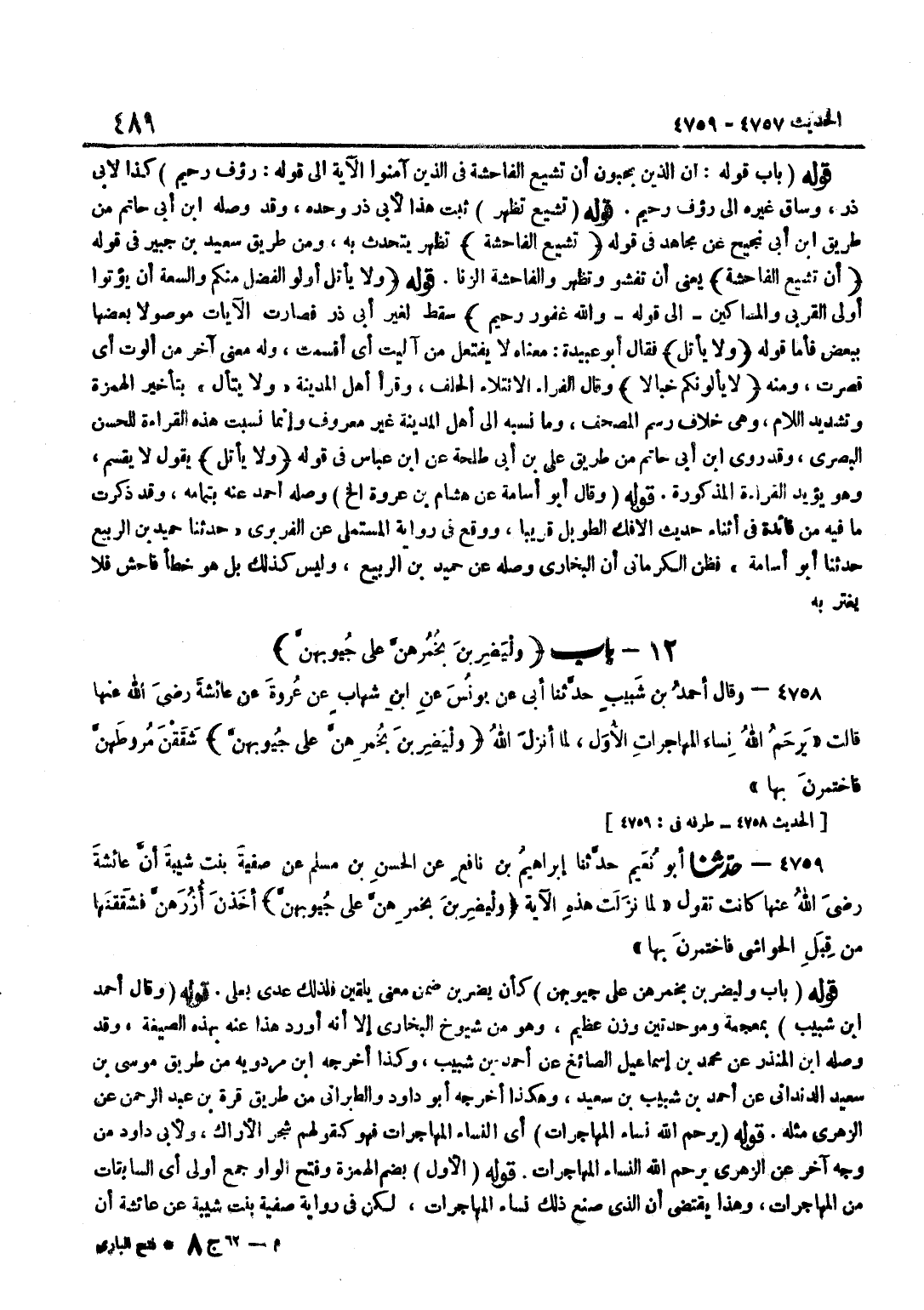 [4758] قَوْله وَقَالَ أَحْمَدُ بْنُ شَبِيبٍ بِمُعْجَمَةٍ وَمُوَحَّدَتَيْنِ وَزْنُ عَظِيمٍ وَهُوَ مِنْ شُيُوخِ الْبُخَارِيِّ إِلَّا أَنَّهُ أَوْرَدَ هَذَا عَنهُ بِهَذِهِ الصِّيغَة وَقد وَصله بن الْمُنْذِرِ عَنْ مُحَمَّدِ بْنِ إِسْمَاعِيلَ الصَّائِغِ عَنْ أَحْمد بن شبيب وَكَذَا أخرجه بن مَرْدَوَيْهِ مِنْ طَرِيقِ مُوسَى بْنِ سَعِيدِ الدَّنْدَانِيِّ عَنْ أَحْمَدَ بْنِ شَبِيبِ بْنِ سَعِيدٍ وَهَكَذَا أَخْرَجَهُ أَبُو دَاوُدَ وَالطَّبَرَانِيُّ مِنْ طَرِيقِ قُرَّةَ بْنِ عَبْدِ الرَّحْمَنِ عَنِ الزُّهْرِيِّ مِثْلَهُ قَوْلُهُ يَرْحَمُ اللَّهُ نِسَاءَ الْمُهَاجِرَاتِ أَيِ النِّسَاءَ الْمُهَاجِرَاتِ فَهُوَ كَقَوْلِهِمْ شَجَرُ الْأَرَاكِ وَلِأَبِي دَاوُدَ مِنْ وَجْهٍ آخَرَ عَنِ الزُّهْرِيِّ يَرْحَمُ اللَّهَ النِّسَاءَ الْمُهَاجِرَاتِ قَوْلُهُ الْأُوَلَ بِضَمِّ الْهَمْزَةِ وَفَتْحِ الْوَاوِ جَمْعُ أُولَى أَيِ السَّابِقَاتِ مِنَ الْمُهَاجِرَاتِ وَهَذَا يَقْتَضِي أَنَّ الَّذِي صَنَعَ ذَلِكَ نِسَاءُ الْمُهَاجِرَاتِ لَكِنْ فِي رِوَايَةِ صَفِيَّةَ بِنْتِ شَيْبَةَ عَنْ عَائِشَة أَن