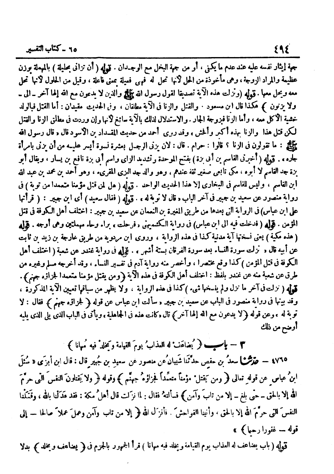 [4763] اخْتَلَفَ أَهْلُ الْكُوفَةِ فِي قَتْلِ الْمُؤْمِنِ كَذَا وَقَعَ مُخْتَصَرًا وَأَخْصَرُ مِنْهُ رِوَايَةُ آدَمَ فِي تَفْسِيرِ النِّسَاءِ وَقَدْ أَخْرَجَهُ مُسْلِمٌ وَغَيْرُهُ مِنْ طُرُقٍ عَنْ شُعْبَةَ مِنْهُ عَنْ غُنْدَرٍ بِلَفْظِ اخْتَلَفَ أَهْلُ الْكُوفَةِ فِي هَذِهِ الْآيَةِ وَمَنْ يَقْتُلْ مُؤْمِنًا مُتَعَمِّدًا فَجَزَاؤُهُ جَهَنَّمُ قَوْلُهُ نَزَلَتْ فِي آخِرِ مَا نَزَلَ وَلَمْ يَنْسَخْهَا شَيْءٌ كَذَا فِي هَذِهِ الرِّوَايَةِ وَلَا يَظْهَرُ مِنْ سِيَاقِهَا تَعْيِينُ الْآيَةِ الْمَذْكُورَةِ وَقَدْ بَيَّنَهَا فِي رِوَايَةِ مَنْصُورٍ فِي الْبَابِ عَنْ سعيد بن جُبَير سَأَلت بن عَبَّاس عَن قَوْله فَجَزَاؤُهُ جَهَنَّم فَقَالَ لَا تَوْبَةَ لَهُ وَعَنْ قَوْلِهِ لَا يَدْعُونَ مَعَ اللَّهِ إِلَهًا آخَرَ قَالَ كَانَتْ هَذِهِ فِي الْجَاهِلِيَّةِ وَيَأْتِي فِي الْبَابِ الَّذِي يَلِي الَّذِي يَلِيهِ أوضح من ذَلِك
