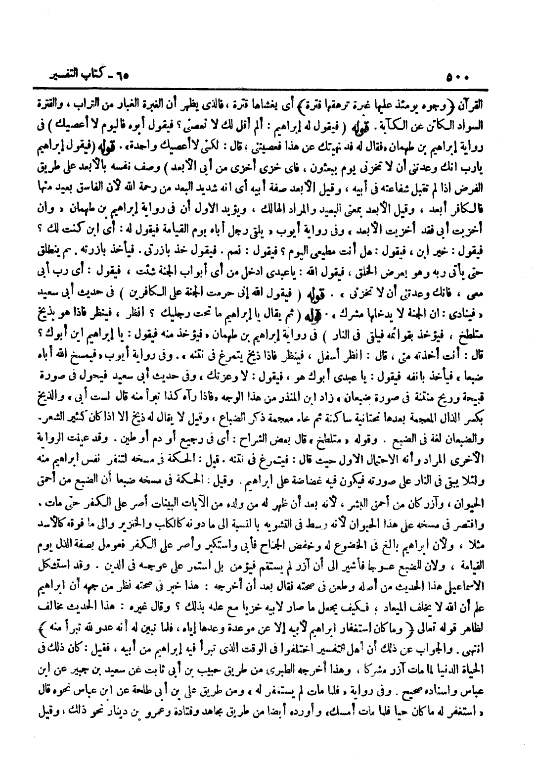 الْقُرْآن وُجُوه يَوْمئِذٍ عَلَيْهَا غبرة ترهقها قترة أَيْ يَغْشَاهَا قَتَرَةٌ فَالَّذِي يَظْهَرُ أَنَّ الْغَبَرَةَ الْغُبَارُ مِنَ التُّرَابِ وَالْقَتَرَةُ السَّوَادُ الْكَائِنُ عَنِ الْكَآبَةِ قَوْلُهُ فَيَقُولُ لَهُ إِبْرَاهِيمُ أَلَمْ أَقُلْ لَكَ لَا تَعْصِنِي فَيَقُولُ أَبُوهُ فَالْيَوْمُ لَا أَعْصِيكَ فِي رِوَايَةِ إِبْرَاهِيمَ بْنِ طَهْمَانَ فَقَالَ لَهُ قَدْ نَهَيْتُكَ عَنْ هَذَا فَعَصَيْتَنِي قَالَ لَكِنِّي لَا أَعْصِيكَ وَاحِدَةً قَوْلُهُ فَيَقُولُ إِبْرَاهِيمُ يَا رَبِّ إِنَّكَ وَعَدْتَنِي أَنْ لَا تُخْزِنِي يَوْمَ يُبْعَثُونَ فَأَيُّ خِزْيٍ أَخْزَى مِنْ أَبِي الْأَبْعَدِ وَصَفَ نَفْسَهُ بِالْأَبْعَدِ عَلَى طَرِيقِ الْفَرْضِ إِذَا لَمْ تُقْبَلْ شَفَاعَتُهُ فِي أَبِيهِ وَقِيلَ الْأَبْعَدُ صِفَةُ أَبِيهِ أَيْ أَنَّهُ شَدِيدُ الْبُعْدِ مِنْ رَحْمَةِ اللَّهِ لِأَنَّ الْفَاسِقَ بَعِيدٌ مِنْهَا فَالْكَافِرٌ أَبْعَدٌ وَقِيلَ الْأَبْعَدُ بِمَعْنَى الْبَعِيدَ وَالْمُرَادُ الْهَالِكُ وَيُؤَيِّدُ الْأَوَّلَ أَنَّ فِي رِوَايَةِ إِبْرَاهِيمَ بْنِ طَهْمَانَ وَإِنْ أَخْزَيْتَ أَبِي فَقَدْ أَخْزَيْتَ الْأَبْعَدَ وَفِي رِوَايَةِ أَيُّوبَ يَلْقَى رَجُلٌ أَبَاهُ يَوْمَ الْقِيَامَةِ فَيَقُولُ لَهُ أَيُّ ابْنٍ كُنْتَ لَك فَيَقُول خير بن فَيَقُولُ هَلْ أَنْتَ مُطِيعِي الْيَوْمَ فَيَقُولُ نَعَمْ فَيَقُول خُذ بازرتي فَيَأْخُذ بازرته تمّ يَنْطَلِقُ حَتَّى يَأْتِيَ رَبَّهُ وَهُوَ يَعْرِضُ الْخَلْقَ فَيَقُولُ اللَّهُ يَا عَبْدِي ادْخُلْ مِنْ أَيِّ أَبْوَابِ الْجَنَّةِ شِئْتَ فَيَقُولُ أَيْ رَبِّ أَبِي مَعِي فَإِنَّكَ وَعَدْتَنِي أَنْ لَا تُخْزِنِي قَوْلُهُ فَيَقُولُ اللَّهُ إِنِّي حَرَّمْتُ الْجَنَّةَ عَلَى الْكَافِرِينَ فِي حَدِيثِ أَبِي سَعِيدٍ فَيُنَادَى إِنَّ الْجَنَّةَ لَا يَدْخُلُهَا مُشْرِكٌ قَوْلُهُ ثُمَّ يُقَالُ يَا إِبْرَاهِيمَ مَا تَحْتَ رِجْلَيْكَ انْظُرْ فَيَنْظُرُ فَإِذَا هُوَ بِذِيخٍ مُتَلَطِّخٍ فَيُؤْخَذُ بِقَوَائِمِهِ فَيُلْقَى فِي النَّارِ فِي رِوَايَةِ إِبْرَاهِيمَ بْنِ طَهْمَانَ فَيُؤْخَذُ مِنْهُ فَيَقُولُ يَا إِبْرَاهِيمُ أَيْنَ أَبُوكَ قَالَ أَنْتَ أَخَذْتَهُ مِنِّي قَالَ انْظُرْ أَسْفَلَ فَيَنْظُرُ فَإِذَا ذِيخٌ يَتَمَرَّغُ فِي نَتْنِهِ وَفِي رِوَايَةِ أَيُّوبَ فَيَمْسَخُ اللَّهُ أَبَاهُ ضَبُعًا فَيَأْخُذُ بِأَنْفِهِ فَيَقُولُ يَا عَبْدِي أَبُوكَ هُوَ فَيَقُولُ لَا وَعِزَّتِكَ وَفِي حَدِيثِ أَبِي سَعِيدٍ فَيُحَوَّلُ فِي صُورَةٍ قَبِيحَةٍ وَرِيحٍ مُنْتِنَةٍ فِي صُورَةِ ضِبْعَانَ زَاد بن الْمُنْذِرِ مِنْ هَذَا الْوَجْهِ فَإِذَا رَآهُ كَذَا تَبَرَّأَ مِنْهُ قَالَ لَسْتَ أَبِي وَالذِّيخُ بِكَسْرِ الذَّالِ الْمُعْجَمَةِ بَعْدَهَا تَحْتَانِيَّةٍ سَاكِنَةٍ ثُمَّ خَاءٍ مُعْجَمَةٍ ذَكَرُ الضِّبَاعِ وَقِيلَ لَا يُقَالُ لَهُ ذِيخٌ إِلَّا إِذَا كَانَ كَثِيرَ الشَّعْرِ وَالضِّبْعَانُ لُغَةٌ فِي الضَّبْعِ وَقَوْلُهُ مُتَلَطِّخٌ قَالَ بَعْضُ الشُّرَّاحِ أَيْ فِي رَجِيعٍ أَوْ دَمٍ أَوْ طِينٍ وَقَدْ عَيَّنَتِ الرِّوَايَةُ الْأُخْرَى الْمُرَادَ وَأَنَّهُ الِاحْتِمَالُ الْأَوَّلُ حَيْثُ قَالَ فَيَتَمَرَّغُ فِي نَتْنِهِ قِيلَ الْحِكْمَةُ فِي مَسْخِهِ لِتَنْفِرَ نَفْسُ إِبْرَاهِيمَ مِنْهُ وَلِئَلَّا يَبْقَى فِي النَّارِ عَلَى صُورَتِهِ فَيَكُونُ فِيهِ غَضَاضَةٌ عَلَى إِبْرَاهِيمَ وَقِيلَ الْحِكْمَةُ فِي مَسْخِهِ ضَبْعًا أَنَّ الضَّبْعَ مِنْ أَحْمَقِ الْحَيَوَانِ وَآزَرَ كَانَ مِنْ أَحْمَقِ الْبَشَرِ لِأَنَّهُ بَعْدَ أَنْ ظَهَرَ لَهُ مِنْ وَلَدِهِ مِنَ الْآيَاتِ الْبَيِّنَاتِ أَصَرَّ عَلَى الْكُفْرِ حَتَّى مَاتَ وَاقْتَصَرَ فِي مَسْخِهِ عَلَى هَذَا ال