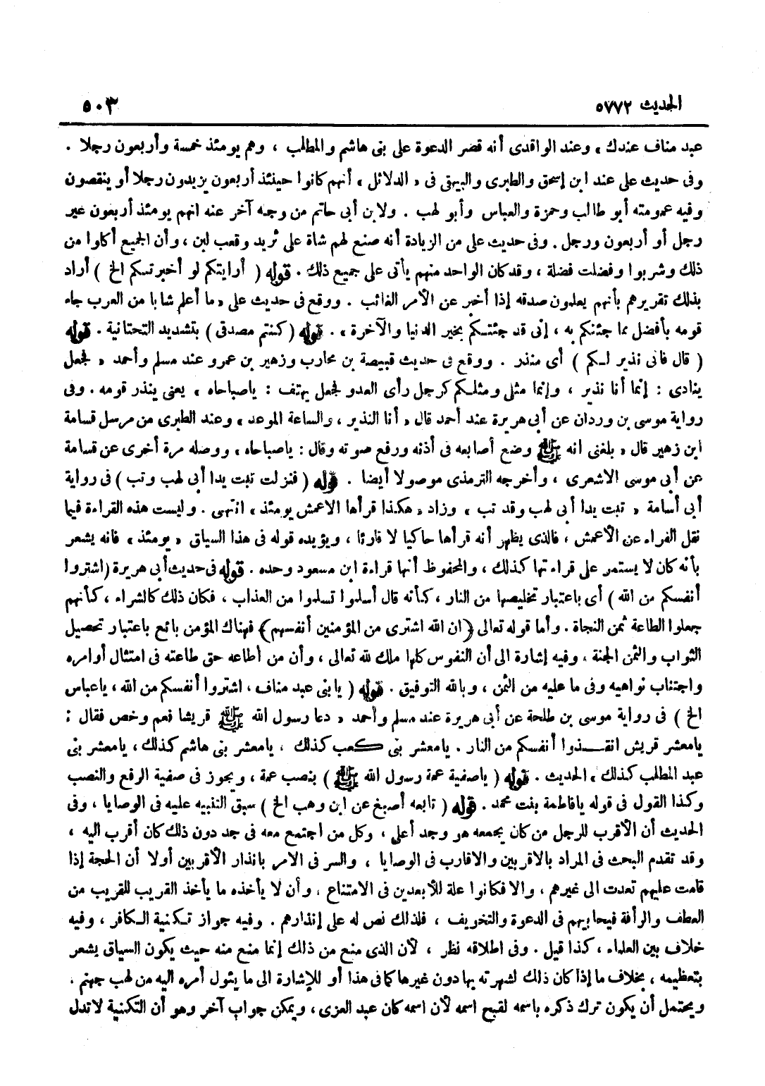 عَبْدِ مَنَافٍ عِنْدَكَ وَعِنْدَ الْوَاقِدِيِّ أَنَّهُ قَصَرَ الدَّعْوَةَ عَلَى بَنِي هَاشِمٍ وَالْمُطَّلِبِ وَهُمْ يَوْمَئِذٍ خَمْسَةٌ وَأَرْبَعُونَ رَجُلًا وَفِي حَدِيثِ عَلِيٍّ عِنْدَ بن إِسْحَاقَ وَالطَّبَرِيِّ وَالْبَيْهَقِيِّ فِي الدَّلَائِلِ أَنَّهُمْ كَانُوا حِينَئِذٍ أَرْبَعُونَ يَزِيدُونَ رَجُلًا أَوْ يَنْقُصُونَ وَفِيهِ عُمُومَتُهُ أَبُو طَالِبٍ وَحَمْزَةُ وَالْعَبَّاسُ وَأَبُو لَهَبٍ وَلِابْنِ أَبِي حَاتِمٍ مِنْ وَجْهٍ آخَرَ عَنْهُ أَنَّهُمْ يَوْمَئِذٍ أَرْبَعُونَ غَيْرَ رَجُلٍ أَوْ أَرْبَعُونَ وَرَجُلٌ وَفِي حَدِيثِ عَلِيٍّ مِنَ الزِّيَادَةِ أَنَّهُ صَنَعَ لَهُمْ شَاةً عَلَى ثَرِيدٍ وَقَعْبِ لَبَنٍ وَأَنَّ الْجَمِيعَ أَكَلُوا مِنْ ذَلِكَ وَشَرِبُوا وَفَضَلَتْ فَضْلَةٌ وَقَدْ كَانَ الْوَاحِدُ مِنْهُمْ يَأْتِي عَلَى جَمِيعِ ذَلِكَ قَوْلُهُ أَرَأَيْتُكُمْ لَوْ أَخْبَرْتُكُمْ إِلَخْ أَرَادَ بِذَلِكَ تَقْرِيرَهُمْ بِأَنَّهُمْ يَعْلَمُونَ صِدْقَهُ إِذَا أَخْبَرَ عَنِ الْأَمْرِ الْغَائِبِ وَوَقَعَ فِي حَدِيثِ عَلِيٍّ مَا أَعْلَمُ شَابًّا مِنَ الْعَرَبِ جَاءَ قَوْمُهُ بِأَفْضَلَ مِمَّا جِئْتُكُمْ بِهِ إِنِّي قَدْ جِئْتُكُمْ بِخَيْرِ الدُّنْيَا وَالْآخِرَةِ قَوْلُهُ كُنْتُمْ مُصَدِّقِيَّ بِتَشْدِيدِ التَّحْتَانِيَّةِ قَوْلُهُ قَالَ فَإِنِّي نَذِيرٌ لَكُمْ أَيْ مُنْذِرٌ وَوَقَعَ فِي حَدِيثِ قَبِيصَةَ بْنِ مُحَارِبٍ وَزُهَيْرِ بْنِ عَمْرٍو عِنْدَ مُسْلِمٍ وَأَحْمَدَ فَجَعَلَ يُنَادِي إِنَّمَا أَنَا نَذِيرٌ وَإِنَّمَا مَثَلِي وَمَثَلُكُمْ كَرَجُلٍ رَأَى الْعَدُوَّ فَجَعَلَ يَهْتِفُ يَا صَبَاحَاهُ يَعْنِي يُنْذِرُ قَوْمَهُ وَفِي رِوَايَةِ مُوسَى بْنِ وَرْدَانَ عَنْ أَبِي هُرَيْرَةَ عِنْدَ أَحْمَدَ قَالَ أَنَا النَّذِيرُ وَالسَّاعَةُ الْمَوْعِدُ وَعِنْدَ الطَّبَرِيِّ مِنْ مُرْسَلِ قَسَامَةَ بْنِ زُهَيْرٍ قَالَ بَلَغَنِي أَنَّهُ صَلَّى اللَّهُ عَلَيْهِ وَسَلَّمَ وَضَعَ أَصَابِعَهُ فِي أُذُنِهِ وَرَفَعَ صَوْتَهُ وَقَالَ يَا صَبَاحَاهُ وَوَصَلَهُ مَرَّةً أُخْرَى عَنْ قَسَامَةَ عَنْ أَبِي مُوسَى الْأَشْعَرِيِّ وَأَخْرَجَهُ التِّرْمِذِيُّ مَوْصُولًا أَيْضًا قَوْلُهُ فَنَزَلَتْ تَبَّتْ يَدَا أَبِي لَهَبٍ وَتَبَّ فِي رِوَايَةِ أَبِي أُسَامَةَ تَبَّتْ يَدَا أَبِي لَهَبٍ وَقَدْ تَبَّ وَزَادَ هَكَذَا قَرَأَهَا الْأَعْمَشُ يَوْمَئِذٍ انْتَهَى وَلَيْسَتْ هَذِهِ الْقِرَاءَةُ فِيمَا نَقَلَ الْفَرَّاءُ عَنِ الْأَعْمَشِ فَالَّذِي يَظْهَرُ أَنَّهُ قَرَأَهَا حَاكِيًا لَا قَارِئًا وَيُؤَيِّدُهُ قَوْلُهُ فِي هَذَا السِّيَاقِ يَوْمَئِذٍ فَإِنَّهُ يُشْعِرُ بِأَنَّهُ كَانَ لَا يَسْتَمِرُّ على قرَاءَتهَا كَذَلِك وَالْمَحْفُوظ أَنَّهَا قِرَاءَة بن مَسْعُودٍ وَحْدَهُ قَوْلُهُ فِي حَدِيثِ أَبِي هُرَيْرَةَ اشْتَرُوا أَنْفُسَكُمْ مِنَ اللَّهِ أَيْ بِاعْتِبَارِ تَخْلِيصِهَا مِنَ النَّارِ كَأَنَّهُ قَالَ أَسْلِمُوا تَسْلَمُوا مِنَ الْعَذَابِ فَكَانَ ذَلِكَ كَالشِّرَاءِ كَأَنَّهُمْ جَعَلُوا الطَّاعَةَ ثَمَنَ النَّجَاةِ وَأَمَّا قَوْلِهِ تَعَالَى إِنَّ اللَّهَ اشْتَرَى مِنَ الْمُؤْمِنِينَ أنفسهم فَهُنَاكَ الْمُؤْمِنُ بَائِعٌ بِاعْتِبَارِ تَحْصِيلِ الثَّوَابِ وَالثَّمَنُ الْجَنَّةُ وَفِيهِ إِشَارَةٌ إِلَى أَنَّ النُّفُوسَ كُلَّهَا مِلْكٌ لِلَّهِ تَعَالَى وَأَنَّ مَنْ أَطَاعَهُ حَقَّ طَاعَته فِي امْتِثَال أوامره وَاجْتنَاب نواهيه وَفِي مَا عَلَيْهِ مِنَ الثَّمَنِ وَبِاللَّهِ التَّوْفِيقِ