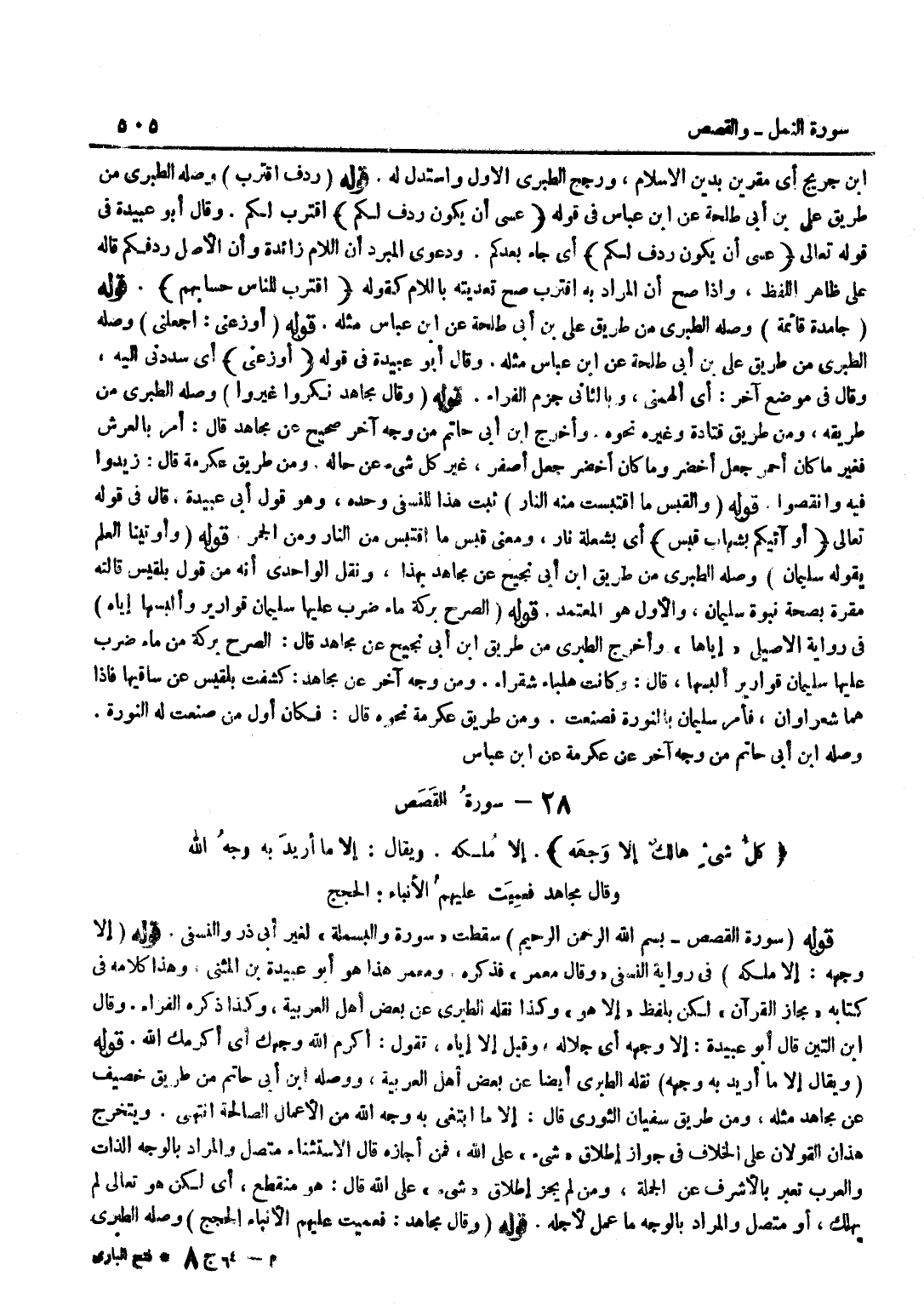 سَقَطَتْ سُورَةُ وَالْبَسْمَلَةُ لِغَيْرِ أَبِي ذَرٍّ وَالنَّسَفِيِّ قَوْلُهُ إِلَّا وَجْهَهُ إِلَّا مُلْكَهُ فِي رِوَايَةِ النَّسَفِيِّ وَقَالَ مَعْمَرٌ فَذَكَرَهُ وَمَعْمَرٌ هَذَا هُوَ أَبُو عُبَيْدَةَ بْنُ الْمُثَنَّى وَهَذَا كَلَامُهُ فِي كِتَابِهِ مَجَازُ الْقُرْآنِ لَكِنْ بِلَفْظِ إِلَّا هُوَ وَكَذَا نَقَلَهُ الطَّبَرِيُّ عَنْ بَعْضِ أَهْلِ الْعَرَبِيَّةِ وَكَذَا ذكره الْفراء وَقَالَ بن التِّينِ قَالَ أَبُو عُبَيْدَةَ إِلَّا وَجْهَهُ أَيْ جَلَالَهُ وَقِيلَ إِلَّا إِيَّاهُ تَقُولُ أَكْرَمَ اللَّهُ وَجْهَكَ أَيْ أَكْرَمَكَ اللَّهُ قَوْلُهُ وَيُقَالُ إِلَّا مَا أُرِيدَ بِهِ وَجْهُهُ نَقَلَهُ الطَّبَرِيُّ أَيْضًا عَن بعض أهل الْعَرَبيَّة وَوَصله بن أَبِي حَاتِمٍ مِنْ طَرِيقِ خُصَيْفٍ عَنْ مُجَاهِدٍ مِثْلَهُ وَمِنْ طَرِيقِ سُفْيَانَ الثَّوْرِيِّ قَالَ إِلَّا مَا ابْتُغِيَ بِهِ وَجْهُ اللَّهِ مِنَ الْأَعْمَالِ الصَّالِحَةِ انْتَهَى وَيَتَخَرَّجُ هَذَانِ الْقَوْلَانِ عَلَى الْخِلَافِ فِي جَوَازِ إِطْلَاقِ شَيْءٍ عَلَى اللَّهِ فَمَنْ أَجَازَهُ قَالَ الِاسْتِثْنَاءُ مُتَّصِلٌ وَالْمُرَادُ بِالْوَجْهِ الذَّاتُ وَالْعَرَبُ تُعَبِّرُ بِالْأَشْرَفِ عَنِ الْجُمْلَةِ وَمَنْ لَمْ يُجِزْ إِطْلَاقَ شَيْءٍ عَلَى اللَّهِ قَالَ هُوَ مُنْقَطِعٌ أَيْ لَكِنْ هُوَ تَعَالَى لَمْ يَهْلِكْ أَوْ مُتَّصِلٌ وَالْمُرَادُ بِالْوَجْهِ مَا عُمِلَ لِأَجْلِهِ قَوْلُهُ وَقَالَ مُجَاهِدٌ فَعَمِيَتْ عَلَيْهِمُ الْأَنْبَاءُ الْحُجَجُ وَصله الطَّبَرِيّ من طَرِيق بن أَبِي نَجِيحٍ عَنْهُ