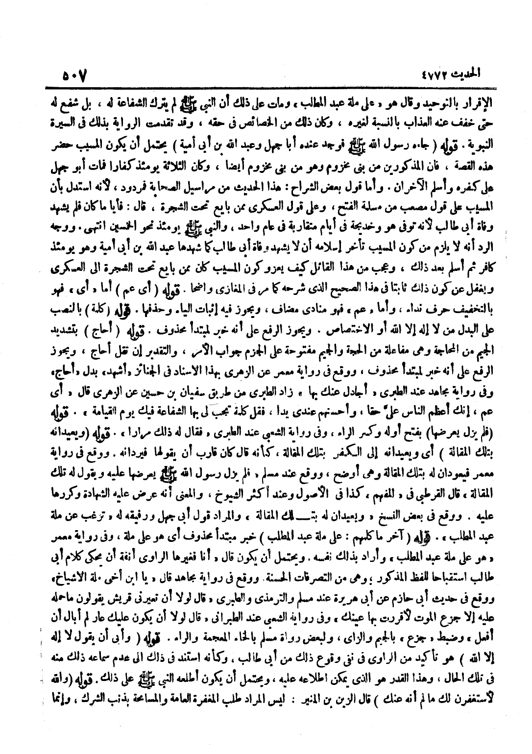 الْإِقْرَارِ بِالتَّوْحِيدِ وَقَالَ هُوَ عَلَى مِلَّةِ عَبْدِ الْمُطَّلِبِ وَمَاتَ عَلَى ذَلِكَ أَنَّ النَّبِيَّ صَلَّى اللَّهُ عَلَيْهِ وَسَلَّمَ لَمْ يَتْرُكِ الشَّفَاعَةَ لَهُ بَلْ شَفَعَ لَهُ حَتَّى خُفِّفَ عَنْهُ الْعَذَابُ بِالنِّسْبَةِ لِغَيْرِهِ وَكَانَ ذَلِكَ مِنَ الْخَصَائِصِ فِي حَقِّهِ وَقَدْ تَقَدَّمَتِ الرِّوَايَةُ بِذَلِكَ فِي السِّيرَةِ النَّبَوِيَّة قَوْله جَاءَهُ رَسُولُ اللَّهِ صَلَّى اللَّهُ عَلَيْهِ وَسَلَّمَ فَوَجَدَ عِنْدَهُ أَبَا جَهْلٍ وَعَبْدَ اللَّهِ بْنَ أَبِي أُمَيَّةَ يَحْتَمِلُ أَنْ يَكُونَ الْمُسَيَّبُ حَضَرَ هَذِهِ الْقِصَّةَ فَإِنَّ الْمَذْكُورِينَ مِنْ بَنِي مَخْزُومٍ وَهُوَ مِنْ بَنِي مَخْزُومٍ أَيْضًا وَكَانَ الثَّلَاثَةُ يَوْمَئِذٍ كُفَّارًا فَمَاتَ أَبُو جَهْلٍ عَلَى كُفْرِهِ وَأَسْلَمَ الْآخَرَانِ وَأَمَّا قَوْلُ بَعْضِ الشُّرَّاحِ هَذَا الْحَدِيثُ مِنْ مَرَاسِيلِ الصَّحَابَةِ فَمَرْدُودٌ لِأَنَّهُ اسْتَدَلَّ بِأَنَّ الْمُسَيَّبَ عَلَى قَوْلِ مُصْعَبٍ مِنْ مُسْلِمَةِ الْفَتْحِ وَعَلَى قَوْلِ الْعَسْكَرِيِّ مِمَّنْ بَايَعَ تَحْتَ الشَّجَرَةِ قَالَ فَأَيًّا مَا كَانَ فَلَمْ يَشْهَدْ وَفَاةَ أَبِي طَالِبٍ لِأَنَّهُ تُوُفِّيَ هُوَ وَخَدِيجَةُ فِي أَيَّامٍ مُتَقَارِبَةٍ فِي عَامٍ وَاحِدٍ وَالنَّبِيُّ صَلَّى اللَّهُ عَلَيْهِ وَسَلَّمَ يَوْمَئِذٍ نَحْوَ الْخَمْسِينَ انْتَهَى وَوَجْهُ الرَّدِّ أَنَّهُ لَا يَلْزَمُ مِنْ كَوْنِ الْمُسَيَّبِ تَأَخَّرَ إِسْلَامُهُ أَنْ لَا يَشْهَدَ وَفَاةَ أَبِي طَالِبٍ كَمَا شَهِدَهَا عَبْدُ اللَّهِ بْنُ أَبِي أُمَيَّةَ وَهُوَ يَوْمَئِذٍ كَافِرٌ ثُمَّ أَسْلَمَ بَعْدَ ذَلِكَ وَعَجَبٌ مِنْ هَذَا الْقَائِلُ كَيْفَ يَعْزُو كَوْنَ الْمُسَيَّبِ كَانَ مِمَّنْ بَايَعَ تَحْتَ الشَّجَرَةِ إِلَى الْعَسْكَرِيِّ وَيَغْفُلُ عَنْ كَوْنِ ذَلِكَ ثَابِتًا فِي هَذَا الصَّحِيحِ الَّذِي شَرَحَهُ كَمَا مَرَّ فِي الْمَغَازِي وَاضِحًا قَوْلُهُ أَيْ عَمِّ أَمَّا أَيْ فَهُوَ بِالتَّخْفِيفِ حَرْفُ نِدَاءٍ وَأَمَّا عَمِّ فَهُوَ مُنَادَى مُضَافٌ وَيَجُوزُ فِيهِ إِثْبَاتُ الْيَاءِ وَحَذْفُهَا قَوْلُهُ كَلِمَةً بِالنَّصْبِ عَلَى الْبَدَلِ مِنْ لَا إِلَهَ إِلَّا اللَّهُ أَوْ الِاخْتِصَاصِ وَيَجُوزُ الرَّفْعُ عَلَى أَنَّهُ خَبَرٌ لِمُبْتَدَأٍ مَحْذُوفٍ قَوْلُهُ أُحَاجَّ بِتَشْدِيدِ الْجِيمِ مِنَ الْمُحَاجَّةِ وَهِيَ مُفَاعَلَةٌ مِنَ الْحُجَّةِ وَالْجِيمُ مَفْتُوحَةٌ عَلَى الْجَزْمِ جَوَابُ الْأَمْرِ وَالتَّقْدِيرُ إِنْ تَقُلْ أُحَاجَّ وَيَجُوزُ الرَّفْعُ عَلَى أَنَّهُ خَبَرٌ لِمُبْتَدَأٍ مَحْذُوفٍ وَوَقَعَ فِي رِوَايَةِ مَعْمَرٍ عَنِ الزُّهْرِيِّ بِهَذَا الْإِسْنَادِ فِي الْجَنَائِزِ أَشْهَدُ بَدَلَ أُحَاجَّ وَفِي رِوَايَةِ مُجَاهِدٍ عِنْدَ الطَّبَرِيِّ أُجَادِلُ عَنْكَ بِهَا زَادَ الطَّبَرِيُّ مِنْ طَرِيقِ سُفْيَانَ بْنِ حُسَيْنٍ عَنِ الزُّهْرِيِّ قَالَ أَيْ عَمِّ إِنَّكَ أَعْظَمُ النَّاسِ عَلَيَّ حَقًّا وَأَحْسَنُهُمْ عِنْدِي يَدًا فَقُلْ كَلِمَةً تَجِبُ لِي بِهَا الشَّفَاعَةُ فِيكَ يَوْمَ الْقِيَامَةِ قَوْلُهُ فَلَمْ يَزَلْ يَعْرِضُهَا بِفَتْحِ أَوَّلِهِ وَكَسْرِ الرَّاءِ وَفِي رِوَايَةِ الشَّعْبِيِّ عِنْدَ الطَّبَرِيِّ فَقَالَ لَهُ ذَلِك مرَارًا قَوْله وَيُعِيد أَنه بِتِلْكَ الْمَقَالَةِ أَيْ وَيُعِيدَانِهِ إِلَى الْكُفْرِ بِتِلْكَ الْمَقَالَةِ كَأَنَّهُ قَالَ كَانَ قَارَبَ أَنْ يَقُولَهَا فَيَرُدَّانِهِ وَوَقَعَ فِي رِوَايَةِ مَعْمَرٍ فَيَعُودَانِ لَهُ بِتِلْكَ الْمَقَالَةِ وَهِيَ أَوْضَحُ وَوَقَعَ عِنْدَ مُسْلِمٍ فَلَمْ يَزَلْ رَسُولُ اللَّهِ صَلَّى اللَّهُ عَلَيْهِ وَسَلَّمَ يَعْرِضُهَا عَلَيْ