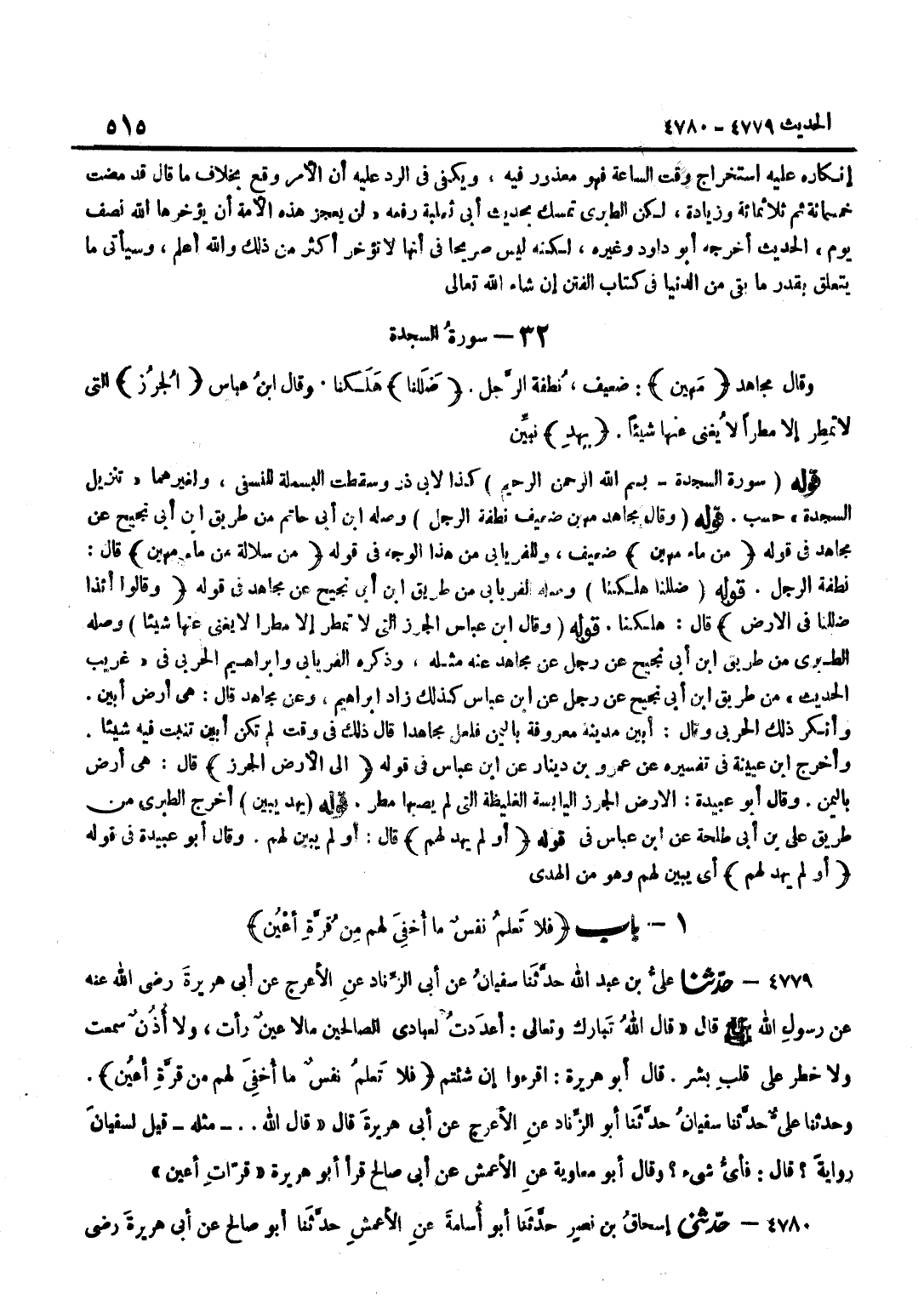 كَذَا لِأَبِي ذَرٍّ وَسَقَطَتِ الْبَسْمَلَةُ لِلنَّسَفِيِّ وَلِغَيْرِهِمَا تَنْزِيلُ السَّجْدَةِ حَسْبَ قَوْلُهُ وَقَالَ مُجَاهِدٌ مَهِينٌ ضَعِيف نُطْفَة الرجل وَصله بن أبي حَاتِم من طَرِيق بن أَبِي نَجِيحٍ عَنْ مُجَاهِدٍ فِي قَوْلِهِ مِنْ مَاء مهين ضَعِيفٍ وَلِلْفِرْيَابِيِّ مِنْ هَذَا الْوَجْهِ فِي قَوْلِهِ من سلالة من مَاء مهين قَالَ نُطْفَةُ الرَّجُلِ قَوْلُهُ ضَلَلْنَا هَلَكْنَا وَصَلَهُ الْفرْيَابِيّ من طَرِيق بن أَبِي نَجِيحٍ عَنْ مُجَاهِدٍ فِي قَوْلِهِ وَقَالُوا أئذا ضللنا فِي الأَرْض قَالَ هلكنا قَوْله وَقَالَ بن عَبَّاس الجرز الَّتِي لَا تمطر إِلَّا مَطَرا لَا يُغْنِي عَنْهَا شَيْئًا وَصَلَهُ الطَّبَرِيُّ مِنْ طَرِيق بن أَبِي نَجِيحٍ عَنْ رَجُلٍ عَنْ مُجَاهِدٍ عَنْهُ مِثْلَهُ وَذَكَرَهُ الْفِرْيَابِيُّ وَإِبْرَاهِيمُ الْحَرْبِيُّ فِي غَرِيبِ الحَدِيث من طَرِيق بن أبي نجيح عَن رجل عَن بن عَبَّاسٍ كَذَلِكَ زَادَ إِبْرَاهِيمُ وَعَنْ مُجَاهِدٍ قَالَ هِيَ أَرْضُ أَبْيَنَ وَأَنْكَرَ ذَلِكَ الْحَرْبِيُّ وَقَالَ أَبْيَنُ مَدِينَةٌ مَعْرُوفَةٌ بِالْيَمَنِ فَلَعَلَّ مُجَاهِدًا قَالَ ذَلِكَ فِي وَقْتٍ لَمْ تَكُنْ أَبْيَنُ تُنْبِتُ فِيهِ شَيْئا وَأخرج بْنُ عُيَيْنَةَ فِي تَفْسِيرِهِ عَنْ عَمْرِو بْنِ دِينَارٍ عَن بن عَبَّاس فِي قَوْله إِلَى الأَرْض الجرز قَالَ هِيَ أَرْضٌ بِالْيَمَنِ وَقَالَ أَبُو عُبَيْدَةَ الْأَرْضُ الْجُرُزُ الْيَابِسَةُ الْغَلِيظَةُ الَّتِي لَمْ يُصِبْهَا مَطَرٌ قَوْلُهُ يَهْدِ يُبَيِّنْ أَخْرَجَ الطَّبَرِيُّ مِنْ طَرِيقِ عَلِيِّ بْنِ أَبِي طَلْحَةَ عَنِ بْنِ عَبَّاس فِي قَوْله أَو لم يهد لَهُم قَالَ أَو لم يُبَيِّنْ لَهُمْ وَقَالَ أَبُو عُبَيْدَةَ فِي قَوْلِهِ أَو لم يهد لَهُم أَيْ يُبَيِّنْ لَهُمْ وَهُوَ مِنَ الْهُدَى