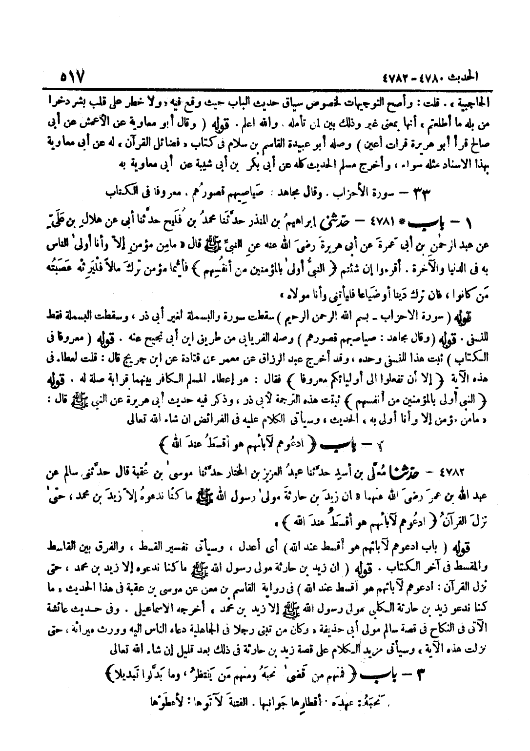 سَقَطَتْ سُورَةُ وَالْبَسْمَلَةُ لِغَيْرِ أَبِي ذَرٍّ وَسَقَطَتِ الْبَسْمَلَةُ فَقَطْ لِلنَّسَفِيِّ قَوْلُهُ وَقَالَ مُجَاهِدٌ صَيَاصِيهِمْ قصورهم وَصله الْفرْيَابِيّ من طَرِيق بن أَبِي نَجِيحٍ عَنْهُ قَوْلُهُ مَعْرُوفًا فِي الْكِتَابِ ثَبَتَ هَذَا لِلنَّسَفِيِّ وَحْدَهُ وَقَدْ أَخْرَجَ عَبْدُ الرَّزَّاقِ عَنْ مَعْمَرٍ عَنْ قَتَادَةَ عَنْ بن جُرَيْجٍ قَالَ قُلْتُ لِعَطَاءٍ فِي هَذِهِ الْآيَةِ إِلَّا أَن تَفعلُوا إِلَى أوليائكم مَعْرُوفا فَقَالَ هُوَ إِعْطَاءُ الْمُسْلِمِ الْكَافِرَ بَيْنَهُمَا قَرَابَةٌ صِلَةً لَهُ قَوْلُهُ النَّبِيُّ أَوْلَى بِالْمُؤْمِنِينَ مِنْ أنفسهم ثَبَتَتْ هَذِهِ التَّرْجَمَةُ لِأَبِي ذَرٍّ وَذَكَرَ فِيهِ حَدِيثَ أَبِي هُرَيْرَةَ عَنْ النَّبِيِّ صَلَّى اللَّهُ عَلَيْهِ وَسَلَّمَ قَالَ مَا مِنْ مُؤْمِنٍ إِلَّا وَأَنَا أَوْلَى بِهِ الْحَدِيثَ وَسَيَأْتِي الْكَلَامُ عَلَيْهِ فِي الْفَرَائِضِ إِنْ شَاءَ الله تَعَالَى قَوْلُهُ بَابُ ادْعُوهُمْ لِآبَائِهِمْ هُوَ أَقْسَطُ عِنْدَ الله أَيْ أَعْدَلُ وَسَيَأْتِي تَفْسِيرُ الْقِسْطِ وَالْفَرْقُ بَيْنَ الْقَاسِطِ وَالْمُقْسِطِ فِي آخِرِ الْكِتَابِ
