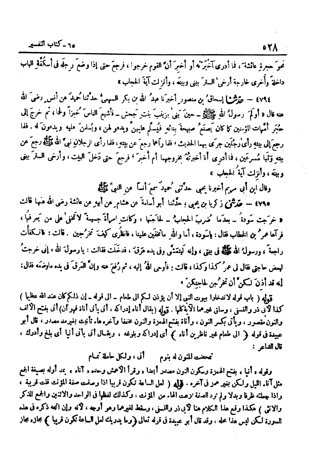 إِلَى قَوْلِهِ إِنَّ ذَلِكُمْ كَانَ عِنْدَ اللَّهِ عَظِيما كَذَا لِأَبِي ذَرٍّ وَالنَّسَفِيِّ وَسَاقَ غَيْرُهُمَا الْآيَةَ كُلَّهَا قَوْلُهُ يُقَالُ إِنَاهُ إِدْرَاكَهُ أَنَى يَأْنِي أَنَاةً فَهُوَ آنٍ أَنَى بِفَتْحِ الْأَلِفِ وَالنُّونِ مَقْصُور وَيَأْتِي بِكَسْرِ النُّونِ وَأَنَاةً بِفَتْحِ الْهَمْزَةِ وَالنُّونِ مُخَفَّفًا وَآخِرُهُ هَاءُ تَأْنِيثٍ بِغَيْرِ مَدٍّ مَصْدَرٌ قَالَ أَبُو عُبَيْدَةَ فِي قَوْلِهِ إِلَى طَعَامٍ غَيْرَ ناظرين أناه أَيْ إِدْرَاكَهُ وَبُلُوغَهُ وَيُقَالُ أَنَى يَأْنِي أَنْيًا أَيْ بَلَغَ وَأَدْرَكَ قَالَ الشَّاعِرُ تَمَحَّضَتِ الْمَنُونُ لَهُ بِنَوْمٍ أَنَى وَلِكُلِّ حَامِلَةٍ تَمَامُ وَقَوْلُهُ أَنْيًا بِفَتْحِ الْهَمْزَةِ وَسُكُونِ النُّونِ مَصْدَرٌ أَيْضًا وَقَرَأَ الْأَعْمَشُ وَحْدَهُ آنَاهُ بِمَدِّ أَوَّلِهِ بِصِيغَةِ الْجَمْعِ مِثْلَ آنَاءِ اللَّيْلِ وَلَكِنْ بِغَيْرِ هَمْزٍ فِي آخِرِهِ قَوْلُهُ لَعَلَّ السَّاعَةَ تَكُونُ قَرِيبًا إِذَا وَصَفْتَ صِفَةَ الْمُؤَنَّثِ قُلْتَ قَرِيبَةٌ وَإِذَا جَعَلْتَهُ ظَرْفًا وَبَدَلًا وَلَمْ تُرِدِ الصِّفَةَ نَزَعْتَ الْهَاءَ مِنَ الْمُؤَنَّثِ وَكَذَلِكَ لَفْظُهَا فِي الْوَاحِدِ وَالِاثْنَيْنِ وَالْجَمْعِ الْمُذَكَّرِ وَالْأُنْثَى هَكَذَا وَقَعَ هَذَا الْكَلَامُ هُنَا لِأَبِي ذَرٍّ وَالنَّسَفِيِّ وَسَقَطَ لِغَيْرِهِمَا وَهُوَ أَوْجَهُ لِأَنَّهُ وَإِنِ اتَّجَهَ ذِكْرُهُ فِي هَذِهِ السُّورَةِ لَكِنْ لَيْسَ هَذَا مَحَلُّهُ وَقَدْ قَالَ أَبُو عُبَيْدَةَ فِي قَوْلِهِ تَعَالَى وَمَا يُدْرِيكَ لَعَلَّ السَّاعَةَ تَكُونُ قَرِيبًا مجازه مجَاز