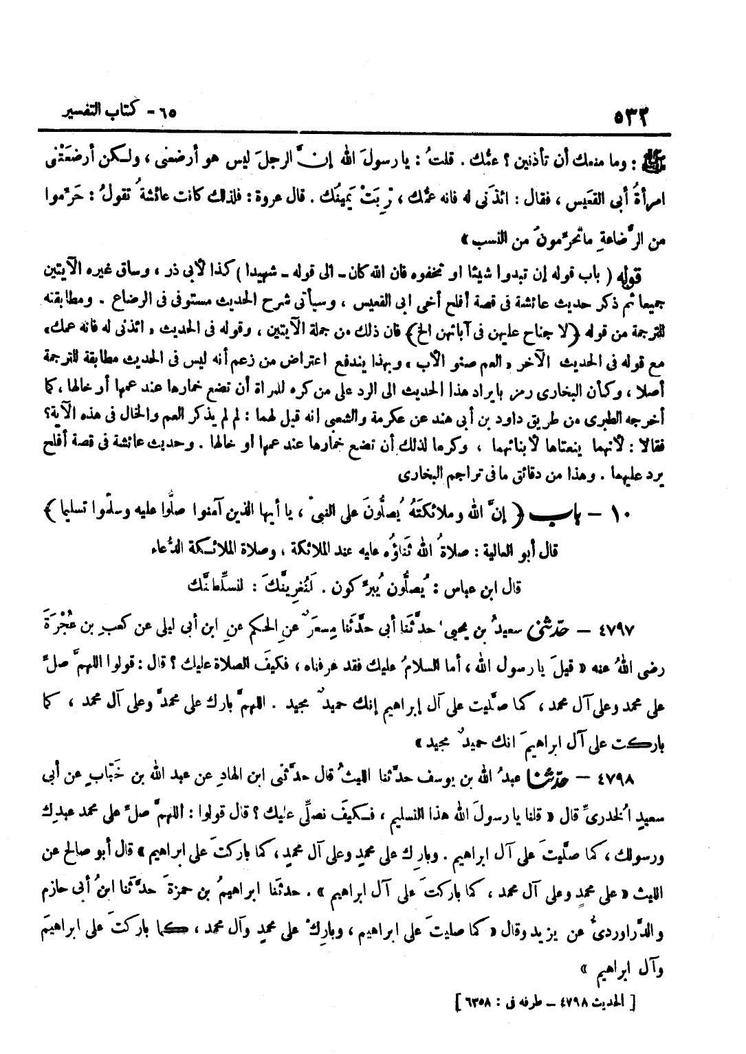 [4796] فِي الْحَدِيثِ ائْذَنِي لَهُ فَإِنَّهُ عَمُّكِ مَعَ قَوْلِهِ فِي الْحَدِيثِ الْآخَرِ الْعَمُّ صِنْوُ الْأَبِ وَبِهَذَا يَنْدَفِعُ اعْتِرَاضُ مَنْ زَعَمَ أَنَّهُ لَيْسَ فِي الْحَدِيثِ مُطَابَقَةٌ لِلتَّرْجَمَةِ أَصْلًا وَكَأَنَّ الْبُخَارِيَّ رَمَزَ بِإِيرَادِ هَذَا الْحَدِيثِ إِلَى الرَّدِّ عَلَى مَنْ كَرِهَ لِلْمَرْأَةِ أَنْ تَضَعَ خِمَارَهَا عِنْدَ عَمِّهَا أَوْ خَالِهَا كَمَا أَخْرَجَهُ الطَّبَرِيُّ مِنْ طَرِيقِ دَاوُدَ بْنِ أَبِي هِنْدٍ عَنِ عِكْرِمَةَ وَالشَّعْبِيِّ أَنَّهُ قِيلَ لَهُمَا لِمَ لَمْ يَذْكُرِ للعم وَالْخَالَ فِي هَذِهِ الْآيَةِ فَقَالَا لِأَنَّهُمَا يَنْعَتَاهَا لِأَبْنَائِهِمَا وَكَرِهَا لِذَلِكَ أَنْ تَضَعَ خِمَارَهَا عِنْدَ عَمِّهَا أَوْ خَالِهَا وَحَدِيثُ عَائِشَةَ فِي قِصَّةِ أَفْلَحَ يَرُدُّ عَلَيْهِمَا وَهَذَا مِنْ دَقَائِقِ مَا فِي تراجم البُخَارِيّ