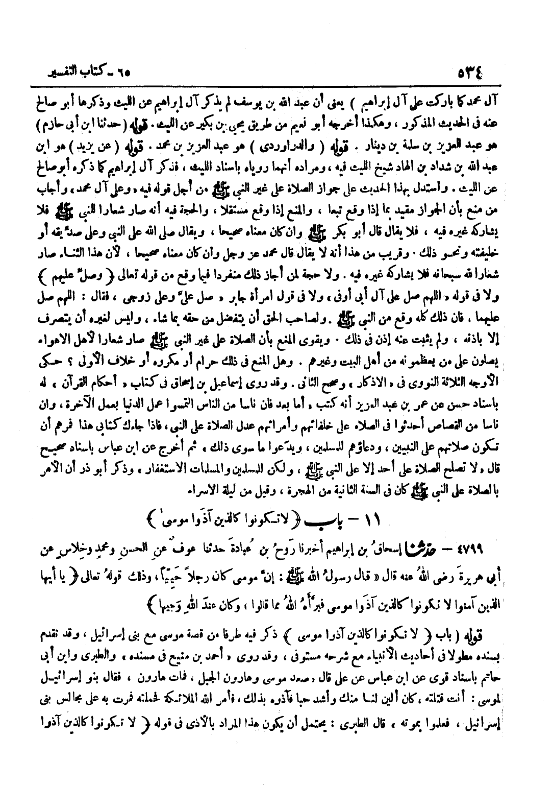 [4798] قَالَ أَبُو صَالِحٍ عَنِ اللَّيْثِ يَعْنِي بِالْإِسْنَادِ الْمَذْكُورِ قَبْلُ قَوْلُهُ عَلَى مُحَمَّدٍ وَعَلَى آلِ مُحَمَّدٍ كَمَا بَارَكْتَ عَلَى آلِ إِبْرَاهِيمَ يَعْنِي أَنَّ عَبْدَ اللَّهِ بْنَ يُوسُفَ لَمْ يَذْكُرْ آلَ إِبْرَاهِيمَ عَنِ اللَّيْثِ وَذَكَرَهَا أَبُو صَالِحٍ عَنْهُ فِي الْحَدِيثِ الْمَذْكُورِ وَهَكَذَا أَخْرَجَهُ أَبُو نُعَيْمٍ مِنْ طَرِيقِ يَحْيَى بْنِ بُكَيْرٍ عَنِ اللَّيْثِ قَوْله حَدثنَا بن أَبِي حَازِمٍ هُوَ عَبْدُ الْعَزِيزِ بْنُ سَلَمَةَ بْنِ دِينَارٍ قَوْلُهُ وَالدَّرَاوَرْدِيُّ هُوَ عَبْدُ الْعَزِيزِ بْنُ مُحَمَّدٍ قَوْلُهُ عَن يزِيد هُوَ بْنُ عَبْدِ اللَّهِ بْنِ شَدَّادِ بْنِ الْهَادِ شَيْخُ اللَّيْثِ فِيهِ وَمُرَادُهُ أَنَّهُمَا رَوَيَاهُ بِإِسْنَادِ اللَّيْثِ فَذَكَرَ آلَ إِبْرَاهِيمَ كَمَا ذَكَرَهُ أَبُو صَالِحٍ عَنِ اللَّيْثِ وَاسْتُدِلَّ بِهَذَا الْحَدِيثِ عَلَى جَوَازِ الصَّلَاة عَلَى غَيْرِ النَّبِيَّ صَلَّى اللَّهُ عَلَيْهِ وَسَلَّمَ مِنْ أَجْلِ قَوْلِهِ فِيهِ وَعَلَى آلِ مُحَمَّدٍ وَأَجَابَ مَنْ مَنَعَ بِأَنَّ الْجَوَازَ مُقَيَّدٌ بِمَا إِذَا وَقَعَ تَبَعًا وَالْمَنْعُ إِذَا وَقَعَ مُسْتَقِلًّا وَالْحُجَّةُ فِيهِ أَنَّهُ صَارَ شِعَارًا لِلنَّبِيِّ صَلَّى اللَّهُ عَلَيْهِ وَسَلَّمَ فَلَا يُشَارِكُهُ غَيْرُهُ فِيهِ فَلَا يُقَالُ قَالَ أَبُو بَكْرٍ صَلَّى اللَّهُ عَلَيْهِ وَسَلَّمَ وَإِنْ كَانَ مَعْنَاهُ صَحِيحًا وَيُقَالُ صَلَّى اللَّهُ عَلَى النَّبِيِّ وَعَلَى صِدِّيقِهِ أَوْ خَلِيفَتِهِ وَنَحْوُ ذَلِكَ وَقَرِيبٌ مِنْ هَذَا أَنَّهُ لَا يُقَالُ قَالَ مُحَمَّدٌ عَزَّ وَجَلَّ وَإِنْ كَانَ مَعْنَاهُ صَحِيحًا لِأَنَّ هَذَا الثَّنَاءَ صَار شعارا لله سُبْحَانَهُ فَلَا يُشَارِكُهُ غَيْرُهُ فِيهِ وَلَا حُجَّةَ لِمَنْ أَجَازَ ذَلِكَ مُنْفَرِدًا فِيمَا وَقَعَ مِنْ قَوْلِهِ تَعَالَى وصل عَلَيْهِم وَلَا فِي قَوْلِهِ اللَّهُمَّ صَلِّ عَلَى آلِ أَبِي أَوْفَى وَلَا فِي قَوْلِ امْرَأَةِ جَابِرٍ صَلِّ عَلَيَّ وَعَلَى زَوْجِي فَقَالَ اللَّهُمَّ صَلِّ عَلَيْهِمَا فَإِنَّ ذَلِكَ كُلَّهُ وَقَعَ مِنَ النَّبِيِّ صَلَّى اللَّهُ عَلَيْهِ وَسَلَّمَ وَلِصَاحِبِ الْحَقِّ أَنْ يَتَفَضَّلَ مِنْ حَقِّهِ بِمَا شَاءَ وَلَيْسَ لِغَيْرِهِ أَنْ يَتَصَرَّفَ إِلَّا بِإِذْنِهِ وَلَمْ يَثْبُتْ عَنْهُ إِذْنٌ فِي ذَلِكَ وَيُقَوِّي الْمَنْعَ بِأَنَّ الصَّلَاةَ عَلَى غَيْرِ النَّبِيِّ صَلَّى اللَّهُ عَلَيْهِ وَسَلَّمَ صَارَ شِعَارًا لِأَهْلِ الْأَهْوَاءِ يُصَلُّونَ عَلَى مَنْ يُعَظِّمُونَهُ مِنْ أَهْلِ الْبَيْتِ وَغَيْرِهِمْ وَهَلِ الْمَنْعُ فِي ذَلِكَ حَرَامٌ أَوْ مَكْرُوهٌ أَوْ خِلَافُ الْأَوْلَى حَكَى الْأَوْجُهَ الثَّلَاثَةَ النَّوَوِيُّ فِي الْأَذْكَارِ وَصَحَّحَ الثَّانِي وَقَدْ رَوَى إِسْمَاعِيلُ بْنُ إِسْحَاقَ فِي كِتَابِ أَحْكَامِ الْقُرْآنِ لَهُ بِإِسْنَادٍ حَسَنٍ عَنْ عُمَرَ بْنِ عَبْدِ الْعَزِيزِ أَنَّهُ كَتَبَ أَمَّا بَعْدُ فَإِنَّ نَاسًا مِنَ النَّاسِ الْتَمَسُوا عَمَلَ الدُّنْيَا بِعَمَلِ الْآخِرَةِ وَإِنَّ نَاسًا مِنَ الْقُصَّاصِ أَحْدَثُوا فِي الصَّلَاةِ عَلَى خُلَفَائِهِمْ وَأُمَرَائِهِمْ عَدْلَ الصَّلَاةِ عَلَى النَّبِيِّ فَإِذَا جَاءَكَ كِتَابِي هَذَا فَمُرْهُمْ أَنْ تَكُونَ صَلَاتُهُمْ عَلَى النَّبِيِّينَ وَدُعَاؤُهُمْ لِلْمُسْلِمِينَ وَيَدَعُوا مَا سِوَى ذَلِكَ ثُمَّ أخرج عَن بن عَبَّاسٍ بِإِسْنَادٍ صَحِيحٍ قَالَ لَا تَصْلُحُ الصَّلَاةُ عَلَى أَحَدٍ إِلَّا عَلَى النَّبِيِّ صَلَّى اللَّهُ عَلَيْهِ وَسَلَّمَ وَلَكِنْ لِلْمُسْلِمِينَ وَالْمُسْلِمَاتِ الِاسْتِغْفَارُ وَذَكَرَ أَبُو ذَرٍّ أَنَّ الْأَمْرَ بِالصَّلَاةِ عَلَى ال
