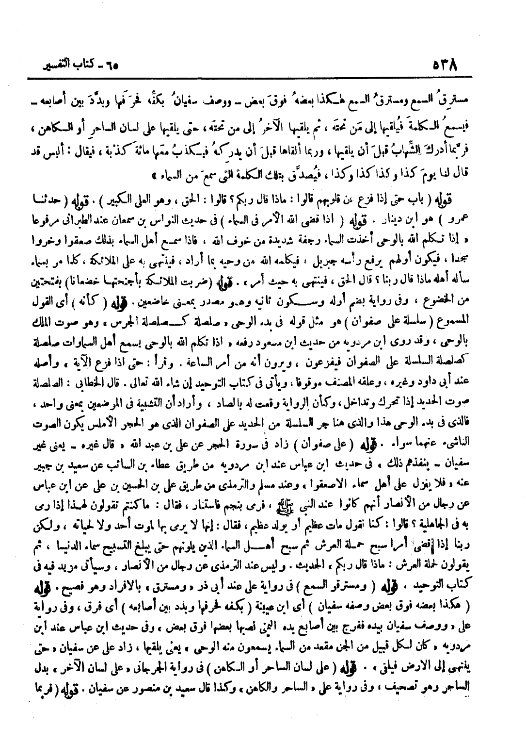 [4800] قَوْله حَدثنَا عَمْرو هُوَ بن دِينَارٍ قَوْلُهُ إِذَا قَضَى اللَّهُ الْأَمْرَ فِي السَّمَاءِ فِي حَدِيثِ النَّوَّاسِ بْنِ سَمْعَانَ عِنْدَ الطَّبَرَانِيِّ مَرْفُوعًا إِذَا تَكَلَّمَ اللَّهُ بِالْوَحْيِ أَخَذَتِ السَّمَاءَ رَجْفَةٌ شَدِيدَةٌ مِنْ خَوْفِ اللَّهِ فَإِذَا سَمِعَ أَهْلُ السَّمَاءِ بِذَلِكَ صُعِقُوا وَخَرُّوا سُجَّدًا فَيَكُونُ أَوَّلُهُمْ يَرْفَعُ رَأْسَهُ جِبْرِيلُ فَيُكَلِّمُهُ اللَّهُ مِنْ وَحْيِهِ بِمَا أَرَادَ فَيَنْتَهِي بِهِ عَلَى الْمَلَائِكَةِ كُلَّمَا مَرَّ بِسَمَاءٍ سَأَلَهُ أَهْلُهُ مَاذَا قَالَ رَبُّنَا قَالَ الْحَقَّ فَيَنْتَهِي بِهِ حَيْثُ أُمِرَ قَوْلُهُ ضَرَبَتِ الْمَلَائِكَةُ بِأَجْنِحَتِهَا خُضْعَانًا بِفَتْحَتَيْنِ مِنَ الْخُضُوعِ وَفِي رِوَايَةٍ بِضَمِّ أَوَّلِهِ وَسُكُونِ ثَانِيهِ وَهُوَ مَصْدَرٌ بِمَعْنَى خَاضِعِينَ قَوْلُهُ كَأَنَّهُ أَيِ الْقَوْلُ الْمَسْمُوعُ سِلْسِلَةٌ عَلَى صَفْوَانٍ هُوَ مِثْلُ قَوْلِهِ فِي بَدْءِ الْوَحْيِ صَلْصَلَةٌ كَصَلْصَلَةِ الْجَرَسِ وَهُوَ صَوْتُ الْمَلَكِ بِالْوَحْيِ وَقَدْ رَوَى بن مرْدَوَيْه من حَدِيث بن مَسْعُودٍ رَفَعَهُ إِذَا تَكَلَّمَ اللَّهُ بِالْوَحْيِ يَسْمَعُ أَهْلُ السَّمَاوَاتِ صَلْصَلَةً كَصَلْصَلَةِ السِّلْسِلَةِ عَلَى الصَّفْوَانِ فَيَفْزَعُونَ وَيَرَوْنَ أَنَّهُ مِنْ أَمْرِ السَّاعَةِ وَقَرَأَ حَتَّى إِذَا فُزِّعَ الْآيَةَ وَأَصْلُهُ عِنْدَ أَبِي دَاوُدَ وَغَيْرِهِ وَعَلَّقَهُ الْمُصَنِّفُ مَوْقُوفًا وَيَأْتِي فِي كِتَابِ التَّوْحِيدِ إِنْ شَاءَ اللَّهُ تَعَالَى قَالَ الْخَطَّابِيُّ الصَّلْصَلَةُ صَوْتُ الْحَدِيدِ إِذَا تَحَرَّكَ وَتَدَاخَلَ وَكَأَنَّ الرِّوَايَةَ وَقَعَتْ لَهُ بِالصَّادِ وَأَرَادَ أَنَّ التَّشْبِيهَ فِي الْمَوْضِعَيْنِ بِمَعْنًى وَاحِدٍ فَالَّذِي فِي بَدْءِ الْوَحْيِ هَذَا وَالَّذِي هُنَا جَرُّ السِّلْسِلَةِ من الْحَدِيد على الصَّفْوَانِ الَّذِي هُوَ الْحَجَرُ الْأَمْلَسُ يَكُونُ الصَّوْتُ النَّاشِئُ عَنْهُمَا سَوَاءً قَوْلُهُ عَلَى صَفْوَانٍ زَادَ فِي سُورَةِ الْحِجْرِ عَنْ عَلِيِّ بْنِ عَبْدِ اللَّهِ قَالَ غَيْرُهُ يَعْنِي غَيْرَ سُفْيَانَ يَنْفُذُهُمْ ذَلِك فِي حَدِيث بن عَبَّاس عِنْد بن مَرْدَوَيْهِ مِنْ طَرِيقِ عَطَاءِ بْنِ السَّائِبِ عَنْ سَعِيدِ بْنِ جُبَيْرٍ عَنْهُ فَلَا يَنْزِلُ عَلَى أَهْلِ سَمَاءٍ إِلَّا صُعِقُوا وَعِنْدَ مُسْلِمٍ وَالتِّرْمِذِيِّ مِنْ طَرِيقِ عَلِيِّ بْنِ الْحُسَيْنِ بْنِ عَلِيٍّ عَن بن عَبَّاسٍ عَنْ رِجَالٍ مِنَ الْأَنْصَارِ أَنَّهُمْ كَانُوا عِنْدَ النَّبِيِّ صَلَّى اللَّهُ عَلَيْهِ وَسَلَّمَ فَرُمِيَ بِنَجْمٍ فَاسْتَنَارَ فَقَالَ مَا كُنْتُمْ تَقُولُونَ لِهَذَا إِذَا رُمِيَ بِهِ فِي الْجَاهِلِيَّةِ قَالُوا كُنَّا نَقُولُ مَاتَ عَظِيمٌ أَوْ يُولَدُ عَظِيمٌ فَقَالَ إِنَّهَا لَا يُرْمَى بِهَا لِمَوْتِ أَحَدٍ وَلَا لِحَيَاتِهِ وَلَكِنَّ رَبَّنَا إِذَا قَضَى أَمْرًا سَبَّحَ حَمَلَةُ الْعَرْشِ ثُمَّ سَبَّحَ أَهْلُ السَّمَاءِ الَّذِينَ يَلُونَهُمْ حَتَّى يَبْلُغَ التَّسْبِيحُ سَمَاءَ الدُّنْيَا ثُمَّ يَقُولُونَ لِحَمَلَةِ الْعَرْشِ مَاذَا قَالَ رَبُّكُمْ الْحَدِيثَ وَلَيْسَ عِنْدَ التِّرْمِذِيِّ عَنْ رِجَالٍ مِنْ الْأَنْصَارِ وَسَيَأْتِي مَزِيدٌ فِيهِ فِي كِتَابِ التَّوْحِيدِ قَوْلُهُ وَمُسْتَرِقُو السَّمْعِ فِي رِوَايَةِ عَلِيٍّ عِنْدَ أَبِي ذَرٍّ وَمُسْتَرِقٌ بِالْإِفْرَادِ وَهُوَ فَصِيحٌ قَوْلُهُ هَكَذَا بعضه فَوق بعض وَصفه سُفْيَان أَي بن عُيَيْنَةَ بِكَفِّهِ فَحَرَفَهَا وَبَدَّدَ بَيْنَ أَصَابِعِهِ أَيْ فَرَّقَ وَفِي رِوَايَةِ عَلِيٍّ وَوَصَفَ سُفْيَانُ بِيَدِهِ فَفَرَّجَ بَيْنَ أَصَابِعِ يَدِهِ ال