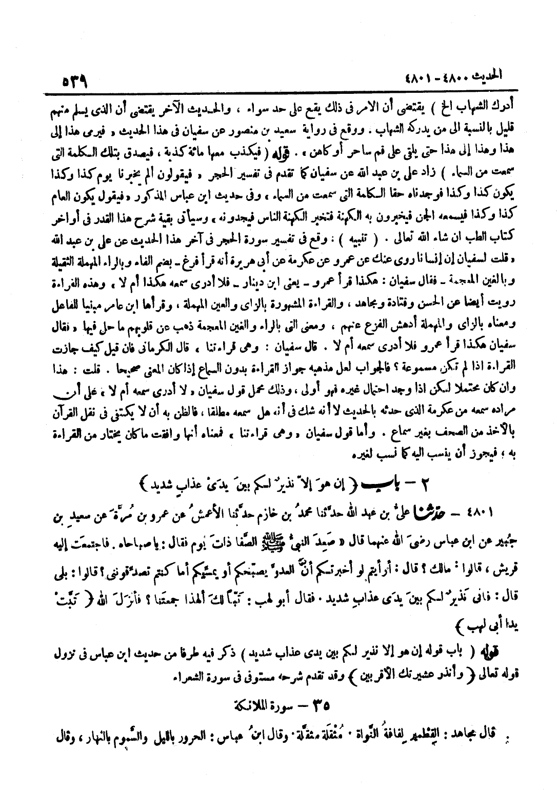 ذَكَرَ فِيهِ طرفا من حَدِيث بن عَبَّاسٍ فِي نُزُولِ قَوْلِهِ تَعَالَى وَأَنْذِرْ عَشِيرَتَكَ الْأَقْرَبين وَقَدْ تَقَدَّمَ شَرْحُهُ مُسْتَوْفًى فِي سُورَةِ الشُّعَرَاءِ