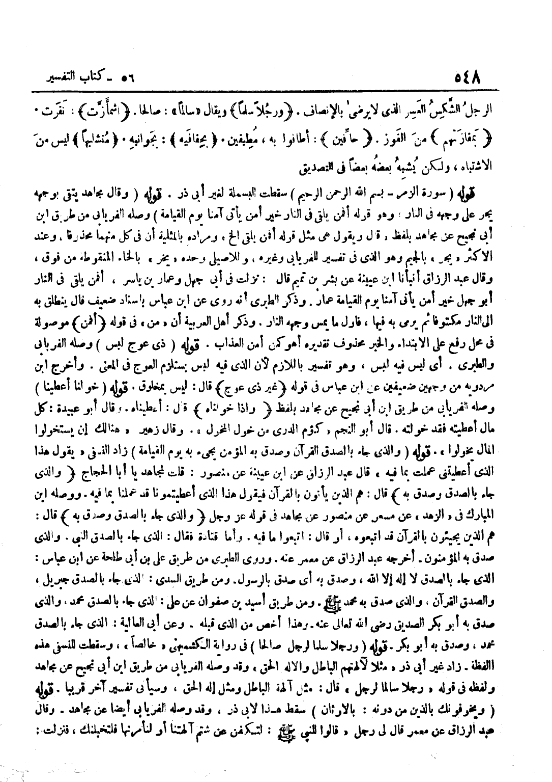 سَقَطَتِ الْبَسْمَلَةُ لِغَيْرِ أَبِي ذَرٍّ قَوْلُهُ وَقَالَ مُجَاهِدٌ يَتَّقِي بِوَجْهِهِ يُجَرُّ عَلَى وَجْهِهِ فِي النَّارِ وَهُوَ قَوْلُهُ أَفَمَنْ يُلْقَى فِي النَّارِ خَيْرٌ أَمَّنْ يَأْتِي آمِنًا يَوْمَ الْقِيَامَةِ وَصَلَهُ الْفرْيَابِيّ من طَرِيق بن أَبِي نَجِيحٍ عَنْ مُجَاهِدٍ بِلَفْظِ قَالَ وَيَقُولُ هِيَ مِثْلُ قَوْلِهِ أَفَمَنْ يُلْقَى إِلَخْ وَمُرَادُهُ بِالْمِثْلِيَّةِ أَنَّ فِي كُلٍّ مِنْهُمَا مَحْذُوفًا وَعِنْدَ الْأَكْثَرِ يُجَرُّ بِالْجِيمِ وَهُوَ الَّذِي فِي تَفْسِيرِ للفريابي وَغَيْرِهِ وَلِلْأَصِيلِيِّ وَحْدَهُ يَخِرُّ بِالْخَاءِ الْمَنْقُوطَةِ مِنْ فَوق وَقَالَ عبد الرَّزَّاق أَنبأَنَا بن عُيَيْنَةَ عَنْ بِشْرِ بْنِ تَمِيمٍ قَالَ نَزَلَتْ فِي أَبِي جَهْلٍ وَعَمَّارِ بْنِ يَاسِرٍ أَفَمَنْ يُلْقَى فِي النَّارِ أَبُو جَهْلٍ خَيْرٌ أَمَّنْ يَأْتِي آمِنًا يَوْمَ الْقِيَامَةِ عَمَّارٌ وَذَكَرَ الطَّبَرِيُّ أَنه روى عَن بن عَبَّاسٍ بِإِسْنَادٍ ضَعِيفٍ قَالَ يُنْطَلَقُ بِهِ إِلَى النَّارِ مَكْتُوفًا ثُمَّ يُرْمَى بِهِ فِيهَا فَأَوَّلُ مَا يَمَسُّ وَجْهَهُ النَّارُ وَذَكَرَ أَهْلُ الْعَرَبِيَّةِ أَنَّ مَنْ فِي قَوْلِهِ أَفَمَنْ مَوْصُولَةٌ فِي مَحَلِّ رَفْعٍ عَلَى الِابْتِدَاءِ وَالْخَبَرُ مَحْذُوفٌ تَقْدِيرُهُ أَهُوَ كَمَنْ أَمِنَ الْعَذَابَ قَوْلُهُ ذِي عِوَجٍ لَبْسٍ وَصَلَهُ الْفِرْيَابِيُّ وَالطَّبَرِيُّ أَيْ لَيْسَ فِيهِ لَبْسٌ وَهُوَ تَفْسِيرٌ بِاللَّازِمِ لِأَنَّ الَّذِي فِيهِ لبس يسْتَلْزم العوج فِي الْمَعْنى وَأخرج بن مرْدَوَيْه من وَجْهَيْن ضعيفين عَن بن عَبَّاسٍ فِي قَوْلِهِ غَيْرِ ذِي عِوَجٍ قَالَ لَيْسَ بِمَخْلُوقٍ قَوْلُهُ خَوَّلْنَا أَعْطَيْنَا وَصَلَهُ الْفِرْيَابِيُّ من طَرِيق بن أَبِي نَجِيحٍ عَنْ مُجَاهِدٍ بِلَفْظِ وَإِذَا خَوَّلْنَاهُ قَالَ أَعْطَيْنَاهُ وَقَالَ أَبُو عُبَيْدَةَ كُلُّ مَالٍ أَعْطيته فقد خولته قَالَ أَبُو النَّجْم كؤم الدُّرِّي مِنْ خَوَلِ الْمُخَوَّلِ وَقَالَ زُهَيْرٌ هُنَالِكَ إِنْ يَسْتَخْوِلُوا الْمَالَ يُخَوَّلُوا قَوْلُهُ وَالَّذِي جَاءَ بِالصِّدْقِ الْقُرْآنِ وَصَدَّقَ بِهِ الْمُؤْمِنُ يَجِيءُ بِهِ يَوْمَ الْقِيَامَةِ زَادَ النَّسَفِيُّ يَقُولُ هَذَا الَّذِي أَعْطَيْتَنِي عَمِلْتُ بِمَا فِيهِ قَالَ عَبْدُ الرَّزَّاقِ عَنِ بن عُيَيْنَةَ عَنْ مَنْصُورٍ قُلْتُ لِمُجَاهِدٍ يَا أَبَا الْحَجَّاجِ وَالَّذِي جَاءَ بِالصِّدْقِ وَصَدَّقَ بِهِ قَالَ هُمُ الَّذِينَ يَأْتُونَ بِالْقُرْآنِ فَيَقُولُ هَذَا الَّذِي أعطيتمونا قد عَملنَا بِمَا فِيهِ وَوَصله بن الْمُبَارَكِ فِي الزُّهْدِ عَنْ مِسْعَرٍ عَنْ مَنْصُورٍ عَنْ مُجَاهِدٍ فِي قَوْلِهِ عَزَّ وَجَلَّ وَالَّذِي جَاءَ بِالصِّدْقِ وَصَدَّقَ بِهِ قَالَ هُمُ الَّذِينَ يَجِيئُونَ بِالْقُرْآنِ قَدِ اتَّبَعُوهُ أَوْ قَالَ اتَّبَعُوا مَا فِيهِ وَأَمَّا قَتَادَةُ فَقَالَ الَّذِي جَاءَ بِالصِّدْقِ النَّبِيُّ وَالَّذِي صَدَّقَ بِهِ الْمُؤْمِنُونَ أَخْرَجَهُ عَبْدُ الرَّزَّاقِ عَنْ مَعْمَرٍ عَنْهُ وَرَوَى الطَّبَرِيُّ مِنْ طَرِيقِ عَلِيِّ بْنِ أَبِي طَلْحَةَ عَنِ بن عَبَّاسٍ الَّذِي جَاءَ بِالصِّدْقِ لَا إِلَهَ إِلَّا اللَّهُ وَصَدَّقَ بِهِ أَيْ صَدَّقَ بِالرَّسُولِ وَمِنْ طَرِيقِ السُّدِّيِّ الَّذِي جَاءَ بِالصِّدْقِ جِبْرِيلُ وَالصِّدْقُ الْقُرْآنُ وَالَّذِي صَدَّقَ بِهِ مُحَمَّدٌ صَلَّى اللَّهُ عَلَيْهِ وَسَلَّمَ وَمِنْ طَرِيقِ أُسَيْدِ بْنِ صَفْوَانٍ عَنْ عَلِيٍّ الَّذِي جَاءَ بِالصِّدْقِ مُحَمَّدٌ وَالَّذِي صَدَّقَ بِهِ أَبُو بَكْرٍ الصِّدِّيقُ رَضِيَ اللَّهُ تَعَالَى عَنْهُ وَهَذَا أَخَصُّ مِنَ الَّذِي قَبْلَهُ وَعَنْ أَبِي الْعَالِيَةِ الَّذِي جَاءَ بِ
