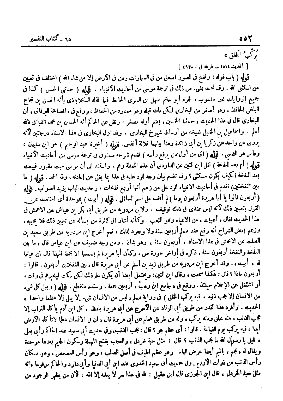 [4814] قَوْلُهُ مَا بَيْنَ النَّفْخَتَيْنِ تَقَدَّمَ فِي أَحَادِيثِ الْأَنْبِيَاءِ الرَّدُّ عَلَى مَنْ زَعَمَ أَنَّهَا أَرْبَعُ نَفَخَاتٍ وَحَدِيثُ الْبَابِ يُؤَيِّدُ الصَّوَابَ قَوْلُهُ أَرْبَعُونَ قَالُوا يَا أَبَا هُرَيْرَةَ أَرْبَعُونَ يَوْمًا لَمْ أَقِفْ عَلَى اسْمِ السَّائِلِ قَوْلُهُ أَبَيْتُ بِمُوَحَّدَةٍ أَيِ امْتَنَعْتُ عَنِ الْقَوْلِ بِتَعْيِينِ ذَلِكَ لِأَنَّهُ لَيْسَ عِنْدِي فِي ذَلِكَ تَوْقِيفٌ وَلِابْنِ مَرْدَوَيْهِ مِنْ طَرِيقِ أَبِي بَكْرِ بْنِ عَيَّاشٍ عَنْ الْأَعْمَشِ فِي هَذَا الْحَدِيثِ فَقَالَ أَعْيَيْتُ مِنَ الْإِعْيَاءِ وَهُوَ التَّعَبُ وَكَأَنَّهُ أَشَارَ إِلَى كَثْرَةِ مَنْ يَسْأَلُهُ عَنْ تَبْيِينِ ذَلِكَ فَلَا يُجِيبُهُ وَزَعَمَ بَعْضُ الشُّرَّاحِ أَنَّهُ وَقَعَ عِنْدَ مُسْلِمٍ أَرْبَعِينَ سَنَةً وَلَا وجود لذَلِك نعم أخرج بن مَرْدَوَيْهِ مِنْ طَرِيقِ سَعِيدِ بْنِ الصَّلْتِ عَنِ الْأَعْمَشِ فِي هَذَا الْإِسْنَادِ أَرْبَعُونَ سَنَةً وَهُوَ شَاذ وَمن وَجه ضَعِيف عَن بن عَبَّاسٍ قَالَ مَا بَيْنَ النَّفْخَةِ وَالنَّفْخَةِ أَرْبَعُونَ سَنَةً ذَكَرَهُ فِي أَوَاخِرِ سُورَةِ ص وَكَأَنَّ أَبَا هُرَيْرَةَ لَمْ يَسْمَعْهَا إِلَّا مُجْمَلَةً فَلِهَذَا قَالَ لِمَنْ عَيَّنَهَا لَهُ أَبَيْتُ وَقَدْ أَخْرَجَ بن مَرْدَوَيْهِ مِنْ طَرِيقِ زَيْدِ بْنِ أَسْلَمَ عَنْ أَبِي هُرَيْرَةَ قَالَ بَيْنَ النَّفْخَتَيْنِ أَرْبَعُونَ قَالُوا أَرْبَعُونَ مَاذَا قَالَ هَكَذَا سَمِعت وَقَالَ بن التِّينِ وَيَحْتَمِلُ أَيْضًا أَنْ يَكُونَ عَلِمَ ذَلِكَ لَكِنْ سَكَتَ لِيُخْبِرَهُمْ فِي وَقْتٍ أَوِ اشْتَغَلَ عَن الْإِعْلَام حِينَئِذٍ وَوَقع فِي جَامع بن وَهْبٍ أَرْبَعِينَ جُمْعَةً وَسَنَدُهُ مُنْقَطِعٌ قَوْلُهُ وَيَبْلَى كُلُّ شَيْءٍ مِنَ الْإِنْسَانِ إِلَّا عَجْبَ ذَنَبِهِ فِيهِ يُرَكَّبُ الْخَلْقُ فِي رِوَايَةِ مُسْلِمٍ لَيْسَ مِنَ الْإِنْسَانِ شَيْءٌ إِلَّا يَبْلَى إِلَّا عَظْمًا وَاحِدًا الْحَدِيثَ وَأَفْرَدَ هَذَا الْقَدْرَ مِنْ طَرِيقِ أَبِي الزِّنَادِ عَنِ الْأَعْرَجِ عَنْ أَبِي هُرَيْرَةَ بِلَفْظ كل بن آدَمَ يَأْكُلُهُ التُّرَابُ إِلَّا عَجْبَ الذَّنَبِ مِنْهُ خُلِقَ وَمِنْهُ يُرَكَّبُ وَلَهُ مِنْ طَرِيقِ هَمَّامٍ عَنْ أَبِي هُرَيْرَةَ قَالَ إِنَّ فِي الْإِنْسَانِ عَظْمًا لَا تَأْكُلُهُ الْأَرْضُ أَبَدًا فِيهِ يُرَكَّبُ يَوْمَ الْقِيَامَةِ قَالُوا أَيُّ عَظْمٍ هُوَ قَالَ عَجْبُ الذَّنَبِ وَفِي حَدِيثِ أَبِي سَعِيدٍ عِنْدَ الْحَاكِمِ وَأَبِي يَعْلَى قِيلَ يَا رَسُولَ اللَّهِ مَا عَجْبُ الذَّنَبِ قَالَ مِثْلُ حَبَّةِ خَرْدَلٍ وَالْعَجْبُ بِفَتْحِ الْمُهْمَلَةِ وَسُكُونِ الْجِيمِ بَعْدَهَا مُوَحَّدَةٌ وَيُقَالُ لَهُ عَجْمٌ بِالْمِيمِ أَيْضًا عِوَضَ الْبَاءِ وَهُوَ عَظْمٌ لَطِيفٌ فِي أَصْلِ الصُّلْبِ وَهُوَ رَأْسُ الْعُصْعُصِ وَهُوَ مَكَانُ رَأْسِ الذَّنَبِ مِنْ ذَوَاتِ الْأَرْبَعِ وَفِي حَدِيثِ أَبِي سَعِيدٍ الْخُدْرِيِّ عِنْد بن أَبِي الدُّنْيَا وَأَبِي دَاوُدَ وَالْحَاكِمِ مَرْفُوعًا إِنَّهُ مثل حَبَّة الْخَرْدَل قَالَ بن الْجَوْزِيّ قَالَ بن عُقَيْلٍ لِلَّهِ فِي هَذَا سِرٌّ لَا يَعْلَمُهُ إِلَّا اللَّهُ لِأَنَّ مَنْ يُظْهِرُ الْوُجُودَ مِنَ