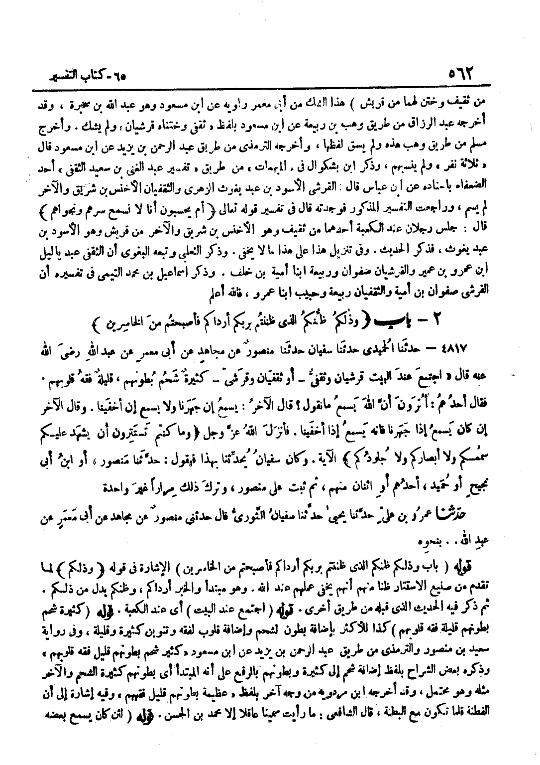 مِنْ ثَقِيفٍ وَخَتَنٌ لَهُمَا مِنْ قُرَيْشٍ هَذَا الشَّك من أبي معمر رِوَايَة عَن بن مَسْعُودٍ وَهُوَ عَبْدُ اللَّهِ بْنُ سَخْبَرَةَ وَقَدْ أَخْرَجَهُ عَبْدُ الرَّزَّاقِ مِنْ طَرِيقِ وَهْبِ بْنِ ربيعَة عَن بن مَسْعُودٍ بِلَفْظِ ثَقَفِيٍّ وَخَتَنَاهُ قُرَشِيَّانِ وَلَمْ يَشُكَّ وَأَخْرَجَ مُسْلِمٌ مِنْ طَرِيقِ وَهْبٍ هَذِهِ وَلَمْ يَسُقْ لَفْظَهَا وَأَخْرَجَهُ التِّرْمِذِيُّ مِنْ طَرِيقِ عَبْدِ الرَّحْمَنِ بْنِ يَزِيدَ عَنِ بن مَسْعُودٍ قَالَ ثَلَاثَةُ نَفَرٍ وَلَمْ يَنْسُبْهُمْ وَذَكَرَ بن بَشْكُوَالَ فِي الْمُبْهَمَاتِ مِنْ طَرِيقِ تَفْسِيرِ عَبْدُ الْغَنِيِّ بْنُ سَعِيدِ الثَّقَفِيُّ أَحَدُ الضُّعَفَاءِ بِإِسْنَادِهِ عَن بن عَبَّاسٍ قَالَ الْقُرَشِيُّ الْأَسْوَدُ بْنُ عَبْدِ يَغُوثَ الزُّهْرِيُّ وَالثَّقَفِيَّانِ الْأَخْنَسُ بْنُ شَرِيقٍ وَالْآخَرُ لَمْ يُسَمَّ وَرَاجَعْتُ التَّفْسِيرَ الْمَذْكُورَ فَوَجَدْتُهُ قَالَ فِي تَفْسِيرِ قَوْلِهِ تَعَالَى أَمْ يَحْسَبُونَ أَنَّا لَا نسْمع سرهم ونجواهم قَالَ جَلَسَ رَجُلَانِ عِنْدَ الْكَعْبَةِ أَحَدُهُمَا مِنْ ثَقِيفٍ وَهُوَ الْأَخْنَسُ بْنُ شَرِيقٍ وَالْآخَرُ مِنْ قُرَيْشٍ وَهُوَ الْأَسْوَدُ بْنُ عَبْدِ يَغُوثَ فَذَكَرَ الْحَدِيثَ وَفِي تَنْزِيلِ هَذَا عَلَى هَذَا مَا لَا يَخْفَى وَذَكَرَ الثَّعْلَبِيُّ وَتَبِعَهُ الْبَغَوِيُّ أَنَّ الثَّقَفِيّ عبد يَا ليل بْنِ عَمْرِو بْنِ عُمَيْرٍ وَالْقُرَشِيَّانِ صَفْوَانُ وَرَبِيعَةُ ابْنَا أُمَيَّةَ بْنِ خَلَفٍ وَذَكَرَ إِسْمَاعِيلُ بْنُ مُحَمَّدٍ التَّيْمِيُّ فِي تَفْسِيرِهِ أَنَّ الْقُرَشِيَّ صَفْوَانُ بْنُ أُمَيَّةَ وَالثَّقَفِيَّانِ رَبِيعَةُ وَحَبِيبٌ ابْنَا عَمْرٍو فَالله أعلم
