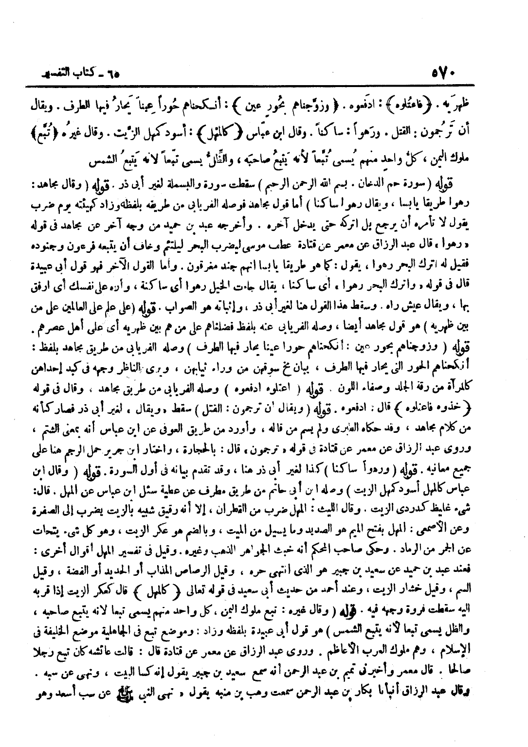سَقَطَتْ سُورَةُ وَالْبَسْمَلَةُ لِغَيْرِ أَبِي ذَرٍّ قَوْلُهُ وَقَالَ مُجَاهِدٌ رَهْوًا طَرِيقًا يَابِسًا وَيُقَالُ رَهْوًا سَاكِنًا أَمَّا قَوْلُ مُجَاهِدٍ فَوَصَلَهُ الْفِرْيَابِيُّ مِنْ طَرِيقِهِ بِلَفْظِهِ وَزَادَ كَهَيْئَتِهِ يَوْمَ ضُرِبَ يَقُولُ لَا تَأْمُرْهُ أَنْ يَرْجِعَ بَلِ اتْرُكْهُ حَتَّى يَدْخُلَ آخِرُهُ وَأَخْرَجَهُ عَبْدِ بْنِ حُمَيْدٍ مِنْ وَجْهٍ آخَرَ عَنِ مُجَاهِدٍ فِي قَوْلِهِ رَهْوًا قَالَ عَبْدُ الرَّزَّاقِ عَنْ مَعْمَرٍ عَنْ قَتَادَةَ عُطِفَ مُوسَى لِيَضْرِبَ الْبَحْرَ لِيَلْتَئِمَ وَخَافَ أَنْ يَتْبَعَهُ فِرْعَوْنُ وَجُنُودُهُ فَقِيلَ لَهُ اتْرُكِ الْبَحْر رهوا يَقُولُ كَمَا هُوَ طَرِيقًا يَابِسًا إِنَّهُمْ جُنْدٌ مغرقون وَأَمَّا الْقَوْلُ الْآخَرُ فَهُوَ قَوْلُ أَبِي عُبَيْدَةَ قَالَ فِي قَوْلِهِ واترك الْبَحْر رهوا أَيْ سَاكِنًا يُقَالُ جَاءَتِ الْخَيْلُ رَهْوًا أَيْ سَاكِنَةً وَأَرِهْ عَلَى نَفْسِكَ أَيِ ارْفُقْ بِهَا وَيُقَالُ عَيْشٌ رَاهٍ وَسَقَطَ هَذَا الْقَوْلُ هُنَا لِغَيْرِ أَبِي ذَرٍّ وَإِثْبَاتُهُ هُوَ الصَّوَابُ قَوْلُهُ عَلَى عِلْمٍ عَلَى الْعَالَمِينَ عَلَى مَنْ بَيْنَ ظَهْرَيْهِ هُوَ قَوْلُ مُجَاهِدٍ أَيْضًا وَصَلَهُ الْفِرْيَابِيُّ عَنْهُ بِلَفْظِ فَضَّلْنَاهُمْ عَلَى مَنْ هُمْ بَيْنَ ظَهْرَيْهِ أَيْ عَلَى أَهْلِ عَصْرِهِمْ قَوْلُهُ وَزَوَّجْنَاهُمْ بحور عين أَنْكَحْنَاهُمْ حُورًا عِينًا يَحَارُ فِيهَا الطَّرْفُ وَصَلَهُ الْفِرْيَابِيُّ مِنْ طَرِيقِ مُجَاهِدٍ بِلَفْظِ أَنْكَحْنَاهُمُ الْحُورَ الَّتِي يحار فِيهَا الطّرف يبان مُخِّ سُوقِهِنَّ مِنْ وَرَاءِ ثِيَابِهِنَّ وَيَرَى النَّاظِرُ وَجْهَهُ فِي كَبِدِ إِحْدَاهُنَّ كَالْمِرْآةِ مِنْ رِقَّةِ الْجِلْدِ وَصَفَاءِ اللَّوْنِ قَوْلُهُ اعْتِلُوهُ ادْفَعُوهُ وَصَلَهُ الْفِرْيَابِيُّ مِنْ طَرِيقِ مُجَاهِدٍ وَقَالَ فِي قَوْلِهِ خذوه فاعتلوه قَالَ ادْفَعُوهُ قَوْلُهُ وَيُقَالُ أَنْ تَرْجُمُونَ الْقَتْلُ سَقَطَ وَيُقَالُ لِغَيْرِ أَبِي ذَرٍّ فَصَارَ كَأَنَّهُ مِنْ كَلَامِ مُجَاهِدٍ وَقَدْ حَكَاهُ الطَّبَرِيُّ وَلَمْ يُسَمِّ مَنْ قَالَهُ وَأَوْرَدَ مِنْ طَرِيقِ الْعَوْفِيِّ عَن بن عَبَّاسٍ أَنَّهُ بِمَعْنَى الشَّتْمِ وَرَوَى عَبْدُ الرَّزَّاقِ عَنْ مَعْمَرٍ عَنْ قَتَادَةَ فِي قَوْلِهِ تَرْجُمُونَ قَالَ بِالْحِجَارَةِ وَاخْتَارَ بن جَرِيرٍ حَمْلَ الرَّجْمَ هُنَا عَلَى جَمِيعِ مَعَانِيهِ قَوْلُهُ وَرَهْوًا سَاكِنًا كَذَا لِغَيْرِ أَبِي ذَرٍّ هُنَا وَقَدْ تَقَدَّمَ بَيَانُهُ فِي أَوَّلِ السُّورَةِ قَوْله وَقَالَ بن عَبَّاس كَالْمهْلِ أسود كمهل الزَّيْت وَصله بن أَبِي حَاتِمٍ مِنْ طَرِيقِ مُطَرِّفٍ عَنْ عَطِيَّةَ سُئِلَ بن عَبَّاسٍ عَنِ الْمُهْلِ قَالَ شَيْءٌ غَلِيظٌ كَدُرْدِيِّ الزَّيْتِ وَقَالَ اللَّيْثُ الْمُهْلُ ضَرْبٌ مِنَ الْقَطِرَانِ إِلَّا أَنَّهُ رَقِيقٌ شَبِيهٌ بِالزَّيْتِ يَضْرِبُ إِلَى الصُّفْرَةِ وَعَنِ الْأَصْمَعِيِّ الْمَهْلُ بِفَتْحِ الْمِيمِ هُوَ الصَّدِيدُ وَمَا يَسِيلُ مِنَ الْمَيِّتِ وَبِالضَّمِّ هُوَ عَكَرُ الزَّيْتِ وَهُوَ كُلُّ شَيْءٍ يَتَحَاتُّ عَنِ الْجَمْرِ مِنَ الرَّمَادِ وَحَكَى صَاحِبُ الْمُحْكَمِ أَنَّهُ خَبَثُ الْجَوَاهِرِ الذَّهَبِ وَغَيْرِهِ وَقِيلَ فِي تَفْسِيرِ الْمُهْلِ أَقْوَالٌ أُخْرَى فَعِنْدَ عَبْدِ بْنِ حُمَيْدٍ عَنْ سَعِيدِ بْنِ جُبَيْرٍ هُوَ الَّذِي انْتَهَى حَرُّهُ وَقِيلَ الرَّصَاصُ الْمُذَابُ أَوِ الْحَدِيدُ أَوِ الْفِضَّةُ وَقِيلَ السُّمُّ وَقِيلَ خُشَارُ الزَّيْتِ وَعِنْدَ أَحْمَدَ مِنْ حَدِيثِ أَبِي سَعِيدٍ فِي قَوْلِهِ تَعَالَى كَالْمُهْلِ قَالَ كَعَكَرِ الزَّيْتِ إِذَا قَرَّبَهُ إِلَيْهِ سَقَطَتْ فَرْوَةُ وَجْ