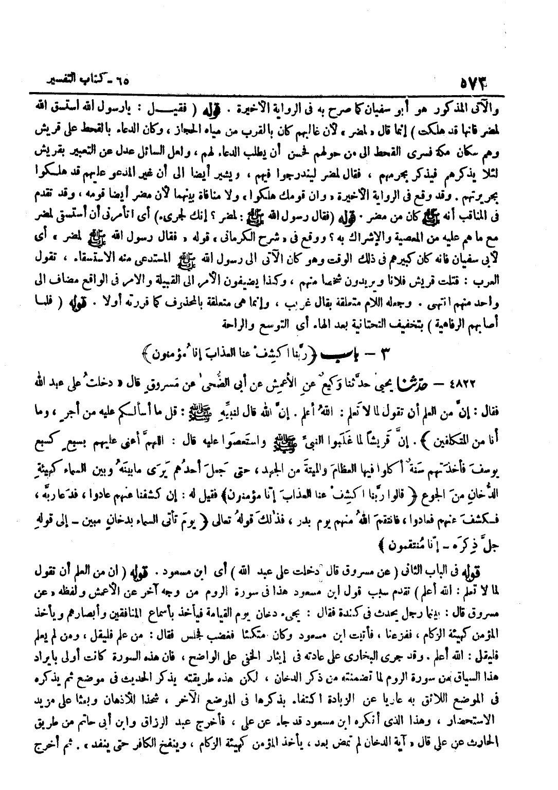 تَقَدَّمَ سَبَبُ قَول بن مَسْعُودٍ هَذَا فِي سُورَةِ الرُّومِ مِنْ وَجْهٍ آخَرَ عَنِ الْأَعْمَشِ وَلَفْظُهُ عَنْ مَسْرُوقٍ قَالَ بَيْنَمَا رَجُلٌ يُحَدِّثُ فِي كِنْدَةَ فَقَالَ يَجِيءُ دُخَانٌ يَوْمَ الْقِيَامَةِ فَيَأْخُذُ بِأَسْمَاعِ الْمُنَافِقِينَ وَأَبْصَارِهِمْ وَيَأْخُذ الْمُؤمن كَهَيئَةِ الزُّكَام ففزعنا فَأتيت بن مَسْعُودٍ وَكَانَ مُتَّكِئًا فَغَضِبَ فَجَلَسَ فَقَالَ مَنْ عَلِمَ فَلْيَقُلْ وَمَنْ لَمْ يَعْلَمْ فَلْيَقُلْ اللَّهُ أَعْلَمُ وَقَدْ جَرَى الْبُخَارِيُّ عَلَى عَادَتِهِ فِي إِيثَارِ الْخَفِيِّ عَلَى الْوَاضِحِ فَإِنَّ هَذِهِ السُّورَةَ كَانَتْ أَوْلَى بِإِيرَادِ هَذَا السِّيَاقِ مِنْ سُورَةِ الرُّومِ لِمَا تَضَمَّنَتْهُ مِنْ ذِكْرِ الدُّخَانِ لَكِنْ هَذِهِ طَرِيقَتُهُ يَذْكُرُ الْحَدِيثَ فِي مَوْضِعٍ ثُمَّ يَذْكُرُهُ فِي الْمَوْضِعِ اللَّائِقِ بِهِ عَارِيًا عَنِ الزِّيَادَةِ اكْتِفَاءً بِذِكْرِهَا فِي الْمَوْضِعِ الْآخَرِ شَحْذًا لِلْأَذْهَانِ وَبَعْثًا عَلَى مَزِيدِ الِاسْتِحْضَارِ وَهَذَا الَّذِي أنكرهُ بن مَسْعُودٍ قَدْ جَاءَ عَنْ عَلِيٍّ فَأَخْرَجَ عَبْدُ الرَّزَّاق وبن أَبِي حَاتِمٍ مِنْ طَرِيقِ الْحَارِثِ عَنْ عَلِيٍّ قَالَ آيَةُ الدُّخَانِ لَمْ تَمْضِ بَعْدُ يَأْخُذُ الْمُؤْمِنَ كَهَيْئَةِ الزُّكَامِ وَيُنْفَخُ الْكَافِرُ حَتَّى يَنْفَدَ ثمَّ أخرج
