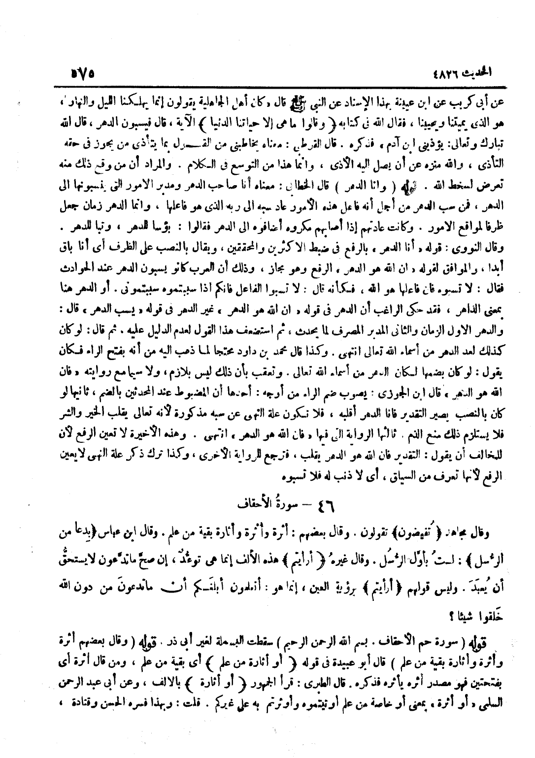عَن أبي كريب عَن بن عُيَيْنَةَ بِهَذَا الْإِسْنَادِ عَنِ النَّبِيِّ صَلَّى اللَّهُ عَلَيْهِ وَسَلَّمَ قَالَ كَانَ أَهْلُ الْجَاهِلِيَّةِ يَقُولُونَ إِنَّمَا يُهْلِكُنَا اللَّيْلُ وَالنَّهَارُ هُوَ الَّذِي يُمِيتُنَا وَيُحْيِينَا فَقَالَ اللَّهُ فِي كِتَابِهِ وَقَالُوا مَا هِيَ إِلَّا حياتنا الدُّنْيَا الْآيَةَ قَالَ فَيَسُبُّونَ الدَّهْرَ قَالَ اللَّهُ تَبَارَكَ وَتَعَالَى يُؤْذِينِي بن آدَمَ فَذَكَرَهُ قَالَ الْقُرْطُبِيُّ مَعْنَاهُ يُخَاطِبُنِي مِنَ الْقَوْلِ بِمَا يَتَأَذَّى مَنْ يَجُوزُ فِي حَقِّهِ التَّأَذِّي وَاللَّهُ مُنَزَّهٌ عَنْ أَنْ يَصِلَ إِلَيْهِ الْأَذَى وَإِنَّمَا هَذَا مِنَ التَّوَسُّعِ فِي الْكَلَامِ وَالْمُرَادُ أَنَّ مَنْ وَقَعَ ذَلِكَ مِنْهُ تَعَرَّضَ لِسَخَطِ اللَّهِ قَوْلُهُ وَأَنَا الدَّهْرُ قَالَ الْخَطَّابِيُّ مَعْنَاهُ أَنَا صَاحِبُ الدَّهْرِ وَمُدَبِّرُ الْأُمُورِ الَّتِي يَنْسُبُونَهَا إِلَى الدَّهْرِ فَمَنْ سَبَّ الدَّهْرَ مِنْ أَجْلِ أَنَّهُ فَاعِلُ هَذِهِ الْأُمُورَ عَادَ سَبُّهُ إِلَى رَبِّهِ الَّذِي هُوَ فَاعِلُهَا وَإِنَّمَا الدَّهْرُ زَمَانٌ جُعِلَ ظَرْفًا لِمَوَاقِعِ الْأُمُورِ وَكَانَتْ عَادَتُهُمْ إِذَا أَصَابَهُمْ مَكْرُوهٌ أَضَافُوهُ إِلَى الدَّهْرِ فَقَالُوا بُؤْسًا لِلدَّهْرِ وَتَبًّا لِلدَّهْرِ وَقَالَ النَّوَوِيُّ قَوْلُهُ أَنَا الدَّهْرُ بِالرَّفْعِ فِي ضَبْطِ الْأَكْثَرِينَ وَالْمُحَقِّقِينَ وَيُقَالُ بِالنَّصْبِ عَلَى الظَّرْفِ أَيْ أَنَا بَاقٍ أَبَدًا وَالْمُوَافِقُ لِقَوْلِهِ إِنَّ اللَّهَ هُوَ الدَّهْرُ الرَّفْعُ وَهُوَ مَجَازٌ وَذَلِكَ أَنَّ الْعَرَبَ كَانُوا يَسُبُّونَ الدَّهْرَ عِنْدَ الْحَوَادِثِ فَقَالَ لَا تَسُبُّوهُ فَإِنَّ فَاعِلَهَا هُوَ اللَّهُ فَكَأَنَّهُ قَالَ لَا تَسُبُّوا الْفَاعِلَ فَإِنَّكُمْ إِذَا سَبَبْتُمُوهُ سَبَبْتُمُونِي أَوِ الدَّهْرُ هُنَا بِمَعْنَى الدَّاهِرُ فَقَدْ حَكَى الرَّاغِبُ أَنَّ الدَّهْرَ فِي قَوْلِهِ إِنَّ اللَّهَ هُوَ الدَّهْرُ غَيْرُ الدَّهْرِ فِي قَوْلِهِ يَسُبُّ الدَّهْرَ قَالَ وَالدَّهْرُ الْأَوَّلُ الزَّمَانُ وَالثَّانِي الْمُدَبِّرُ الْمُصَرِّفُ لِمَا يَحْدُثُ ثُمَّ اسْتُضْعِفَ هَذَا الْقَوْلُ لِعَدَمِ الدَّلِيلِ عَلَيْهِ ثُمَّ قَالَ لَوْ كَانَ كَذَلِكَ لَعُدَّ الدَّهْرُ مِنْ أَسْمَاءِ اللَّهِ تَعَالَى انْتَهَى وَكَذَا قَالَ مُحَمَّدُ بْنُ دَاوُدَ مُحْتَجًّا لِمَا ذَهَبَ إِلَيْهِ مِنْ أَنَّهُ بِفَتْحِ الرَّاءِ فَكَانَ يَقُولُ لَوْ كَانَ بِضَمِّهَا لَكَانَ الدَّهْرُ مِنْ أَسْمَاءِ اللَّهِ تَعَالَى وَتُعُقِّبَ بِأَنَّ ذَلِكَ لَيْسَ بِلَازِمٍ وَلَا سِيَّمَا مَعَ رِوَايَتِهِ فَإِنَّ اللَّهَ هُوَ الدَّهْر قَالَ بن الْجَوْزِيُّ يُصَوَّبُ ضَمُّ الرَّاءِ مِنْ أَوْجُهٍ أَحَدُهَا أَنَّ الْمَضْبُوطَ عِنْدَ الْمُحَدِّثِينَ بِالضَّمِّ ثَانِيهَا لَوْ كَانَ بِالنَّصْبِ يَصِيرُ التَّقْدِيرُ فَأَنَا الدَّهْرُ أُقَلِّبُهُ فَلَا تَكُونُ عِلَّةُ النَّهْيِ عَنْ سَبِّهِ مَذْكُورَةٌ لِأَنَّهُ تَعَالَى يُقَلِّبُ الْخَيْرَ وَالشَّرَّ فَلَا يَسْتَلْزِمُ ذَلِكَ مَنْعُ الذَّمِّ ثَالِثُهَا الرِّوَايَةُ الَّتِي فِيهَا فَإِنَّ اللَّهَ هُوَ الدَّهْرُ انْتَهَى وَهَذِهِ الْأَخِيرَةُ لَا تُعَيِّنُ الرَّفْعَ لِأَنَّ لِلْمُخَالِفَ أَنْ يَقُولَ التَّقْدِيرُ فَإِنَّ اللَّهَ هُوَ الدَّهْرُ يُقَلِّبُ فَتَرْجِعُ لِلرِّوَايَةِ الْأُخْرَى وَكَذَا تَرْكُ ذِكْرِ عِلَّةِ النَّهْيِ لَا يُعَيِّنُ الرَّفْعَ لِأَنَّهَا تُعْرَفُ مِنَ السِّيَاقِ أَي لَا ذَنْب لَهُ فَلَا تسبوه