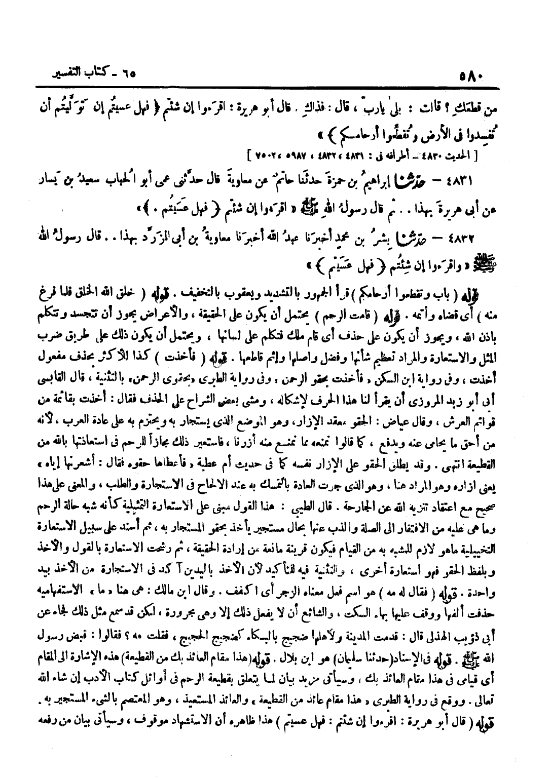 [4830] قَوْلُهُ خَلَقَ اللَّهُ الْخَلْقَ فَلَمَّا فَرَغَ مِنْهُ أَيْ قَضَاهُ وَأَتَمَّهُ قَوْلُهُ قَامَتِ الرَّحِمُ يَحْتَمِلُ أَنْ يَكُونَ عَلَى الْحَقِيقَةِ وَالْأَعْرَاضُ يَجُوزُ أَنْ تَتَجَسَّدَ وَتَتَكَلَّمُ بِإِذْنِ اللَّهِ وَيَجُوزُ أَنْ يَكُونَ عَلَى حَذْفٍ أَيْ قَامَ مَلَكٌ فَتَكَلَّمَ عَلَى لِسَانِهَا وَيَحْتَمِلُ أَنْ يَكُونَ ذَلِكَ عَلَى طَرِيقِ ضَرْبِ الْمَثَلِ وَالِاسْتِعَارَةِ وَالْمُرَادُ تَعْظِيمُ شَأْنِهَا وَفَضْلُ وَاصِلِهَا وَإِثْمُ قَاطِعِهَا قَوْلُهُ فَأَخَذَتْ كَذَا لِلْأَكْثَرِ بِحَذْفِ مَفْعُولِ أخذت وَفِي رِوَايَة بن السَّكَنِ فَأَخَذَتْ بِحَقْوِ الرَّحْمَنِ وَفِي رِوَايَةِ الطَّبَرِيِّ بِحَقْوَيِ الرَّحْمَنِ بِالتَّثْنِيَةِ قَالَ الْقَابِسِيُّ أَبَى أَبُو زَيْدٍ الْمَرْوَزِيُّ أَنْ يَقْرَأَ لَنَا هَذَا الْحَرْفَ لِإِشْكَالِهِ وَمَشَى بَعْضُ الشُّرَّاحِ عَلَى الْحَذْفِ فَقَالَ أَخَذَتْ بِقَائِمَةٍ مِنْ قَوَائِمِ الْعَرْشِ وَقَالَ عِيَاضٌ الْحَقْوُ مَعْقِدُ الْإِزَارِ وَهُوَ الْمَوْضِعُ الَّذِي يُسْتَجَارُ بِهِ وَيُحْتَزَمُ بِهِ عَلَى عَادَةِ الْعَرَبِ لِأَنَّهُ مِنْ أَحَقِّ مَا يُحَامَى عَنْهُ وَيُدْفَعُ كَمَا قَالُوا نَمْنَعُهُ مِمَّا نَمْنَعُ مِنْهُ أُزُرَنَا فَاسْتُعِيرَ ذَلِكَ مَجَازًا لِلرَّحِمِ فِي اسْتِعَاذَتِهَا بِاللَّهِ مِنَ الْقَطِيعَةِ انْتَهَى وَقَدْ يُطْلَقُ الْحَقْوُ عَلَى الْإِزَارِ نَفْسِهِ كَمَا فِي حَدِيثِ أُمِّ عَطِيَّةَ فَأَعْطَاهَا حَقْوَهُ فَقَالَ أَشْعِرْنَهَا إِيَّاهُ يَعْنِي إِزَارَهُ وَهُوَ الْمُرَادُ هُنَا وَهُوَ الَّذِي جَرَتِ الْعَادَةُ بِالتَّمَسُّكِ بِهِ عِنْدَ الْإِلْحَاحِ فِي الِاسْتِجَارَةِ وَالطَّلَبِ وَالْمَعْنَى عَلَى هَذَا صَحِيحٌ مَعَ اعْتِقَادِ تَنْزِيهِ اللَّهِ عَنِ الْجَارِحَةِ قَالَ الطِّيبِيُّ هَذَا الْقَوْلُ مَبْنِيٌّ عَلَى الِاسْتِعَارَةِ التَّمْثِيلِيَّةِ كَأَنَّهُ شَبَّهَ حَالَةَ الرَّحِمِ وَمَا هِيَ عَلَيْهِ مِنَ الِافْتِقَارِ إِلَى الصِّلَةِ وَالذَّبِّ عَنْهَا بِحَالِ مُسْتَجِيرٍ يَأْخُذُ بِحَقْوِ الْمُسْتَجَارِ بِهِ ثُمَّ أَسْنَدَ عَلَى سَبِيلِ الِاسْتِعَارَةِ التَّخْيِيلِيَّةِ مَا هُوَ لَازِمٌ لِلْمُشَبَّهِ بِهِ مِنَ الْقِيَامِ فَيَكُونُ قَرِينَةً مَانِعَةً مِنْ إِرَادَةِ الْحَقِيقَةِ ثُمَّ رُشِّحَتْ الِاسْتِعَارَةُ بِالْقَوْلِ وَالْأَخْذِ وَبِلَفْظِ الْحَقْوِ فَهُوَ اسْتِعَارَةٌ أُخْرَى وَالتَّثْنِيَةُ فِيهِ لِلتَّأْكِيدِ لِأَنَّ الْأَخْذَ بِالْيَدَيْنِ آكَدُ فِي الِاسْتِجَارَةِ مِنَ الْأَخْذِ بِيَدٍ وَاحِدَةٍ قَوْلُهُ فَقَالَ لَهُ مَهْ هُوَ اسْمُ فعل مَعْنَاهُ الزّجر أَي اكفف وَقَالَ بن مَالِكٍ هِيَ هُنَا مَا الِاسْتِفْهَامِيَّةُ حُذِفَتْ أَلِفُهَا وَوُقِفَ عَلَيْهَا بِهَاءِ السَّكْتِ وَالشَّائِعُ أَنْ لَا يُفْعَلَ ذَلِكَ إِلَّا وَهِيَ مَجْرُورَةٌ لَكِنْ قَدْ سُمِعَ مِثْلُ ذَلِكَ فَجَاءَ عَنْ أَبِي ذُؤَيْبٍ الْهُذَلِيِّ قَالَ قَدِمْتُ الْمَدِينَةَ وَلِأَهْلِهَا ضَجِيجٌ بِالْبُكَاءِ كَضَجِيجِ الْحَجِيجِ فَقُلْتُ مَهْ فَقَالُوا قُبِضَ رَسُولِ اللَّهِ صَلَّى اللَّهُ عَلَيْهِ وَسَلَّمَ قَوْلُهُ فِي الْإِسْنَاد حَدثنَا سُلَيْمَان هُوَ بن بِلَالٍ قَوْلُهُ هَذَا مَقَامُ الْعَائِذِ بِكَ مِنَ الْقَطِيعَةِ هَذِهِ الْإِشَارَةُ إِلَى الْمَقَامِ أَيْ قِيَامِي فِي هَذَا مَقَامُ الْعَائِذِ بِكَ وَسَيَأْتِي مَزِيدُ بَيَانٍ لِمَا يَتَعَلَّقُ بِقَطِيعَةِ الرَّحِمِ فِي أَوَائِلِ كِتَابِ الْأَدَبِ إِنْ شَاءَ اللَّهُ تَعَالَى وَوَقَعَ فِي رِوَايَةِ الطَّبَرِيِّ هَذَا مَقَامُ عَائِذٍ مِنَ الْقَطِيعَةِ وَالْعَائِذُ الْمُسْتَعِيذُ وَهُوَ الْمُعْتَصِمُ بِالشَّيْءِ الْمُس