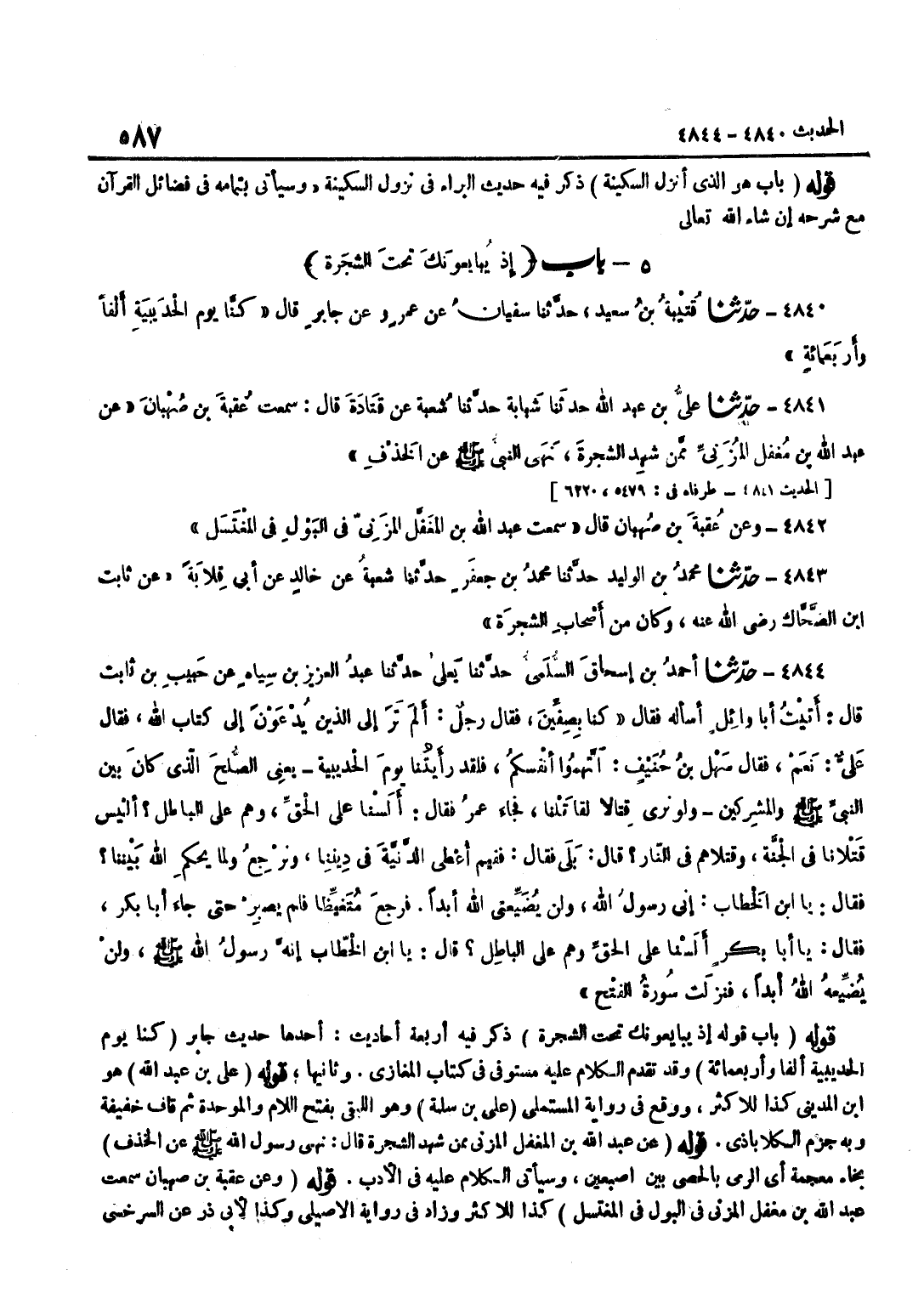 [4840] كُنَّا يَوْمَ الْحُدَيْبِيَةِ أَلْفًا وَأَرْبَعَمِائَةٍ وَقَدْ تَقَدَّمَ الْكَلَامُ عَلَيْهِ مُسْتَوْفًى فِي كِتَابِ الْمَغَازِي وَثَانِيهَا قَوْله على بن عبد الله هُوَ بن الْمَدِينِيِّ كَذَا لِلْأَكْثَرِ وَوَقَعَ فِي رِوَايَةِ الْمُسْتَمْلِيِّ عَلِيُّ بْنُ سَلَمَةَ وَهُوَ اللَّبَقِيُّ بِفَتْحِ اللَّامِ وَالْمُوَحَّدَةِ ثُمَّ قَافٍ خَفِيفَةٍ وَبِهِ جَزَمَ الْكَلَابَاذِيُّ