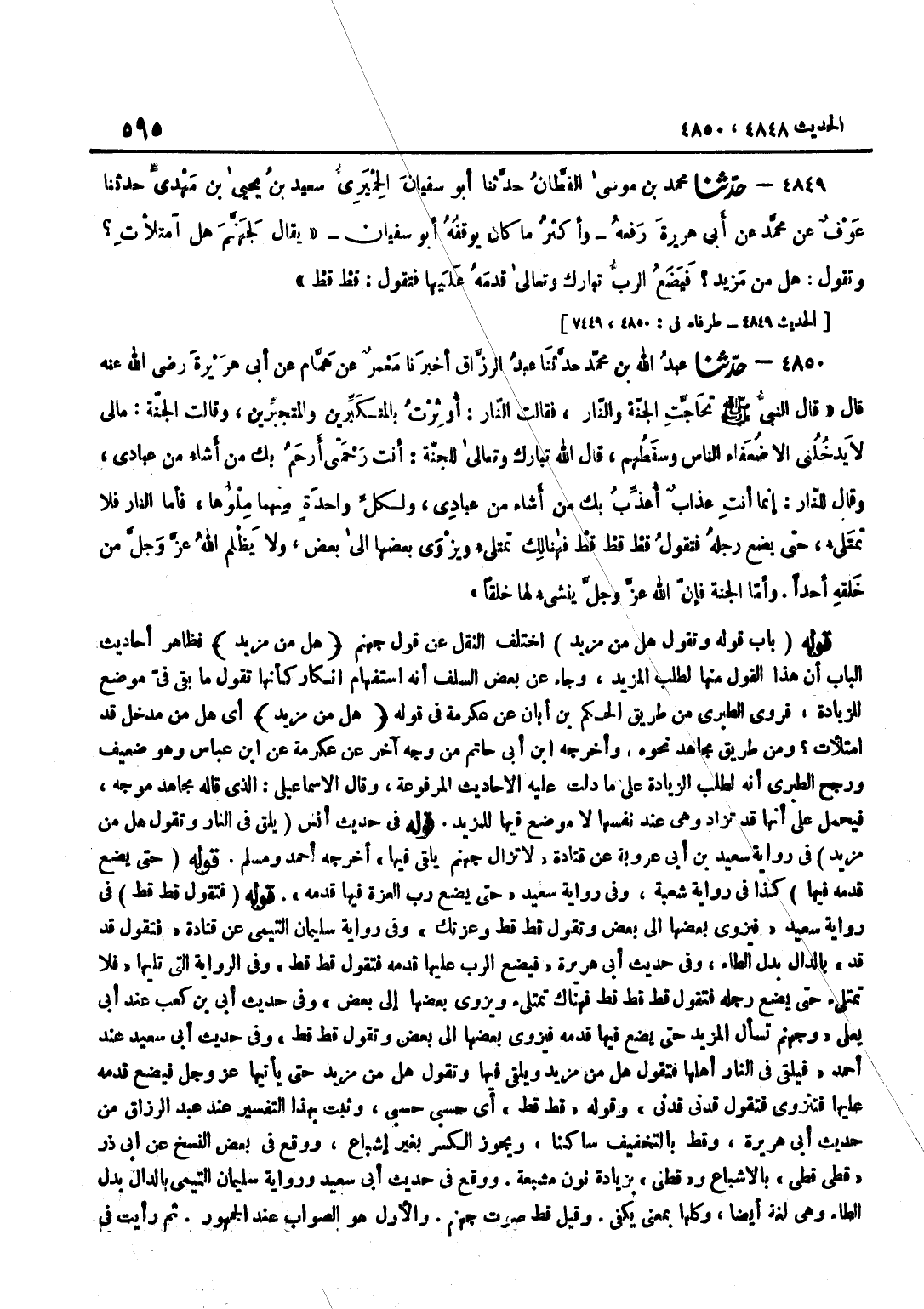 اخْتَلَفَ النَّقْلُ عَنْ قَوْلِ جَهَنَّمَ هَلْ مِنْ مزِيد فَظَاهِرُ أَحَادِيثِ الْبَابِ أَنَّ هَذَا الْقَوْلَ مِنْهَا لِطَلَبِ الْمَزِيدِ وَجَاءَ عَنْ بَعْضِ السَّلَفِ أَنَّهُ اسْتِفْهَامُ إِنْكَارٍ كَأَنَّهَا تَقُولُ مَا بَقِيَ فِي مَوْضِعٍ لِلزِّيَادَةِ فَرَوَى الطَّبَرِيُّ مِنْ طَرِيقِ الْحَكَمِ بْنِ أَبَانٍ عَنْ عِكْرِمَةَ فِي قَوْلِهِ هَلْ من مزِيد أَيْ هَلْ مِنْ مَدْخَلٍ قَدِ امْتَلَأَتْ وَمِنْ طَرِيق مُجَاهِد نَحوه وَأخرجه بن أَبِي حَاتِمٍ مِنْ وَجْهٍ آخَرَ عَنْ عِكْرِمَةَ عَن بن عَبَّاسٍ وَهُوَ ضَعِيفٌ وَرَجَّحَ الطَّبَرِيُّ أَنَّهُ لِطَلَبِ الزِّيَادَةِ عَلَى مَا دَلَّتْ عَلَيْهِ الْأَحَادِيثُ الْمَرْفُوعَةُ وَقَالَ الْإِسْمَاعِيلِيُّ الَّذِي قَالَهُ مُجَاهِدٌ مُوَجَّهٌ فَيُحْمَلُ عَلَى أَنَّهَا قَدْ تُزَادُ وَهِيَ عِنْدَ نَفْسِهَا لَا مَوْضِعَ فِيهَا لِلْمَزِيدِ قَوْلُهُ فِي حَدِيثِ أنس