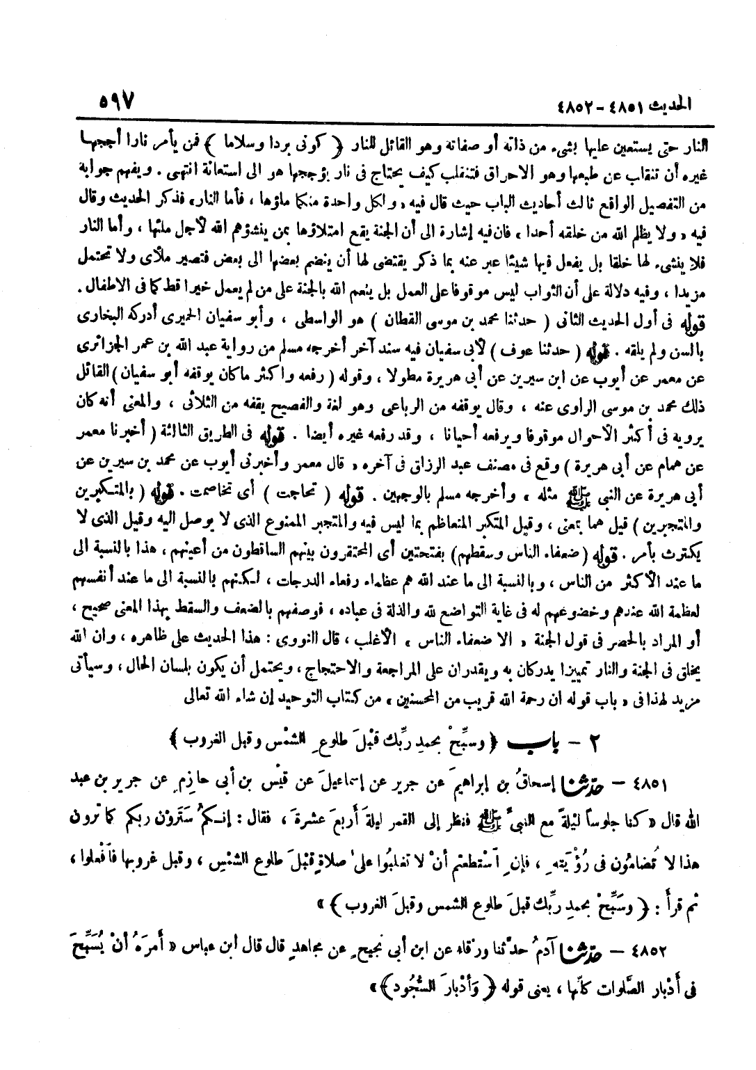 [4849] حَدَّثَنَا مُحَمَّدُ بْنُ مُوسَى الْقَطَّانُ هُوَ الْوَاسِطِيُّ وَأَبُو سُفْيَانَ الْحِمْيَرِيُّ أَدْرَكَهُ الْبُخَارِيُّ بِالسِّنِّ وَلَمْ يَلْقَهُ قَوْلُهُ حَدَّثَنَا عَوْفٌ لِأَبِي سُفْيَانَ فِيهِ سَنَدٌ آخَرُ أَخْرَجَهُ مُسْلِمٌ مِنْ رِوَايَةِ عَبْدِ اللَّهِ بْنِ عُمَرَ الْجَزَائِرِيِّ عَنْ معمر عَن أَيُّوب عَن بن سِيرِينَ عَنْ أَبِي هُرَيْرَةَ مُطَوَّلًا وَقَوْلُهُ رَفَعَهُ وَأَكْثَرُ مَا كَانَ يُوقِفُهُ أَبُو سُفْيَانَ الْقَائِلُ ذَلِكَ مُحَمَّدُ بْنُ مُوسَى الرَّاوِي عَنْهُ وَقَالَ يُوقِفُهُ مِنَ الرُّبَاعِيِّ وَهُوَ لُغَةٌ وَالْفَصِيحُ يَقِفُهُ مِنَ الثُّلَاثِيِّ وَالْمَعْنَى أَنَّهُ كَانَ يَرْوِيهِ فِي أَكْثَرِ الْأَحْوَالِ مَوْقُوفًا وَيَرْفَعُهُ أَحْيَانًا وَقَدْ رَفَعَهُ غَيْرُهُ أَيْضًا