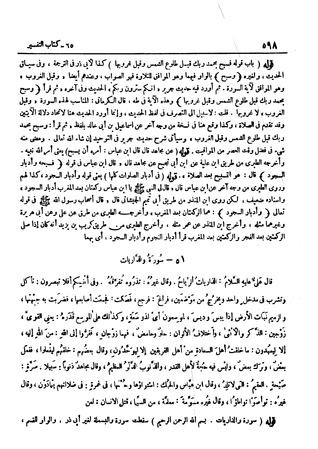[4852] قَوْلُهُ عَنْ مُجَاهِد قَالَ قَالَ بن عَبَّاسٍ أَمَرَهُ أَنْ يُسَبِّحَ يَعْنِي أَمَرَ اللَّهُ نبيه وَأخرجه الطَّبَرِيّ من طَرِيق بن علية عَن بن أبي نجيح عَن مُجَاهِد قَالَ قَالَ بن عَبَّاس فِي قَوْله فسبحه وأدبار السُّجُود قَالَ هُوَ التَّسْبِيحُ بَعْدَ الصَّلَاةِ قَوْلُهُ فِي أَدْبَارِ الصَّلَوَاتِ كُلِّهَا يَعْنِي قَوْلَهُ وَأَدْبَارَ السُّجُودِ كَذَا لَهُمْ وَرَوَى الطَّبَرِيُّ مِنْ وَجْهٍ آخَرَ عَن بن عَبَّاسٍ قَالَ قَالَ لِي النَّبِيُّ صَلَّى اللَّهُ عَلَيْهِ وَسَلَّمَ يَا بن عَبَّاسٍ رَكْعَتَانِ بَعْدَ الْمَغْرِبِ أَدْبَارَ السُّجُودِ وَإِسْنَادُهُ ضَعِيف لَكِن روى بن الْمُنْذِرِ مِنْ طَرِيقِ أَبِي تَمِيمٍ الْجَيْشَانِيِّ قَالَ قَالَ أَصْحَابِ رَسُولِ اللَّهِ صَلَّى اللَّهُ عَلَيْهِ وَسَلَّمَ فِي قَوْله تَعَالَى وأدبار السُّجُود هُمَا الرَّكْعَتَانِ بَعْدَ الْمَغْرِبِ وَأَخْرَجَهُ الطَّبَرِيُّ مِنْ طُرُقٍ عَنْ عَلِيٍّ وَعَنْ أَبِي هُرَيْرَةَ وَغَيْرِهِمَا مثله وَأخرج بن الْمُنْذِرِ عَنْ عُمَرَ مِثْلَهُ وَأَخْرَجَ الطَّبَرِيُّ مِنْ طَرِيقِ كُرَيْبِ بْنِ يَزِيدَ أَنَّهُ كَانَ إِذَا صَلَّى الرَّكْعَتَيْنِ بَعْدَ الْفَجْرِ وَالرَّكْعَتَيْنِ بَعْدَ الْمَغْرِبِ قَرَأَ أَدْبَارَ النُّجُومِ وَأَدْبَارَ السُّجُودِ أَيْ بِهِمَا