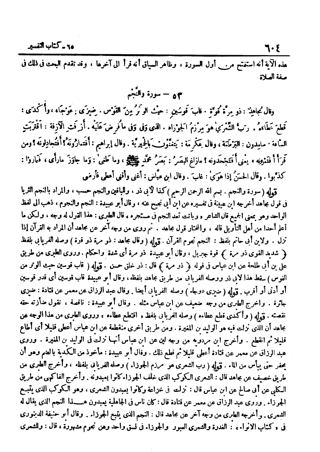 كَذَا لِأَبِي ذَرٍّ وَلِلْبَاقِينَ وَالنَّجْمِ حَسْبُ وَالْمُرَادُ بِالنَّجْمِ الثريا فِي قَول مُجَاهِد أخرجه بن عُيَيْنَة فِي تَفْسِيره عَن بن أَبِي نَجِيحٍ عَنْهُ وَقَالَ أَبُو عُبَيْدَةَ النَّجْمُ وَالنُّجُومُ ذَهَبَ إِلَى لَفْظِ الْوَاحِدِ وَهُوَ بِمَعْنَى الْجَمِيعِ قَالَ الشَّاعِرُ وَبَاتَتْ تَعُدُّ النَّجْمَ فِي مُسْتَجَرِّهِ قَالَ الطَّبَرِيُّ هَذَا الْقَوْلُ لَهُ وَجْهٌ وَلَكِنْ مَا أَعْلَمُ أَحَدًا مِنْ أَهْلِ التَّأْوِيلِ قَالَهُ وَالْمُخْتَارُ قَوْلُ مُجَاهِدٍ ثُمَّ رَوَى مِنْ وَجْهٍ آخَرَ عَنْ مُجَاهِدٍ أَنَّ الْمُرَادَ بِهِ الْقُرْآنُ إِذَا نَزَلَ وَلِابْنِ أَبِي حَاتِمٍ بِلَفْظِ النَّجْمُ نُجُومُ الْقُرْآنِ قَوْلُهُ وَقَالَ مُجَاهِدٌ ذُو مِرَّةٍ ذُو قُوَّةٍ وَصَلَهُ الْفِرْيَابِيُّ بِلَفْظِ شَدِيدُ الْقُوَى ذُو مِرَّةٍ قُوَّةُ جِبْرِيلَ وَقَالَ أَبُو عُبَيْدَةَ ذُو مِرَّةٍ أَيْ شِدَّةٍ وَإِحْكَامٍ وَرَوَى الطَّبَرِيُّ مِنْ طَرِيقِ عَلِيِّ بْنِ أَبِي طَلْحَةَ عَنِ بن عَبَّاس فِي قَوْله ذُو مرّة قَالَ ذُو خَلْقٍ حَسَنٍ قَوْلُهُ قَابَ قَوْسَيْنِ حَيْثُ الْوَتَرُ مِنَ الْقَوْسِ سَقَطَ هَذَا لِأَبِي ذَرٍّ وَوَصَلَهُ الْفِرْيَابِيُّ مِنْ طَرِيقِ مُجَاهِدٍ بِلَفْظِهِ وَقَالَ أَبُو عُبَيْدَةَ قَابَ قَوْسَيْنِ أَيْ قَدْرَ قَوْسَيْنِ أَوْ أَدْنَى أَوْ أَقْرَبَ قَوْلُهُ ضِيزَى عَوْجَاءُ وَصَلَهُ الْفِرْيَابِيُّ أَيْضًا وَقَالَ عَبْدُ الرَّزَّاقِ عَنْ مَعْمَرٍ عَنْ قَتَادَةَ ضِيزَى جَائِرَةٌ وَأَخْرَجَ الطَّبَرِيّ من وَجه ضَعِيف عَن بن عَبَّاسٍ مِثْلَهُ وَقَالَ أَبُو عُبَيْدَةَ نَاقِصَةٌ تَقُولُ ضَأَزْتُهُ حَقَّهُ نَقَصْتُهُ قَوْلُهُ وَأَكْدَى قَطَعَ عَطَاءَهُ وَصَلَهُ الْفِرْيَابِيُّ بِلَفْظِ اقْتَطَعَ عَطَاءَهُ وَرَوَى الطَّبَرِيُّ مِنْ هَذَا الْوَجْهِ عَنْ مُجَاهِدٍ أَنَّ الَّذِي نَزَلَتْ فِيهِ هُوَ الْوَلِيدُ بْنُ الْمُغِيرَةِ وَمِنْ طَرِيق أُخْرَى مُنْقَطِعَة عَن بن عَبَّاسٍ أَعْطَى قَلِيلًا أَيْ أَطَاعَ قَلِيلًا ثُمَّ انْقَطع وَأخرج بن مرْدَوَيْه من وَجه لين عَن بن عَبَّاسٍ أَنَّهَا نَزَلَتْ فِي الْوَلِيدِ بْنِ الْمُغِيرَةِ وَرَوَى عَبْدُ الرَّزَّاقِ عَنْ مَعْمَرٍ عَنْ قَتَادَةَ أَعْطَى قَلِيلًا ثُمَّ قَطَعَ ذَلِكَ وَقَالَ أَبُو عُبَيْدَةَ مَأْخُوذٌ مِنَ الْكُدْيَةِ بِالضَّمِّ وَهُوَ أَنْ يَحْفِرَ حَتَّى يَيْأَسَ مِنَ الْمَاءِ قَوْلُهُ رَبُّ الشعرى هُوَ مِرْزَمُ الْجَوْزَاءِ وَصَلَهُ الْفِرْيَابِيُّ بِلَفْظِهِ وَأَخْرَجَ الطَّبَرِيُّ مِنْ طَرِيقِ خُصَيْفٍ عَنْ مُجَاهِدٍ قَالَ الشِّعْرَى الْكَوْكَبُ الَّذِي خَلْفَ الْجَوْزَاءِ كَانُوا يَعْبُدُونَهُ وَأَخْرَجَ الْفَاكِهِيُّ مِنْ طَرِيقِ الْكَلْبِيِّ عَنْ أَبِي صَالِحٍ عَنِ بن عَبَّاسٍ قَالَ نَزَلَتْ فِي خُزَاعَةَ وَكَانُوا يَعْبُدُونَ الشِّعْرَى وَهُوَ الْكَوْكَبُ الَّذِي يَتْبَعُ الْجَوْزَاءَ وَرَوَى عَبْدُ الرَّزَّاقِ عَنْ مَعْمَرٍ عَنْ قَتَادَةَ قَالَ كَانَ نَاسٌ فِي الْجَاهِلِيَّةِ يَعْبُدُونَ هَذَا النَّجْمَ الَّذِي يُقَالُ لَهُ الشِّعْرَى وَأَخْرَجَهُ الطَّبَرِيُّ مِنْ وَجْهٍ آخَرَ عَنْ مُجَاهِدٍ قَالَ النَّجْمُ الَّذِي يَتْبَعُ الْجَوْزَاءَ وَقَالَ أَبُو حَنِيفَةَ الدَّيْنَوَرِيُّ فِي كتاب الأنواء الغدرة وَالشِّعْرَى الْعَبُورُ وَالْجَوْزَاءُ فِي نَسَقٍ وَاحِدٍ وَهُنَّ نُجُومٌ مَشْهُورَةٌ قَالَ وَلِلشِّعْرَى