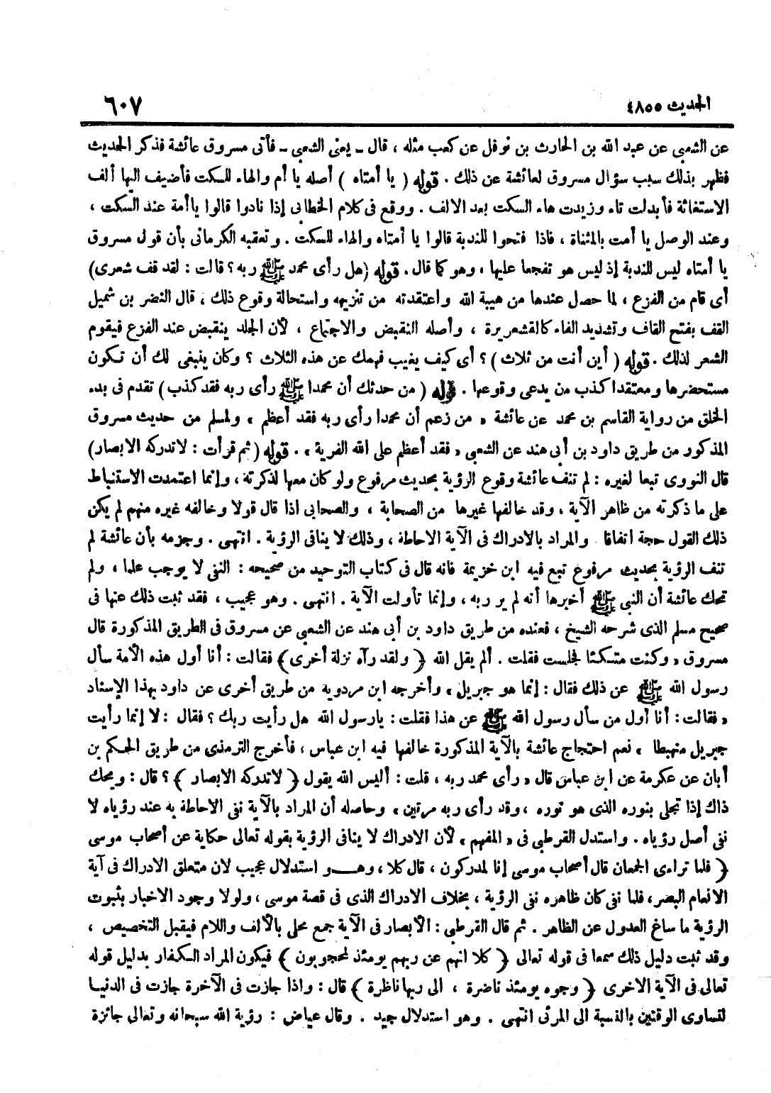 عَنِ الشَّعْبِيِّ عَنْ عَبْدِ اللَّهِ بْنِ الْحَارِثِ بْنِ نَوْفَلٍ عَنْ كَعْبٍ مِثْلَهُ قَالَ يَعْنِي الشَّعْبِيَّ فَأَتَى مَسْرُوقٌ عَائِشَةَ فَذَكَرَ الْحَدِيثَ فَظَهَرَ بِذَلِكَ سَبَبُ سُؤَالِ مَسْرُوقٍ لِعَائِشَةَ عَنْ ذَلِكَ قَوْلُهُ يَا أُمَّتَاهُ أَصْلُهُ يَا أُمَّ وَالْهَاءُ لِلسَّكْتِ فَأُضِيفَ إِلَيْهَا أَلِفُ الِاسْتِغَاثَةِ فَأُبْدِلَتْ تَاءً وَزِيدَتْ هَاءُ السَّكْتِ بَعْدَ الْأَلِفِ وَوَقَعَ فِي كَلَامِ الْخَطَّابِيِّ إِذَا نَادَوْا قَالُوا يَا أُمَّهْ عِنْد السكت وَعند الْوَصْل يَا أمت بِالْمُثَنَّاةِ فَإِذَا فَتَحُوا لِلنُّدْبَةِ قَالُوا يَا أُمَّتَاهُ وَالْهَاءُ لِلسَّكْتِ وَتَعَقَّبَهُ الْكِرْمَانِيُّ بِأَنَّ قَوْلَ مَسْرُوقٍ يَا أُمَّتَاهُ لَيْسَ لِلنُّدْبَةِ إِذْ لَيْسَ هُوَ تَفَجُّعًا عَلَيْهَا وَهُوَ كَمَا قَالَ قَوْلُهُ هَلْ رَأَى مُحَمَّدٌ صَلَّى اللَّهُ عَلَيْهِ وَسَلَّمَ رَبَّهُ قَالَتْ لَقَدْ قَفَّ شَعْرِي أَيْ قَامَ مِنَ الْفَزَعِ لِمَا حَصَلَ عِنْدَهَا مِنْ هَيْبَةِ اللَّهِ وَاعْتَقَدَتْهُ مِنْ تَنْزِيهِهِ وَاسْتِحَالَةِ وُقُوعِ ذَلِكَ قَالَ النَّضْرُ بْنُ شُمَيْلٍ الْقَفُّ بِفَتْحِ الْقَافِ وَتَشْدِيدِ الْفَاءِ كَالْقُشَعْرِيرَةِ وَأَصْلُهُ التَّقَبُّضُ وَالِاجْتِمَاعُ لِأَنَّ الْجِلْدَ يَنْقَبِضُ عِنْدَ الْفَزَعِ فَيَقُومُ الشَّعْرُ لِذَلِكَ قَوْلُهُ أَيْنَ أَنْتَ مِنْ ثَلَاثٍ أَيْ كَيْفَ يَغِيبُ فهمك عَن هَذِه الثَّلَاث وَكَانَ يَنْبَغِي لَكَ أَنْ تَكُونَ مُسْتَحْضِرَهَا وَمُعْتَقِدًا كَذِبَ مَنْ يَدَّعِي وُقُوعَهَا قَوْلُهُ مَنْ حَدَّثَكَ أَنَّ مُحَمَّدًا صَلَّى اللَّهُ عَلَيْهِ وَسَلَّمَ رَأَى رَبَّهُ فَقَدْ كَذَبَ تَقَدَّمَ فِي بَدْءِ الْخَلْقِ مِنْ رِوَايَةِ الْقَاسِمِ بْنِ مُحَمَّدٍ عَنْ عَائِشَةَ مَنْ زَعَمَ أَنَّ مُحَمَّدًا رَأَى رَبَّهُ فَقَدْ أَعْظَمَ وَلِمُسْلِمٍ مِنْ حَدِيثِ مَسْرُوقٍ الْمَذْكُورِ مِنْ طَرِيقِ دَاوُدَ بْنِ أَبِي هِنْدٍ عَنِ الشَّعْبِيِّ فَقَدْ أَعْظَمَ عَلَى اللَّهِ الْفِرْيَةَ قَوْلُهُ ثُمَّ قَرَأت لَا تُدْرِكهُ الْأَبْصَار قَالَ النَّوَوِيُّ تَبَعًا لِغَيْرِهِ لَمْ تَنْفِ عَائِشَةُ وُقُوعَ الرُّؤْيَةِ بِحَدِيثٍ مَرْفُوعٍ وَلَوْ كَانَ مَعَهَا لَذَكَرَتْهُ وَإِنَّمَا اعْتَمَدَتْ الِاسْتِنْبَاطَ عَلَى مَا ذَكَرَتْهُ مِنْ ظَاهِرِ الْآيَةِ وَقَدْ خَالَفَهَا غَيْرُهَا مِنَ الصَّحَابَةِ وَالصَّحَابِيُّ إِذَا قَالَ قَوْلًا وَخَالَفَهُ غَيْرُهُ مِنْهُمْ لَمْ يَكُنْ ذَلِكَ الْقَوْلُ حُجَّةً اتِّفَاقًا وَالْمُرَادُ بِالْإِدْرَاكِ فِي الْآيَةِ الْإِحَاطَةُ وَذَلِكَ لَا يُنَافِي الرُّؤْيَةَ انْتَهَى وَجَزْمُهُ بِأَنَّ عَائِشَةَ لَمْ تنف الرُّؤْيَة بِحَدِيث مَرْفُوع تبع فِيهِ بن خُزَيْمَةَ فَإِنَّهُ قَالَ فِي كِتَابِ التَّوْحِيدِ مِنْ صَحِيحِهِ النَّفْيُ لَا يُوجِبُ عِلْمًا وَلَمْ تَحْكِ عَائِشَةَ أَنَّ النَّبِيَّ صَلَّى اللَّهُ عَلَيْهِ وَسَلَّمَ أَخْبَرَهَا أَنَّهُ لَمْ يَرَ رَبَّهُ وَإِنَّمَا تَأَوَّلَتِ الْآيَةَ انْتَهَى وَهُوَ عَجِيبٌ فَقَدْ ثَبَتَ ذَلِكَ عَنْهَا فِي صَحِيحِ مُسْلِمٍ الَّذِي شَرَحَهُ الشَّيْخُ فَعِنْدَهُ مِنْ طَرِيقِ دَاوُدَ بْنِ أَبِي هِنْدٍ عَنِ الشَّعْبِيِّ عَنْ مَسْرُوقٍ فِي الطَّرِيقِ الْمَذْكُورَةِ قَالَ مَسْرُوقٌ وَكُنْتُ مُتَّكِئًا فَجَلَسْتُ فَقُلْتُ أَلَمْ يقل الله وَلَقَد رَآهُ نزلة أُخْرَى فَقَالَتْ أَنَا أَوَّلُ هَذِهِ الْأُمَّةِ سَأَلَ رَسُولَ اللَّهِ صَلَّى اللَّهُ عَلَيْهِ وَسَلَّمَ عَنْ ذَلِكَ فَقَالَ إِنَّمَا هُوَ جِبْرِيل وَأخرجه بن مَرْدَوَيْهِ مِنْ طَرِيقٍ أُخْرَى عَنْ دَاوُدَ بِهَذَا الْإِسْنَادِ فَقَالَتْ أَنَا أَوَّلُ مَنْ سَأَلَ رَسُولَ ال