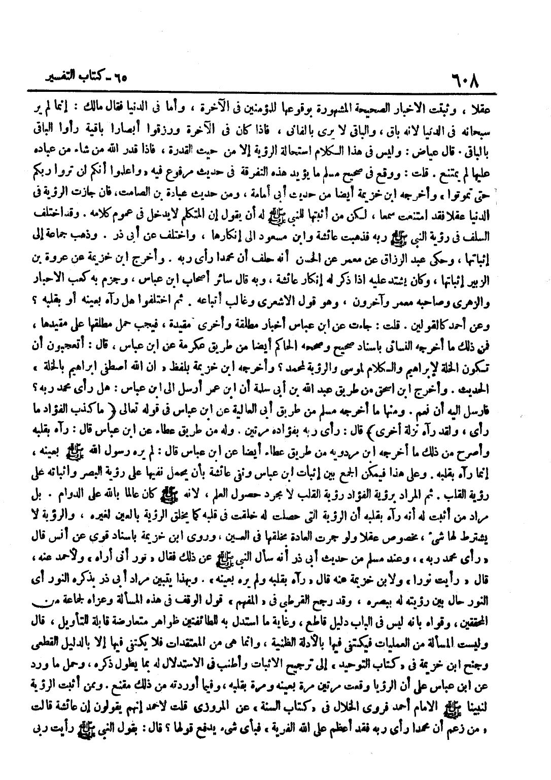 عَقْلًا وَثَبَتَتِ الْأَخْبَارُ الصَّحِيحَةُ الْمَشْهُورَةُ بِوُقُوعِهَا لِلْمُؤْمِنِينَ فِي الْآخِرَةِ وَأَمَّا فِي الدُّنْيَا فَقَالَ مَالِكٌ إِنَّمَا لَمْ يُرَ سُبْحَانَهُ فِي الدُّنْيَا لِأَنَّهُ بَاقٍ وَالْبَاقِي لَا يُرَى بِالْفَانِي فَإِذَا كَانَ فِي الْآخِرَةِ وَرُزِقُوا أَبْصَارًا بَاقِيَةً رَأَوُا الْبَاقِيَ بِالْبَاقِي قَالَ عِيَاضٌ وَلَيْسَ فِي هَذَا الْكَلَامِ اسْتِحَالَةُ الرُّؤْيَةِ إِلَّا مِنْ حَيْثُ الْقُدْرَةِ فَإِذَا قَدَّرَ اللَّهُ مَنْ شَاءَ مِنْ عِبَادِهِ عَلَيْهَا لَمْ يَمْتَنِعْ قُلْتُ وَوَقَعَ فِي صَحِيحِ مُسْلِمٍ مَا يُؤَيِّدُ هَذِهِ التَّفْرِقَةَ فِي حَدِيثٍ مَرْفُوعٍ فِيهِ وَاعْلَمُوا أَنَّكُمْ لَنْ تَرَوْا رَبَّكُمْ حَتَّى تَمُوتُوا وَأخرجه بن خُزَيْمَةَ أَيْضًا مِنْ حَدِيثِ أَبِي أُمَامَةَ وَمِنْ حَدِيثِ عُبَادَةَ بْنِ الصَّامِتِ فَإِنْ جَازَتِ الرُّؤْيَةُ فِي الدُّنْيَا عَقْلًا فَقَدِ امْتَنَعَتْ سَمْعًا لَكِنْ مَنْ أَثْبَتَهَا لِلنَّبِيِّ صَلَّى اللَّهُ عَلَيْهِ وَسَلَّمَ لَهُ أَنْ يَقُولَ إِنَّ الْمُتَكَلِّمَ لَا يَدْخُلُ فِي عُمُومِ كَلَامِهِ وَقَدِ اخْتَلَفَ السَّلَفُ فِي رُؤْيَةِ النَّبِيِّ صَلَّى اللَّهُ عَلَيْهِ وَسَلَّمَ رَبَّهُ فَذَهَبت عَائِشَة وبن مَسْعُودٍ إِلَى إِنْكَارِهَا وَاخْتُلِفَ عَنْ أَبِي ذَرٍّ وَذَهَبَ جَمَاعَةٌ إِلَى إِثْبَاتِهَا وَحَكَى عَبْدُ الرَّزَّاقِ عَنْ مَعْمَرٍ عَنِ الْحَسَنِ أَنَّهُ حَلَفَ أَنَّ مُحَمَّدًا رأى ربه وَأخرج بن خُزَيْمَةَ عَنْ عُرْوَةَ بْنِ الزُّبَيْرِ إِثْبَاتَهَا وَكَانَ يَشْتَدُّ عَلَيْهِ إِذَا ذُكِرَ لَهُ إِنْكَارُ عَائِشَةَ وَبِه قَالَ سَائِر أَصْحَاب بن عَبَّاسٍ وَجَزَمَ بِهِ كَعْبُ الْأَحْبَارِ وَالزُّهْرِيُّ وَصَاحِبُهُ مَعْمَرٌ وَآخَرُونَ وَهُوَ قَوْلُ الْأَشْعَرِيِّ وَغَالِبِ أَتْبَاعِهِ ثُمَّ اخْتَلَفُوا هَلْ رَآهُ بِعَيْنِهِ أَوْ بِقَلْبِهِ وَعَن أَحْمد كالقولين قلت جَاءَت عَن بن عَبَّاسٍ أَخْبَارٌ مُطْلَقَةٌ وَأُخْرَى مُقَيَّدَةٌ فَيَجِبُ حَمْلُ مُطْلَقِهَا عَلَى مُقَيَّدِهَا فَمِنْ ذَلِكَ مَا أَخْرَجَهُ النَّسَائِيُّ بِإِسْنَادٍ صَحِيحٍ وَصَحَّحَهُ الْحَاكِمُ أَيْضًا مِنْ طَرِيق عِكْرِمَة عَن بن عَبَّاسٍ قَالَ أَتَعْجَبُونَ أَنْ تَكُونَ الْخُلَّةُ لِإِبْرَاهِيمَ وَالْكَلَام لمُوسَى والرؤية لمُحَمد وَأخرجه بن خُزَيْمَةَ بِلَفْظِ إِنَّ اللَّهَ اصْطَفَى إِبْرَاهِيمَ بِالْخُلَّةِ الحَدِيث وَأخرج بن إِسْحَاقَ مِنْ طَرِيقِ عَبْدِ اللَّهِ بْنِ أَبِي سَلَمَةَ أَن بن عمر أرسل إِلَى بن عَبَّاسٍ هَلْ رَأَى مُحَمَّدٌ رَبَّهُ فَأَرْسَلَ إِلَيْهِ أَنْ نَعَمْ وَمِنْهَا مَا أَخْرَجَهُ مُسْلِمٌ مِنْ طَرِيق أبي الْعَالِيَة عَن بن عَبَّاسٍ فِي قَوْلِهِ تَعَالَى مَا كَذَبَ الْفُؤَادُ مَا رأى وَلَقَد رَآهُ نزلة أُخْرَى قَالَ رَأَى رَبَّهُ بِفُؤَادِهِ مَرَّتَيْنِ وَلَهُ مِنْ طَرِيق عَطاء عَن بن عَبَّاسٍ قَالَ رَآهُ بِقَلْبِهِ وَأَصْرَحُ مِنْ ذَلِكَ مَا أخرجه بن مرْدَوَيْه من طَرِيق عَطاء أَيْضا عَن بن عَبَّاسٍ قَالَ لَمْ يَرَهُ رَسُولُ اللَّهِ صَلَّى اللَّهُ عَلَيْهِ وَسَلَّمَ بِعَيْنِهِ إِنَّمَا رَآهُ بِقَلْبِهِ وعَلى هَذَا فَيمكن الْجمع بَين إِثْبَات بن عَبَّاسٍ وَنَفْيِ عَائِشَةَ بِأَنْ يُحْمَلَ نَفْيُهَا عَلَى رُؤْيَةِ الْبَصَرِ وَإِثْبَاتُهُ عَلَى رُؤْيَةِ الْقَلْبِ ثُمَّ الْمُرَادُ بِرُؤْيَةِ الْفُؤَادِ رُؤْيَةُ الْقَلْبِ لَا مُجَرَّدَ حُصُولِ الْعِلْمِ لِأَنَّهُ صَلَّى اللَّهُ عَلَيْهِ وَسَلَّمَ كَانَ عَالِمًا بِاللَّهِ عَلَى الدَّوَامِ بَلْ مُرَادُ مَنْ أَثْبَتَ لَهُ أَنَّهُ رَآهُ بِقَلْبِهِ أَنَّ الرُّؤْيَةَ الَّتِي حَصَلَتْ لَهُ خُلِقَتْ فِي قَلْبِهِ كَمَا يَخْلُق