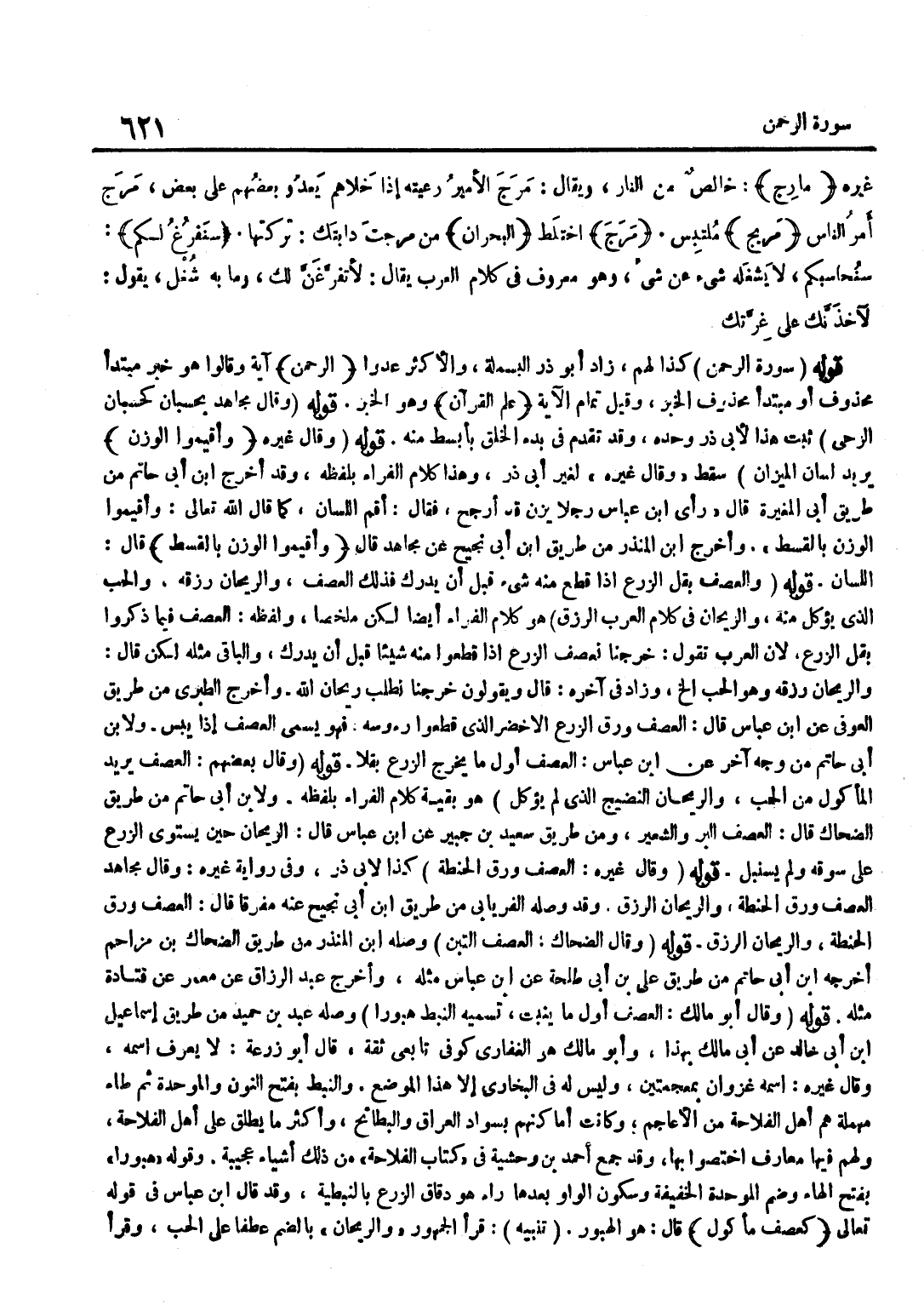 كَذَا لَهُمْ زَادَ أَبُو ذَرٍّ الْبَسْمَلَةَ وَالْأَكْثَرُ عَدُّوا الرَّحْمَنِ آيَةً وَقَالُوا هُوَ خَبَرُ مُبْتَدَأٍ مَحْذُوفٍ أَوْ مُبْتَدَأٌ مَحْذُوفُ الْخَبَر وَقيل تَمام الْآيَة علم الْقُرْآن وَهُوَ الْخَبَرُ قَوْلُهُ وَقَالَ مُجَاهِدٌ بِحُسْبَانٍ كَحُسْبَانِ الرَّحَى ثَبَتَ هَذَا لِأَبِي ذَرٍّ وَحْدَهُ وَقَدْ تَقَدَّمَ فِي بَدْءِ الْخَلْقِ بِأَبْسَطَ مِنْهُ قَوْلُهُ وَقَالَ غَيْرُهُ وَأَقِيمُوا الْوَزْنَ يُرِيدُ لِسَانَ الْمِيزَانِ سَقَطَ وَقَالَ غَيْرُهُ لِغَيْرِ أَبِي ذَرٍّ وَهَذَا كَلَام الْفراء بِلَفْظِهِ وَقد أخرج بن أَبِي حَاتِمٍ مِنْ طَرِيقِ أَبِي الْمُغِيرَةِ قَالَ رأى بن عَبَّاسٍ رَجُلًا يَزِنُ قَدْ أَرْجَحَ فَقَالَ أَقِمِ اللِّسَانَ كَمَا قَالَ اللَّهُ تَعَالَى وَأَقِيمُوا الْوَزْنَ بِالْقِسْطِ وَأخرج بن الْمُنْذر من طَرِيق بن أَبِي نَجِيحٍ عَنْ مُجَاهِدٍ قَالَ وَأَقِيمُوا الْوَزْنَ بِالْقِسْطِ قَالَ اللِّسَانَ قَوْلُهُ وَالْعَصْفُ بَقْلُ الزَّرْعِ إِذَا قُطِعَ مِنْهُ شَيْءٌ قَبْلَ أَنْ يُدْرِكَ فَذَلِكَ الْعَصْفُ وَالرَّيْحَانُ رِزْقُهُ وَالْحَبُّ الَّذِي يُؤْكَلُ مِنْهُ وَالرَّيْحَانُ فِي كَلَامِ الْعَرَبِ الرِّزْقُ هُوَ كَلَامُ الْفَرَّاءِ أَيْضًا لَكِنْ مُلَخَّصًا وَلَفْظُهُ الْعَصْفُ فِيمَا ذَكَرُوا بَقْلُ الزَّرْعِ لِأَنَّ الْعَرَبَ تَقُولُ خَرَجْنَا نَعْصِفُ الزَّرْعَ إِذَا قَطَعُوا مِنْهُ شَيْئًا قَبْلَ أَنْ يُدْرِكَ وَالْبَاقِي مِثْلُهُ لَكِنْ قَالَ وَالرَّيْحَانُ رِزْقُهُ وَهُوَ الْحَبُّ إِلَخْ وَزَادَ فِي آخِرِهِ قَالَ وَيَقُولُونَ خَرَجْنَا نَطْلُبُ رَيْحَانَ اللَّهِ وَأَخْرَجَ الطَّبَرِيّ من طَرِيق الْعَوْفِيّ عَن بن عَبَّاسٍ قَالَ الْعَصْفُ وَرَقُ الزَّرْعِ الْأَخْضَرِ الَّذِي قَطَعُوا رُءُوسَهُ فَهُوَ يُسَمَّى الْعَصْفُ إِذَا يَبِسَ وَلِابْنِ أَبِي حَاتِمٍ مِنْ وَجْهٍ آخَرَ عَنِ بن عَبَّاسٍ الْعَصْفُ أَوَّلُ مَا يُخْرِجُ الزَّرْعُ بَقْلًا قَوْلُهُ وَقَالَ بَعْضُهُمْ الْعَصْفُ يُرِيدُ الْمَأْكُولَ مِنَ الْحَبِّ وَالرَّيْحَانُ النَّضِيجُ الَّذِي لَمْ يُؤْكَلْ هُوَ بَقِيَّةُ كَلَامِ الْفَرَّاءِ بِلَفْظِهِ وَلِابْنِ أَبِي حَاتِمٍ مِنْ طَرِيقِ الضَّحَّاكِ قَالَ الْعَصْفُ الْبُرُّ وَالشَّعِيرُ وَمن طَرِيق سعيد بن جُبَير عَن بن عَبَّاسٍ قَالَ الرَّيْحَانُ حِينَ يَسْتَوِي الزَّرْعُ عَلَى سُوقِهِ وَلَمْ يُسَنْبِلْ قَوْلُهُ وَقَالَ غَيْرُهُ الْعَصْفُ وَرَقُ الْحِنْطَةِ كَذَا لِأَبِي ذَرٍّ وَفِي رِوَايَةِ غَيْرِهِ وَقَالَ مُجَاهِدٌ الْعَصْفُ وَرَقُ الْحِنْطَةِ وَالرَّيْحَانُ الرزق وَقد وَصله الْفرْيَابِيّ من طَرِيق بن أَبِي نَجِيحٍ عَنْهُ مُفَرِّقًا قَالَ الْعَصْفُ وَرَقُ الْحِنْطَةِ وَالرَّيْحَانُ الرِّزْقُ قَوْلُهُ وَقَالَ الضَّحَّاكُ الْعَصْفُ التِّبْن وَصله بن الْمُنْذِرِ مِنْ طَرِيقِ الضَّحَّاكِ بْنِ مُزَاحِمٍ أَخْرَجَهُ بن أَبِي حَاتِمٍ مِنْ طَرِيقِ عَلِيِّ بْنِ أَبِي طَلْحَةَ عَنِ بن عَبَّاسٍ مِثْلَهُ وَأَخْرَجَ عَبْدِ الرَّزَّاقِ عَنْ مَعْمَرٍ عَنْ قَتَادَةَ مِثْلَهُ قَوْلُهُ وَقَالَ أَبُو مَالِكٍ الْعَصْفُ أَوَّلُ مَا يَنْبُتُ تُسَمِّيهِ النَّبَطُ هَبُورًا وَصَلَهُ عَبْدُ بْنُ حُمَيْدٍ مِنْ طَرِيقِ إِسْمَاعِيلَ بْنِ أَبِي خَالِدٍ عَنْ أَبِي مَالِكٍ بِهَذَا وَأَبُو مَالِكٍ هُوَ الْغِفَارِيُّ كُوفِيٌّ تَابِعِيٌّ ثِقَةٌ قَالَ أَبُو زُرْعَةَ لَا يُعْرَفُ اسْمُهُ وَقَالَ غَيْرُهُ اسْمُهُ غَزْوَانُ بِمُعْجَمَتَيْنِ وَلَيْسَ لَهُ فِي الْبُخَارِيِّ إِلَّا هَذَا الْمَوْضِعُ وَالنَّبَطُ بِفَتْحِ النُّونِ وَالْمُوَحَّدَةِ ثُمَّ طَاءٍ مُهْمَلَةٍ هُمْ أَهْلُ الْفِلَاحَةِ مِنَ الْأَعَاجِمِ وَكَانَتْ أَمَاكِنُهُمْ بِسَوَا