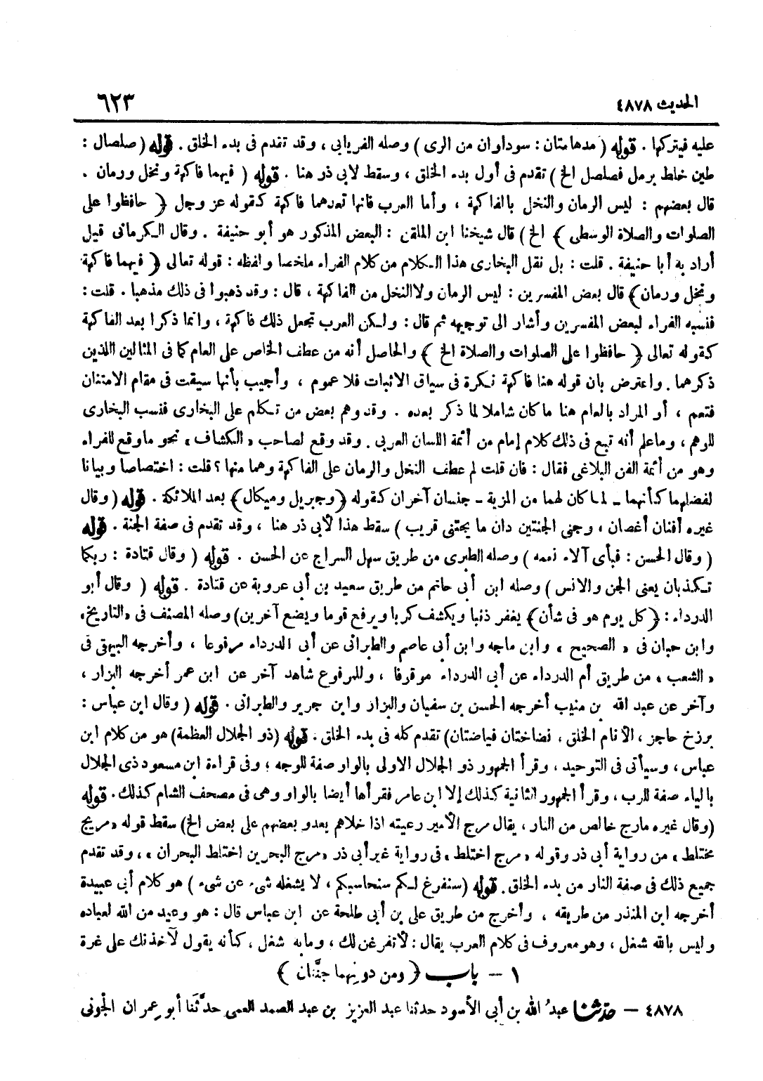 عَلَيْهِ فَيَتْرُكَهَا قَوْلُهُ مُدْهَامَّتَانِ سَوْدَاوَانِ مِنَ الرِّيِّ وَصَلَهُ الْفِرْيَابِيُّ وَقَدْ تَقَدَّمَ فِي بَدْءِ الْخَلْقِ قَوْلُهُ صَلْصَالٍ طِينٌ خُلِطَ بِرَمْلٍ فَصَلْصَلَ إِلَخْ تَقَدَّمَ فِي أَوَّلِ بَدْءِ الْخَلْقِ وَسَقَطَ لِأَبِي ذَرٍّ هُنَا قَوْلُهُ فِيهِمَا فَاكِهَةٌ وَنَخْلٌ وَرُمَّانٌ قَالَ بَعْضُهُمْ لَيْسَ الرُّمَّانُ وَالنَّخْلُ بِالْفَاكِهَةِ وَأَمَّا الْعَرَبُ فَإِنَّهَا تَعُدُّهُمَا فَاكِهَةً كَقَوْلِهِ عَزَّ وَجَلَّ حَافظُوا على الصَّلَوَات وَالصَّلَاة الْوُسْطَى الخ قَالَ شَيخنَا بن الْمُلَقِّنِ الْبَعْضُ الْمَذْكُورُ هُوَ أَبُو حَنِيفَةَ وَقَالَ الْكِرْمَانِيُّ قِيلَ أَرَادَ بِهِ أَبَا حَنِيفَةَ قُلْتُ بَلْ نَقَلَ الْبُخَارِيُّ هَذَا الْكَلَامَ مِنْ كَلَامِ الْفَرَّاءِ مُلَخَّصًا وَلَفْظُهُ قَوْلُهُ تَعَالَى فِيهِمَا فَاكِهَةٌ ونخل ورمان قَالَ بَعْضُ الْمُفَسِّرِينَ لَيْسَ الرُّمَّانُ وَلَا النَّخْلُ مِنَ الْفَاكِهَةِ قَالَ وَقَدْ ذَهَبُوا فِي ذَلِكَ مَذْهَبًا قُلْتُ فَنَسَبَهُ الْفَرَّاءُ لِبَعْضِ الْمُفَسِّرِينَ وَأَشَارَ إِلَى تَوْجِيهِهِ ثُمَّ قَالَ وَلَكِنَّ الْعَرَبَ تَجْعَلُ ذَلِكَ فَاكِهَةً وَإِنَّمَا ذُكِرَا بَعْدَ الْفَاكِهَةِ كَقَوْلِهِ تَعَالَى حَافظُوا على الصَّلَوَات وَالصَّلَاة إِلَخْ وَالْحَاصِلُ أَنَّهُ مِنْ عَطْفِ الْخَاصِّ عَلَى الْعَامِّ كَمَا فِي الْمِثَالَيْنِ اللَّذَيْنِ ذَكَرَهُمَا وَاعْتُرِضَ بِأَنَّ قَوْلَهُ هُنَا فَاكِهَةٌ نَكِرَةٌ فِي سِيَاقِ الْإِثْبَاتِ فَلَا عُمُومَ وَأُجِيبَ بِأَنَّهَا سِيقَتْ فِي مَقَامِ الِامْتِنَانِ فَتَعُمُّ أَوِ الْمُرَادُ بِالْعَامِّ هُنَا مَا كَانَ شَامِلًا لِمَا ذُكِرَ بَعْدَهُ وَقَدْ وَهِمَ بَعْضُ مَنْ تَكَلَّمَ عَلَى الْبُخَارِيِّ فَنَسَبَ الْبُخَارِيَّ لِلْوَهْمِ وَمَا عَلِمَ أَنَّهُ تَبِعَ فِي ذَلِكَ كَلَامَ إِمَامٍ مِنْ أَئِمَّةِ اللِّسَانِ الْعَرَبِيِّ وَقَدْ وَقَعَ لِصَاحِبِ الْكَشَّافِ نَحْوَ مَا وَقَعَ لِلْفَرَّاءِ وَهُوَ مِنْ أَئِمَّةِ الْفَنِّ الْبَلَاغِيِّ فَقَالَ فَإِنْ قُلْتَ لِمَ عَطَفَ النَّخْلَ وَالرُّمَّانَ عَلَى الْفَاكِهَةِ وَهُمَا مِنْهَا قُلْتُ اخْتِصَاصًا وَبَيَانًا لِفَضْلِهِمَا كَأَنَّهُمَا لَمَّا كَانَ لَهُمَا مِنَ الْمَزِيَّةِ جِنْسَانِ آخرَانِ كَقَوْلِه وَجِبْرِيل وميكال بَعْدَ الْمَلَائِكَةِ قَوْلُهُ وَقَالَ غَيْرُهُ أَفْنَانٍ أَغْصَانٍ وجنى الجنتين دَان مَا يُجْتَنَى قَرِيبٌ سَقَطَ هَذَا لِأَبِي ذَرٍّ هُنَا وَقَدْ تَقَدَّمَ فِي صِفَةِ الْجَنَّةِ قَوْلُهُ وَقَالَ الْحَسَنُ فَبِأَيِّ آلَاءِ نِعَمِهِ وَصَلَهُ الطَّبَرِيُّ مِنْ طَرِيقِ سَهْلٍ السَّرَّاجِ عَنِ الْحَسَنِ قَوْلُهُ وَقَالَ قَتَادَةُ رَبِّكُمَا تُكَذِّبَانِ يَعْنِي الْجِنَّ وَالْإِنْسَ وَصله بن أَبِي حَاتِمٍ مِنْ طَرِيقِ سَعِيدِ بْنِ أَبِي عَرُوبَةَ عَنْ قَتَادَةَ قَوْلُهُ وَقَالَ أَبُو الدَّرْدَاءِ كل يَوْم هُوَ فِي شَأْن يَغْفِرُ ذَنْبًا وَيَكْشِفُ كَرْبًا وَيَرْفَعُ قَوْمًا وَيَضَعُ آخَرين وَصله المُصَنّف فِي التَّارِيخ وبن حبَان فِي الصَّحِيح وبن ماجة وبن أَبِي عَاصِمٍ وَالطَّبَرَانِيُّ عَنْ أَبِي الدَّرْدَاءِ مَرْفُوعًا وَأَخْرَجَهُ الْبَيْهَقِيُّ فِي الشُّعَبِ مِنْ طَرِيقِ أُمِّ الدَّرْدَاءِ عَنْ أَبِي الدَّرْدَاءِ مَوْقُوفًا وَلِلْمَرْفُوعِ شَاهِدٌ آخر عَن بن عُمَرَ أَخْرَجَهُ الْبَزَّارُ وَآخَرُ عَنْ عَبْدِ اللَّهِ بْنِ مُنِيبٍ أَخْرَجَهُ الْحَسَنُ بْنُ سُفْيَانَ وَالْبَزَّارُ وبن جرير وَالطَّبَرَانِيّ قَوْله وَقَالَ بن عَبَّاسٍ بَرْزَخٌ حَاجِزٌ الْأَنَامُ الْخَلْقُ نَضَّاخَتَانِ فَيَّاضَتَانِ تَقَدَّمَ كُلُّهُ فِي بَدْءِ الْخَلْقِ قَوْلُهُ ذ