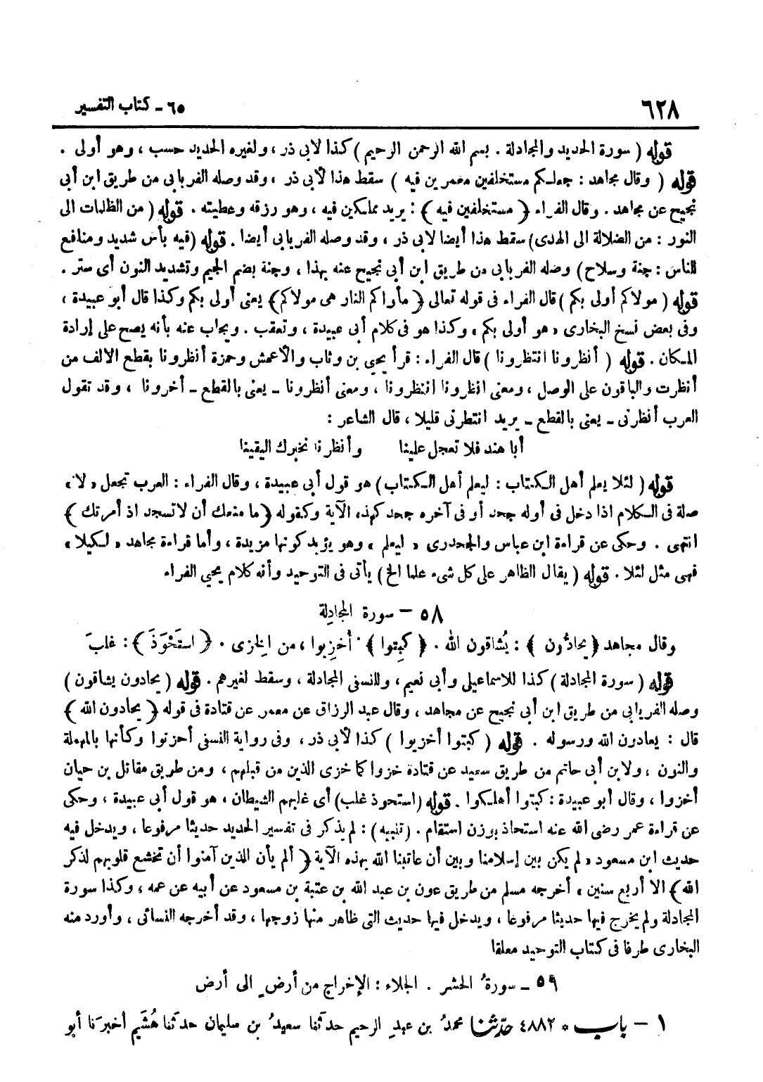 كَذَا لِأَبِي ذَرٍّ وَلِغَيْرِهِ الْحَدِيدِ حَسْبُ وَهُوَ أَوْلَى قَوْلُهُ وَقَالَ مُجَاهِدٌ جَعَلَكُمْ مُسْتَخْلَفِينَ مُعَمِّرِينَ فِيهِ سَقَطَ هَذَا لِأَبِي ذَرٍّ وَقَدْ وَصله الْفرْيَابِيّ من طَرِيق بن أَبِي نَجِيحٍ عَنْ مُجَاهِدٍ وَقَالَ الْفَرَّاءُ مُسْتَخْلَفِينَ فِيهِ يُرِيدُ مُمَلَّكِينَ فِيهِ وَهُوَ رِزْقُهُ وَعَطِيَّتُهُ قَوْلُهُ مِنَ الظُّلُمَاتِ إِلَى النُّورِ مِنَ الضَّلَالَةِ إِلَى الْهُدَى سَقَطَ هَذَا أَيْضًا لِأَبِي ذَرٍّ وَقَدْ وَصَلَهُ الْفِرْيَابِيُّ أَيْضًا قَوْلُهُ فِيهِ بَأْسٌ شَدِيدٌ وَمَنَافع للنَّاس جنَّة وَسلَاح وَصله الْفرْيَابِيّ من طَرِيق بن أَبِي نَجِيحٍ عَنْهُ بِهَذَا وَجُنَّةٌ بِضَمِّ الْجِيمِ وَتَشْدِيدِ النُّونِ أَيْ سِتْرٌ قَوْلُهُ مَوْلَاكُمْ أَوْلَى بِكُمْ قَالَ الْفَرَّاءُ فِي قَوْلِهِ تَعَالَى مَأْوَاكُمُ النَّار هِيَ مولاكم يَعْنِي أَوْلَى بِكُمْ وَكَذَا قَالَ أَبُو عُبَيْدَةَ وَفِي بَعْضِ نُسَخِ الْبُخَارِيِّ هُوَ أَوْلَى بِكُمْ وَكَذَا هُوَ فِي كَلَامِ أَبِي عُبَيْدَةَ وَتُعُقِّبَ وَيُجَابُ عَنْهُ بِأَنَّهُ يَصِحُّ عَلَى إِرَادَةِ الْمَكَانِ قَوْلُهُ انْظُرُونَا انْتَظِرُونَا قَالَ الْفَرَّاءُ قَرَأَ يَحْيَى بْنُ وَثَّابٍ وَالْأَعْمَشُ وَحَمْزَةُ أَنْظِرُونَا بِقَطْعِ الْأَلِفِ مِنْ أَنْظَرْتُ وَالْبَاقُونَ عَلَى الْوَصْلِ وَمَعْنَى انْظُرُونَا انْتَظِرُونَا وَمَعْنَى أَنْظِرُونَا يَعْنِي بِالْقَطْعِ أَخِّرُونَا وَقَدْ تَقُولُ الْعَرَبُ أَنْظِرْنِي يَعْنِي بِالْقَطْعِ يُرِيدُ انْتَظِرْنِي قَلِيلًا قَالَ الشَّاعِرُ أَبَا هِنْدٍ فَلَا تَعْجَلْ عَلَيْنَا وَأَنْظِرْنَا نُخَبِّرْكَ الْيَقِينَا قَوْلُهُ لِئَلَّا يَعْلَمَ أهل الْكتاب لِيَعْلَمَ أَهْلُ الْكِتَابِ هُوَ قَوْلُ أَبِي عُبَيْدَةَ وَقَالَ الْفَرَّاءُ الْعَرَبُ تَجْعَلُ لَا صِلَةً فِي الْكَلَامِ إِذَا دَخَلَ فِي أَوَّلِهِ جَحْدٌ أَوْ فِي آخِره جحد كهذه الْآيَة وَكَقَوْلِه مَا مَنعك أَن لَا تسْجد إِذْ أَمرتك انْتهى وَحكى عَن قِرَاءَة بن عَبَّاسٍ وَالْجَحْدَرِيِّ لِيَعْلَمَ وَهُوَ يُؤَيِّدُ كَوْنَهَا مَزِيدَةً وَأَمَّا قِرَاءَةُ مُجَاهِدٍ لِكَيْلَا فَهِيَ مِثْلُ لِئَلَّا قَوْلُهُ يُقَالُ الظَّاهِرُ عَلَى كُلِّ شَيْءٍ عِلْمًا إِلَخْ يَأْتِي فِي التَّوْحِيدِ وَأَنَّهُ كَلَامُ يَحْيَى الْفراء قَوْلُهُ سُورَةُ الْمُجَادَلَةِ كَذَا لِلْإِسْمَاعِيلِيِّ وَأَبِي نُعَيْمٍ وَلِلنَّسَفِيِّ الْمُجَادَلَةِ وَسَقَطَ لِغَيْرِهِمْ قَوْلُهُ يُحَادُّونَ يُشَاقُّونَ وَصله الْفرْيَابِيّ من طَرِيق بن أَبِي نَجِيحٍ عَنْ مُجَاهِدٍ وَقَالَ عَبْدُ الرَّزَّاقِ عَنْ مَعْمَرٍ عَنْ قَتَادَةَ فِي قَوْلِهِ يُحَادُّونَ الله قَالَ يُعَادُونَ اللَّهَ وَرَسُولَهُ قَوْلُهُ كُبِتُوا أُخْزِيُوا كَذَا لِأَبِي ذَرٍّ وَفِي رِوَايَةِ النَّسَفِيِّ أُحْزِنُوا وَكَأَنَّهَا بِالْمُهْمَلَةِ وَالنُّونِ وَلِابْنِ أَبِي حَاتِمٍ مِنْ طَرِيقِ سَعِيدٍ عَنْ قَتَادَةَ خُزُوا كَمَا خُزِيَ الَّذِينَ مِنْ قَبْلِهِمْ وَمِنْ طَرِيقِ مُقَاتِلِ بْنِ حَيَّانَ أُخْزُوا وَقَالَ أَبُو عُبَيْدَةَ كُبِتُوا أُهْلِكُوا قَوْلُهُ اسْتَحْوَذَ غَلَبَ أَيْ غَلَبَهُمُ الشَّيْطَانُ هُوَ قَوْلُ أَبِي عُبَيْدَةَ وَحُكِيَ عَنْ قِرَاءَةِ عُمَرَ رَضِيَ اللَّهُ عَنْهُ اسْتَحَاذَ بِوَزْنِ اسْتَقَامَ تَنْبِيهٌ لَمْ يَذْكُرْ فِي تَفْسِيرِ الْحَدِيدِ حَدِيثًا مَرْفُوعًا وَيدخل فِيهِ حَدِيث بن مَسْعُودٍ لَمْ يَكُنْ بَيْنَ إِسْلَامِنَا وَبَيْنَ أَنْ عَاتَبَنَا اللَّهُ بِهَذِهِ الْآيَةِ أَلَمْ يَأْنِ لِلَّذِينَ آمنُوا أَن تخشع قُلُوبهم لذكر الله إِلَّا أَرْبَعُ سِنِينَ أَخْرَجَهُ مُسْلِمٌ مِنْ طَرِيقِ عَوْنِ بْنُ عَبْدِ اللَّه