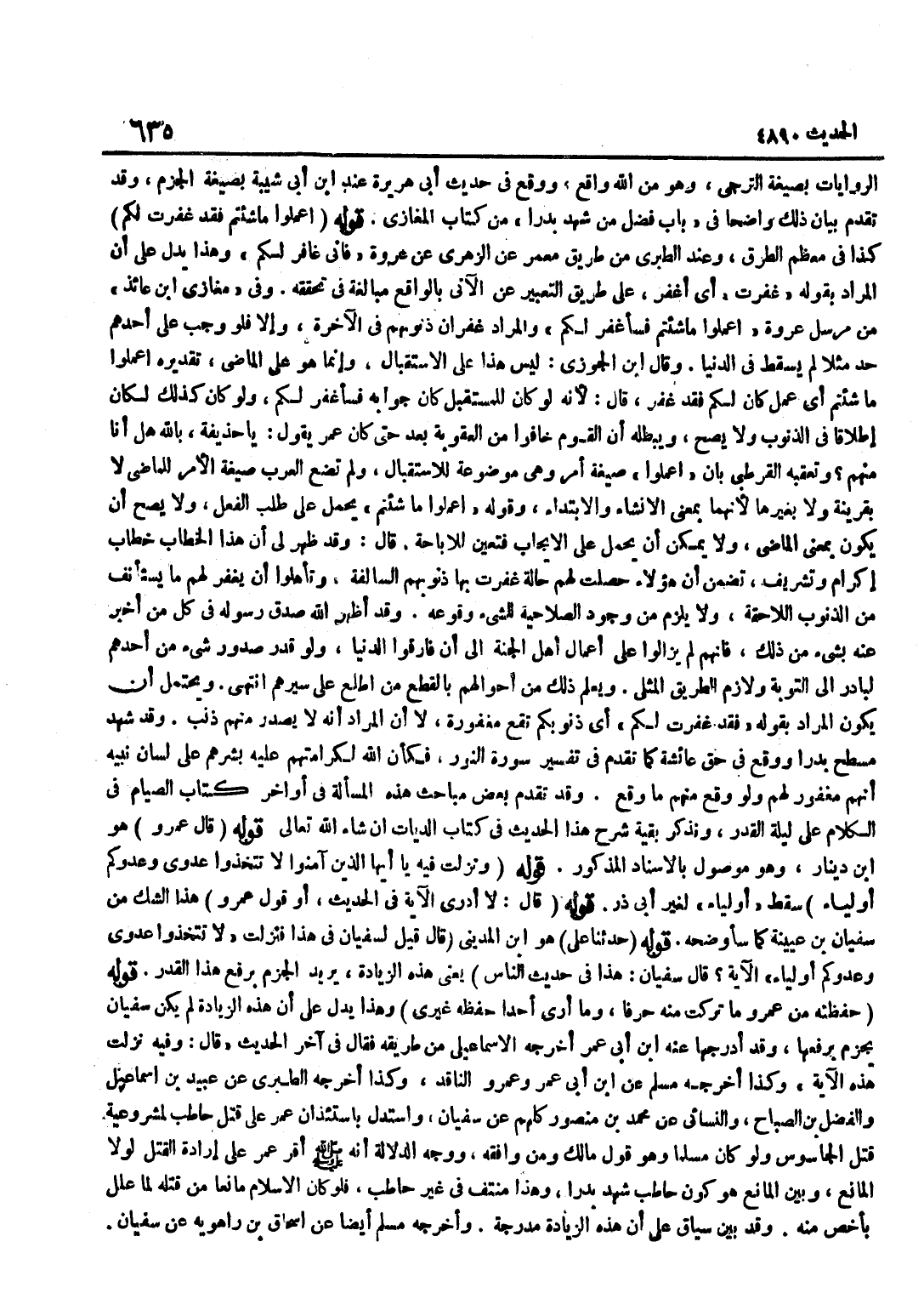 الرِّوَايَاتِ بِصِيغَةِ التَّرَجِّي وَهُوَ مِنَ اللَّهِ وَاقِعٌ وَوَقع فِي حَدِيث أبي هُرَيْرَة عِنْد بن أَبِي شَيْبَةَ بِصِيغَةِ الْجَزْمِ وَقَدْ تَقَدَّمَ بَيَانُ ذَلِكَ وَاضِحًا فِي بَابِ فَضْلِ مَنْ شَهِدَ بَدْرًا مِنْ كِتَابِ الْمَغَازِي قَوْلُهُ اعْمَلُوا مَا شِئْتُمْ فَقَدْ غَفَرْتُ لَكُمْ كَذَا فِي مُعْظَمِ الطُّرُقِ وَعِنْدَ الطَّبَرِيِّ مِنْ طَرِيقِ مَعْمَرٍ عَنِ الزُّهْرِيِّ عَنْ عُرْوَةَ فَإِنِّي غَافِرٌ لَكُمْ وَهَذَا يَدُلُّ عَلَى أَنَّ الْمُرَادَ بِقَوْلِهِ غَفَرْتُ أَيْ أَغْفِرُ عَلَى طَرِيقِ التَّعْبِيرِ عَنِ الْآتِي بِالْوَاقِعِ مُبَالغَة فِي تحَققه وَفِي مغازي بن عَائِذٍ مِنْ مُرْسَلِ عُرْوَةَ اعْمَلُوا مَا شِئْتُمْ فَسَأَغْفِرُ لَكُمْ وَالْمُرَادُ غُفْرَانُ ذُنُوبِهِمْ فِي الْآخِرَةِ وَإِلَّا فَلَوْ وَجَبَ عَلَى أَحَدِهِمْ حَدٌّ مَثَلًا لم يسْقط فِي الدُّنْيَا وَقَالَ بن الْجَوْزِيِّ لَيْسَ هَذَا عَلَى الِاسْتِقْبَالِ وَإِنَّمَا هُوَ عَلَى الْمَاضِي تَقْدِيرُهُ اعْمَلُوا مَا شِئْتُمْ أَيَّ عَمَلٍ كَانَ لَكُمْ فَقَدْ غُفِرَ قَالَ لِأَنَّهُ لَوْ كَانَ لِلْمُسْتَقْبَلِ كَانَ جَوَابُهُ فَسَأَغْفِرُ لَكُمْ وَلَوْ كَانَ كَذَلِكَ لَكَانَ إِطْلَاقًا فِي الذُّنُوبِ وَلَا يَصِحُّ وَيُبْطِلُهُ أَنَّ الْقَوْمَ خَافُوا مِنَ الْعُقُوبَةِ بَعْدُ حَتَّى كَانَ عُمَرُ يَقُولُ يَا حُذَيْفَةُ بِاللَّهِ هَلْ أَنَا مِنْهُمْ وَتَعَقَّبَهُ الْقُرْطُبِيُّ بِأَنَّ اعْمَلُوا صِيغَةُ أَمْرٍ وَهِيَ مَوْضُوعَةٌ لِلِاسْتِقْبَالِ وَلَمْ تَضَعِ الْعَرَبُ صِيغَةَ الْأَمْرِ لِلْمَاضِي لَا بِقَرِينَةٍ وَلَا بِغَيْرِهَا لِأَنَّهُمَا بِمَعْنَى الْإِنْشَاءِ وَالِابْتِدَاءِ وَقَوْلُهُ اعْمَلُوا مَا شِئْتُمْ يُحْمَلُ عَلَى طَلَبِ الْفِعْلِ وَلَا يَصِحُّ أَنْ يَكُونَ بِمَعْنَى الْمَاضِي وَلَا يُمْكِنُ أَنْ يُحْمَلَ عَلَى الْإِيجَابِ فَتَعَيَّنَ لِلْإِبَاحَةِ قَالَ وَقَدْ ظَهَرَ لِي أَنَّ هَذَا الْخِطَابَ خِطَابُ إِكْرَامٍ وَتَشْرِيفٍ تَضَمَّنَ أَنَّ هَؤُلَاءِ حَصَلَتْ لَهُمْ حَالَةٌ غُفِرَتْ بِهَا ذُنُوبُهُمُ السَّالِفَةُ وَتَأَهَّلُوا أَنْ يُغْفَرَ لَهُمْ مَا يُسْتَأْنَفُ مِنَ الذُّنُوبِ اللَّاحِقَةِ وَلَا يَلْزَمُ مِنْ وُجُودِ الصَّلَاحِيَّةِ لِلشَّيْءِ وُقُوعُهُ وَقَدْ أَظْهَرَ اللَّهُ صِدْقَ رَسُولِهِ فِي كُلِّ مَنْ أَخْبَرَ عَنْهُ بِشَيْءٍ مِنْ ذَلِكَ فَإِنَّهُمْ لَمْ يَزَالُوا عَلَى أَعْمَالِ أَهْلِ الْجَنَّةِ إِلَى أَنْ فَارَقُوا الدُّنْيَا وَلَوْ قُدِّرَ صُدُورُ شَيْءٍ مِنْ أَحَدِهِمْ لَبَادَرَ إِلَى التَّوْبَةِ وَلَازَمَ الطَّرِيقَ الْمُثْلَى وَيَعْلَمُ ذَلِكَ مِنْ أَحْوَالِهِمْ بِالْقَطْعِ مَنِ اطَّلَعَ عَلَى سِيَرِهِمُ انْتَهَى وَيَحْتَمِلُ أَنْ يَكُونَ الْمُرَادُ بِقَوْلِهِ فَقَدْ غَفَرْتُ لَكُمْ أَيْ ذُنُوبُكُمْ تَقَعُ مَغْفُورَةً لَا أَنَّ الْمُرَادَ أَنَّهُ لَا يَصْدُرُ مِنْهُمْ ذَنْبٌ وَقَدْ شَهِدَ مِسْطَحٌ بَدْرًا وَوَقَعَ فِي حَقِّ عَائِشَةَ كَمَا تَقَدَّمَ فِي تَفْسِيرِ سُورَةِ النُّورِ فَكَأَنَّ اللَّهَ لِكَرَامَتِهِمْ عَلَيْهِ بَشَّرَهُمْ عَلَى لِسَانِ نَبِيِّهِ أَنَّهُمْ مَغْفُورٌ لَهُمْ وَلَوْ وَقَعَ مِنْهُمْ مَا وَقَعَ وَقَدْ تَقَدَّمَ بَعْضُ مَبَاحِثِ هَذِهِ الْمَسْأَلَةِ فِي أَوَاخِرِ كِتَابِ الصِّيَامِ فِي الْكَلَامِ عَلَى لَيْلَةِ الْقَدْرِ وَنَذْكُرُ بَقِيَّةَ شَرْحِ هَذَا الْحَدِيثِ فِي كِتَابِ الدِّيَاتِ إِنْ شَاءَ اللَّهُ تَعَالَى قَوْلُهُ قَالَ عَمْرُو هُوَ بن دِينَارٍ وَهُوَ مَوْصُولٌ بِالْإِسْنَادِ الْمَذْكُورِ قَوْلُهُ وَنَزَلَتْ فِيهِ يَا أَيُّهَا الَّذِينَ آمَنُوا لَا تَتَّخِذُوا عَدُوِّي وَعَدُوكُمْ أَوْلِيَاء سَقَطَ 