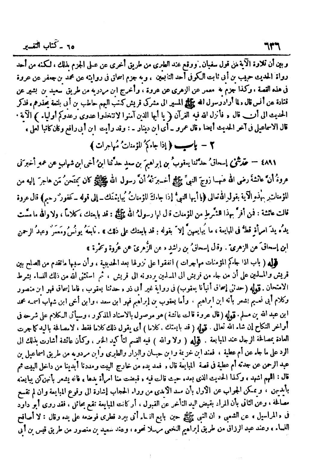 [4891] قَوْلُهُ حَدَّثَنِي إِسْحَاقُ أَنْبَأَنَا يَعْقُوبُ فِي رِوَايَةِ غَيْرِ أَبِي ذَر حَدثنَا يَعْقُوب فَأَما إِسْحَاق فَهُوَ بن مَنْصُور وَكَلَام أبي نعيم يشْعر بِأَنَّهُ بن إِبْرَاهِيم وَأما يَعْقُوب بن إِبْرَاهِيم فَهُوَ بن سعد وبن أخي بن شِهَابٍ اسْمُهُ مُحَمَّدُ بْنُ عَبْدِ اللَّهِ بْنِ مُسْلِمٍ قَوْلُهُ قَالَ عُرْوَةُ قَالَتْ عَائِشَةُ هُوَ مَوْصُولٌ بِالْإِسْنَادِ الْمَذْكُورِ وَسَيَأْتِي الْكَلَامُ عَلَى شَرْحِهِ فِي أَوَاخِرِ النِّكَاحِ إِنْ شَاءَ اللَّهُ تَعَالَى قَوْلُهُ قَدْ بَايَعْتُكِ كَلَامًا أَيْ يَقُولُ ذَلِكَ كَلَامًا فَقَطْ لَا مُصَافَحَةً بِالْيَدِ كَمَا جَرَتِ الْعَادَةُ بِمُصَافَحَةِ الرِّجَالِ عِنْدَ الْمُبَايَعَةِ قَوْلُهُ وَلَا وَاللَّهِ فِيهِ الْقَسَمُ لِتَأْكِيدِ الْخَبَرِ وَكَأَنَّ عَائِشَةَ أَشَارَتْ بِذَلِكَ إِلَى الرَّدِّ عَلَى مَا جَاءَ عَن أم عَطِيَّة فَعِنْدَ بن خُزَيْمَة وبن حبَان وَالْبَزَّار والطبري وبن مَرْدَوَيْهِ مِنْ طَرِيقِ إِسْمَاعِيلَ بْنِ عَبْدِ الرَّحْمَنِ عَنْ جَدَّتِهِ أُمِّ عَطِيَّةَ فِي قِصَّةِ الْمُبَايَعَةِ قَالَ فَمَدَّ يَدَهُ مِنْ خَارِجِ الْبَيْتِ وَمَدَدْنَا أَيْدِينَا مِنْ دَاخِلِ الْبَيْتِ ثُمَّ قَالَ اللَّهُمَّ أشهد وَكَذَا الحَدِيث الَّذِي بعده حَيْثُ قَالَت فِيهِ قَبَضَتْ مِنَّا امْرَأَةٌ يَدَهَا فَإِنَّهُ يُشْعِرُ بِأَنَّهُنَّ كُنَّ يُبَايِعْنَهُ بِأَيْدِيهِنَّ وَيُمْكِنُ الْجَوَابُ عَنِ الْأَوَّلِ بِأَنَّ مَدَّ الْأَيْدِي مِنْ وَرَاءِ الْحِجَابِ إِشَارَةٌ إِلَى وُقُوعِ الْمُبَايَعَةِ وَإِنْ لَمْ تَقَعْ مُصَافَحَةٌ وَعَنِ الثَّانِي بِأَنَّ الْمُرَادَ بِقَبْضِ الْيَدِ التَّأَخُّرَ عَنِ الْقَبُولِ أَوْ كَانَتِ الْمُبَايَعَةُ تَقَعُ بِحَائِلٍ فَقَدْ رَوَى أَبُو دَاوُدَ فِي الْمَرَاسِيلِ عَنِ الشَّعْبِيِّ أَنَّ النَّبِيَّ صَلَّى اللَّهُ عَلَيْهِ وَسَلَّمَ حِينَ بَايَعَ النِّسَاءَ أَتَى بِبُرْدٍ قِطْرِيٍّ فَوَضَعَهُ عَلَى يَدِهِ وَقَالَ لَا أُصَافِحُ النِّسَاءَ وَعِنْدَ عَبْدِ الرَّزَّاقِ مِنْ طَرِيقِ إِبْرَاهِيمَ النَّخَعِيِّ مُرْسَلًا نَحْوُهُ وَعِنْدَ سَعِيدُ بْنُ مَنْصُورٍ مِنْ طَرِيقِ قَيْسِ بْنِ أَبِي