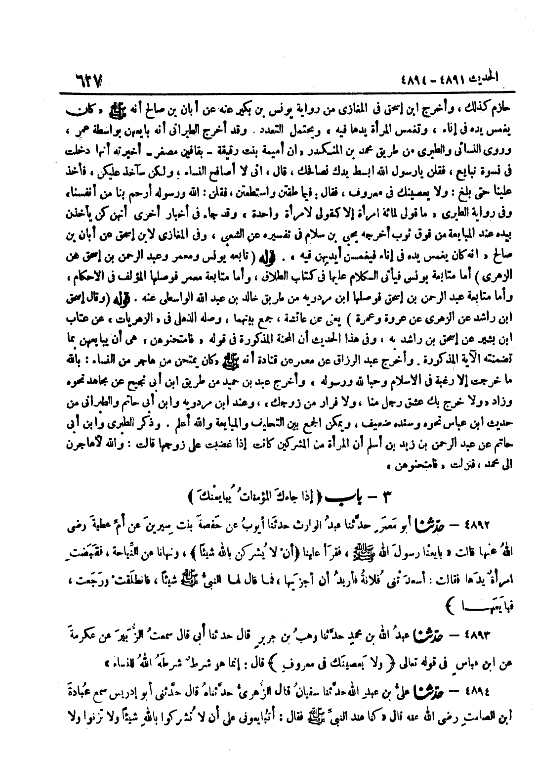 حَازِم كَذَلِك وَأخرج بن إِسْحَاقَ فِي الْمَغَازِي مِنْ رِوَايَةِ يُونُسَ بْنِ بُكَيْرٍ عَنْهُ عَنْ أَبَانَ بْنِ صَالِحٍ أَنَّهُ صَلَّى اللَّهُ عَلَيْهِ وَسَلَّمَ كَانَ يَغْمِسُ يَدَهُ فِي إِنَاءٍ وَتَغْمِسُ الْمَرْأَةُ يَدَهَا فِيهِ وَيَحْتَمِلُ التَّعَدُّدَ وَقَدْ أَخْرَجَ الطَّبَرَانِيُّ أَنَّهُ بَايَعَهُنَّ بِوَاسِطَةِ عُمَرَ وَرَوَى النَّسَائِيُّ وَالطَّبَرِيُّ مِنْ طَرِيقِ مُحَمَّدِ بْنِ الْمُنْكَدِرِ أَنَّ أُمَيْمَةَ بِنْتَ رُقَيْقَةَ بِقَافَيْنِ مُصَغَّرٌ أَخْبَرَتْهُ أَنَّهَا دَخَلَتْ فِي نِسْوَةٍ تُبَايِعُ فَقُلْنَ يَا رَسُولَ اللَّهِ ابْسُطْ يَدَكَ نُصَافِحْكَ قَالَ إِنِّي لَا أُصَافِحُ النِّسَاءَ وَلَكِنْ سَآخُذُ عَلَيْكُنَّ فَأَخَذَ عَلَيْنَا حَتَّى بَلَغَ وَلَا يَعْصِينَكَ فِي مَعْرُوف فَقَالَ فِيمَا طُقْتُنَّ وَاسْتَطَعْتُنَّ فَقُلْنَ اللَّهُ وَرَسُولُهُ أَرْحَمُ بِنَا مِنْ أَنْفُسِنَا وَفِي رِوَايَةِ الطَّبَرِيِّ مَا قَوْلِي لِمِائَةِ امْرَأَةٍ إِلَّا كَقَوْلِي لِامْرَأَةٍ وَاحِدَةٍ وَقَدْ جَاءَ فِي أَخْبَارٍ أُخْرَى أَنَّهُنَّ كُنَّ يَأْخُذْنَ بِيَدِهِ عِنْدَ الْمُبَايَعَةِ مِنْ فَوْقِ ثَوْبٍ أَخْرَجَهُ يَحْيَى بْنُ سَلَّامٍ فِي تَفْسِيرِهِ عَنِ الشَّعْبِيِّ وَفِي الْمَغَازِي لِابْنِ إِسْحَاقَ عَنْ أَبَانَ بْنِ صَالِحٍ أَنَّهُ كَانَ يَغْمِسُ يَدَهُ فِي إِنَاءٍ فَيَغْمِسْنَ أَيْدِيَهُنَّ فِيهِ قَوْلُهُ تَابَعَهُ يُونُسُ وَمَعْمَرٌ وَعَبْدُ الرَّحْمَنِ بْنُ إِسْحَاقَ عَنِ الزُّهْرِيِّ أَمَّا مُتَابَعَةُ يُونُسَ فَيَأْتِي الْكَلَامُ عَلَيْهَا فِي كِتَابِ الطَّلَاقِ وَأَمَّا مُتَابَعَةُ مَعْمَرٍ فَوَصَلَهَا الْمُؤلف فِي الْأَحْكَام وَأما مُتَابعَة عبد الرَّحْمَن بن إِسْحَاق فوصلها بن مَرْدَوَيْهِ مِنْ طَرِيقِ خَالِدِ بْنِ عَبْدِ اللَّهِ الْوَاسِطِيِّ عَنْهُ قَوْلُهُ وَقَالَ إِسْحَاقُ بْنُ رَاشِدٍ عَنِ الزُّهْرِيِّ عَنْ عُرْوَةَ وَعَمْرَةَ يَعْنِي عَنْ عَائِشَةَ جَمَعَ بَيْنَهُمَا وَصَلَهُ الذُّهْلِيُّ فِي الزُّهْرِيَّاتِ عَنْ عَتَّابِ بْنِ بَشِيرٍ عَنْ إِسْحَاقَ بْنِ رَاشِدٍ بِهِ وَفِي هَذَا الْحَدِيثِ أَنَّ الْمِحْنَةَ الْمَذْكُورَةَ فِي قَوْلِهِ فَامْتَحِنُوهُنَّ هِيَ أَنْ يُبَايِعَهُنَّ بِمَا تَضَمَّنَتْهُ الْآيَةُ الْمَذْكُورَةُ وَأَخْرَجَ عَبْدُ الرَّزَّاقِ عَنْ مَعْمَرٍ عَنْ قَتَادَةَ أَنَّهُ صَلَّى اللَّهُ عَلَيْهِ وَسَلَّمَ كَانَ يَمْتَحِنُ مَنْ هَاجَرَ مِنَ النِّسَاءِ بِاللَّهِ مَا خَرَجَتْ إِلَّا رَغْبَةً فِي الْإِسْلَامِ وَحُبًّا لِلَّهِ وَرَسُولِهِ وَأَخْرَجَ عَبْدُ بْنُ حميد من طَرِيق بن أَبِي نَجِيحٍ عَنْ مُجَاهِدٍ نَحْوَهُ وَزَادَ وَلَا خَرَجَ بِكِ عِشْقُ رَجُلٍ مِنَّا وَلَا فِرَارٌ من زَوجك وَعند بن مرْدَوَيْه وبن أبي حَاتِم وَالطَّبَرَانِيّ من حَدِيث بن عَبَّاسٍ نَحْوُهُ وَسَنَدُهُ ضَعِيفٌ وَيُمْكِنُ الْجَمْعُ بَيْنَ التَّحْلِيف والمبايعة وَالله أعلم وَذكر الطَّبَرِيّ وبن أَبِي حَاتِمٍ عَنْ عَبْدِ الرَّحْمَنِ بْنِ زَيْدِ بْنِ أَسْلَمَ أَنَّ الْمَرْأَةَ مِنَ الْمُشْرِكِينَ كَانَتْ إِذَا غَضِبَتْ عَلَى زَوْجِهَا قَالَتْ وَاللَّهِ لَأُهَاجِرَنَّ إِلَى مُحَمَّد فَنزلت فامتحنوهن
