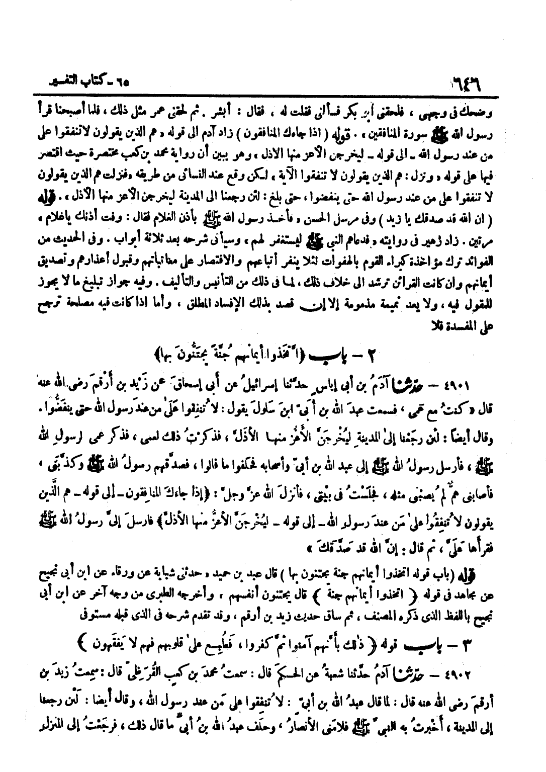 وَضَحِكَ فِي وَجْهِي فَلَحِقَنِي أَبُو بَكْرٍ فَسَأَلَنِي فَقُلْتُ لَهُ فَقَالَ أَبْشِرْ ثُمَّ لَحِقَنِي عُمَرُ مِثْلَ ذَلِكَ فَلَمَّا أَصْبَحْنَا قَرَأَ رَسُولُ اللَّهِ صَلَّى اللَّهُ عَلَيْهِ وَسَلَّمَ سُورَةَ الْمُنَافِقِينَ قَوْلُهُ إِذا جَاءَك المُنَافِقُونَ زَادَ آدَمُ إِلَى قَوْلِهِ هُمُ الَّذِينَ يَقُولُونَ لَا تُنْفِقُوا عَلَى مَنْ عِنْدَ رَسُولِ اللَّهِ إِلَى قَوْله ليخرجن الْأَعَز مِنْهَا الْأَذَل وَهُوَ يُبَيِّنُ أَنَّ رِوَايَةَ مُحَمَّدِ بْنِ كَعْبٍ مُخْتَصَرَةٌ حَيْثُ اقْتَصَرَ فِيهَا عَلَى قَوْلِهِ وَنَزَلَ هم الَّذين يَقُولُونَ لَا تنفقوا الْآيَةَ لَكِنْ وَقَعَ عِنْدَ النَّسَائِيِّ مِنْ طَرِيقِهِ فَنَزَلَتْ هُمُ الَّذِينَ يَقُولُونَ لَا تُنْفِقُوا عَلَى مَنْ عِنْدَ رَسُولِ اللَّهِ حَتَّى يَنْفضوا حَتَّى بَلَغَ لَئِنْ رَجَعْنَا إِلَى الْمَدِينَةِ لَيُخْرِجَنَّ الْأَعَز مِنْهَا الْأَذَل قَوْلُهُ إِنَّ اللَّهَ قَدْ صَدَّقَكَ يَا زَيْدُ وَفِي مُرْسَلِ الْحَسَنِ فَأَخَذَ رَسُولُ اللَّهِ صَلَّى اللَّهُ عَلَيْهِ وَسَلَّمَ بِأُذُنِ الْغُلَامِ فَقَالَ وَفَتْ أُذُنُكَ يَا غُلَامُ مَرَّتَيْنِ زَادَ زُهَيْرٌ فِي رِوَايَتِهِ فَدَعَاهُمُ النَّبِيُّ صَلَّى اللَّهُ عَلَيْهِ وَسَلَّمَ لِيَسْتَغْفِرَ لَهُمْ وَسَيَأْتِي شَرْحُهُ بَعْدَ ثَلَاثَةِ أَبْوَابٍ وَفِي الْحَدِيثِ مِنَ الْفَوَائِدِ تَرْكُ مُؤَاخَذَةِ كُبَرَاءِ الْقَوْمِ بِالْهَفَوَاتِ لِئَلَّا يَنْفِرَ أَتْبَاعُهُمْ وَالِاقْتِصَارُ عَلَى مُعَاتَبَاتِهِمْ وَقَبُولِ أَعْذَارِهِمْ وَتَصْدِيقِ أَيْمَانِهِمْ وَإِنْ كَانَتِ الْقَرَائِنُ تُرْشِدُ إِلَى خِلَافِ ذَلِكَ لِمَا فِي ذَلِكَ مِنَ التَّأْنِيسِ وَالتَّأْلِيفِ وَفِيهِ جَوَازُ تَبْلِيغِ مَا لَا يَجُوزُ لِلْمَقُولِ فِيهِ وَلَا يُعَدُّ نَمِيمَةً مَذْمُومَةً إِلَّا إِنْ قَصَدَ بِذَلِكَ الْإِفْسَادَ الْمُطْلَقَ وَأَمَّا إِذَا كَانَتْ فِيهِ مَصْلَحَةٌ تُرَجَّحُ على الْمفْسدَة فَلَا