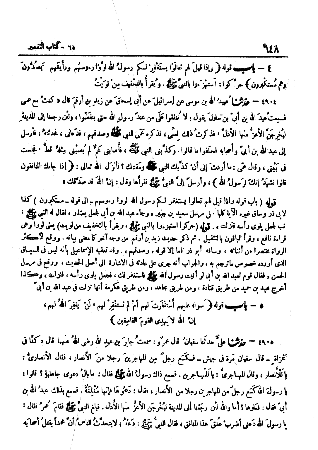 [4904] قَوْلَهُ وَصَدَّقَهُمْ وَقَدْ تَعَقَّبَهُ الْإِسْمَاعِيلِيُّ بِأَنَّهُ لَيْسَ فِي السِّيَاقِ الَّذِي أَوْرَدَهُ خُصُوصُ مَا تَرْجَمَ بِهِ وَالْجَوَابُ أَنَّهُ جَرَى عَلَى عَادَتِهِ فِي الْإِشَارَةِ إِلَى أَصْلِ الْحَدِيثِ وَوَقَعَ فِي مُرْسَلِ الْحَسَنِ فَقَالَ قَوْمٌ لِعَبْدِ اللَّهِ بْنِ أُبَيٍّ لَوْ أَتَيْتُ رَسُولَ اللَّهِ صَلَّى اللَّهُ عَلَيْهِ وَسَلَّمَ فَاسْتَغْفَرَ لَكَ فَجَعَلَ يَلْوِي رَأْسَهُ فَنَزَلَتْ وَكَذَا أَخْرَجَ عَبْدُ بْنُ حُمَيْدٍ مِنْ طَرِيقِ قَتَادَة وَمن طَرِيقِ مُجَاهِدٍ وَمِنْ طَرِيقِ عِكْرِمَةَ أَنَّهَا نَزَلَتْ فِي عَبْدِ اللَّهِ بْنِ أُبَيٍّ